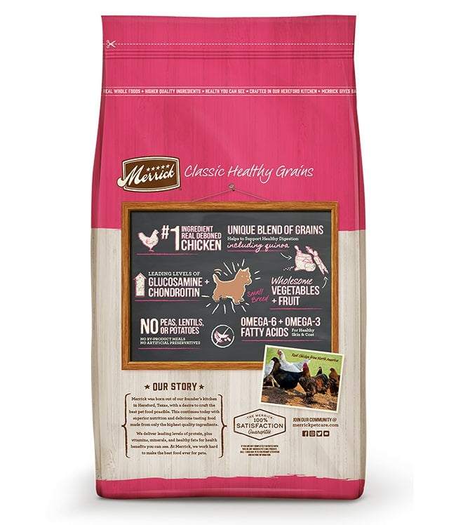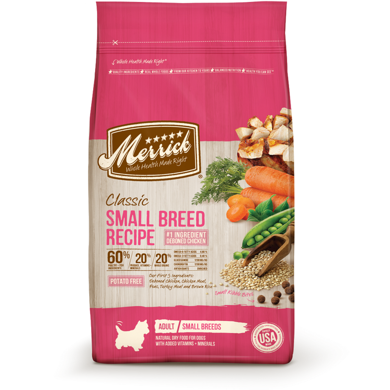 Shop / Dry Food / Merrick Classic Small Breed Recipe Dry Dog Food Merrick Classic Small Breed Recipe Dry Dog Food Merrick Weight: 4 lb $23.99 4-lb Purchase Options Free In-Store Pick Up Not Available Save 10% on orders $49+ Set your store for inventory and store pickup details Zip Code Search Same-day Delivery* No minimum charge for delivery orders. *Order before 2pm and have it delivered today. Orders placed after 2pm will be delivered the next day. Must be inside delivery radius. Zip Code Unfortunately delivery is not available to this address. In order to ensure the best availability accuracy, changing your selected store will remove all items from your cart. You will need to re-add these items with your newly selected store if you choose to continue. Continue Cancel Ship it to Me Quantity Add To Cart Feeding guide disclaimer ✕ Feeding guides provide a starting point for the amount of food to give your pet each day. We recommend that you keep your pet in ideal body condition and not allow them to become overweight. The amount of food your pet needs can vary based on age, activity level or other food and treats given, so be sure to work with your veterinarian to determine an appropriate weight for your pet, and to make any necessary adjustments to their feeding. Information Merrick Classic Small Breed Recipe Dry Dog Food provides natural nutrition from a wholesome balance of protein, whole grains, fruits, and vegetables all in a smaller kibble size perfect for the pint sized pals in your life! Merrick Classic Small Breed Recipe Dry Dog Food starts with real, farm fresh deboned chicken for high quality protein. Fresh produce and a healthy blend of whole grains including oatmeal and ancient grains like quinoa, while high levels of Omega 6 and Omega 3 fatty acids aid in a healthy skin and coat, accompanied with glucosamine and chondroitin to support healthy joints and hipsWhy We Love It Gain and potato free with no artificial colors, flavors, or preservatives Smaller kibble packed with all the nutrition and protein your pup needs! About Merrick Merrick isn't your typical pet food company, and Merrick doesn't just make pet food. Merrick makes the best food ever for the best pet ever. Yours. The five star promise from Merrick is what's guaranteed to each and every dog and cat, along with their owners. Local growers, real whole foods, their own kitchen, balanced nutrition, and health you can see. Merrick creates real, wholesome recipes using USDA-inspected deboned meat and fresh produce for industry leading levels of protein, glucosamine and chondroitin. All of Merrick's foods are handcrafted in Hereford, Texas from USA farmers they know and trust. With no additives, sweeteners, colors or preservatives, real whole foods including high quality meats and fresh caught fish are the core of every Merrick dog and cat food. Merrick has been cooking their own foods in their own Texas kitchen for over 25 years. They stand behind their products with a 100% guarantee, promising that your dog or cat will be happier and healthier. You are what you eat, so why not feed your best friend the very best? Ingredients Deboned Chicken, Chicken Meal, Peas, Turkey Meal, Brown Rice, Barley, Chicken Fat (preserved with mixed tocopherols), Oatmeal, Natural Flavor, Quinoa, Salmon Meal, Chicken LIver, Carrots, Apples, Flaxseed Oil (source of Omega-3 fatty acids), Blueberries, Chia Seed, Organic Dried Alfalfa Meal, Salt, Choline Chloride, Minerals (Iron Amino Acid Complex, Zinc Amino Acid Complex, Zinc Sulfate, Sodium Selenite, Manganese Amino Acid Complex, Copper Amino Acid Complex, Potassium Iodide, Cobalt Proteinate, Cobalt Carbonate), Yucca Schidigera Extract, Vitamins (Vitamin E Supplement, Vitamin B12 Supplement, Vitamin A Acetate, d-Calcium Pantothenate, Thiamine Mononitrate, Niacin, Riboflavin Supplement, Biotin, Vitamin D3 Supplement, Folic Acid, Pyridoxine Hydrochloride), Dried Lactobacillus plantarum Fermentation Product, Dried Lactobacillus casei Fermentation Product, Dried Enterococcus faecium Fermentation Product, Dried Lactobacillus acidophilus Fermentation Product. Guaranteed Analysis Nutrient Guaranteed Units Crude Protein 30.0% min Crude Fat 15.0% min Crude Fiber 3.5% max Moisture 11.0% max Omega-6 Fatty Acids 4.8% min Omega-3 Fatty Acids 0.4% min Glucosamine 1,200 mg/kg min Chondroitin Sulfate 1,200 mg/kg min Customers also liked Customer Reviews