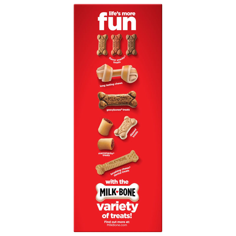 Make your dog's life more fun by turning up the flavor. Milk-Bone Flavor Snacks dog biscuits feature the same vitamin-fortified goodness of Milk-Bone Original dog snacks in 5 delicious flavors your dog will love: beef, turkey, chicken, bacon and sausage. These tasty dog treats are baked with love in Buffalo, New York, USA, for wholesome goodness you can feel good about. Better yet, the crunchy texture of Milk-Bone dog biscuits helps freshen dogs? breath and reduce tartar build-up, which means you can fully enjoy all those sloppy doggie kisses your dog will dole out to thank you. Order now to give your dog the simple, genuine joy that your dog gives you every day.