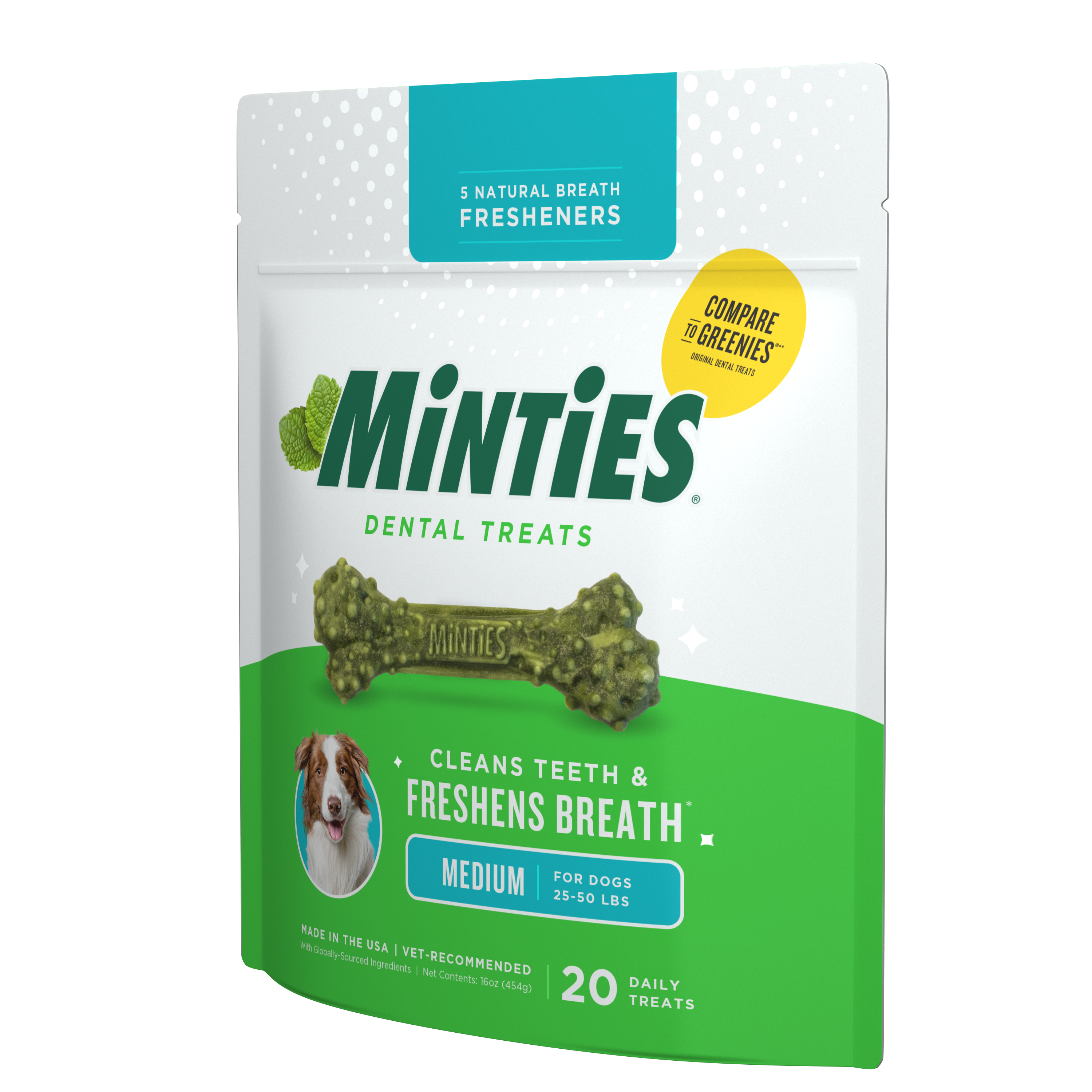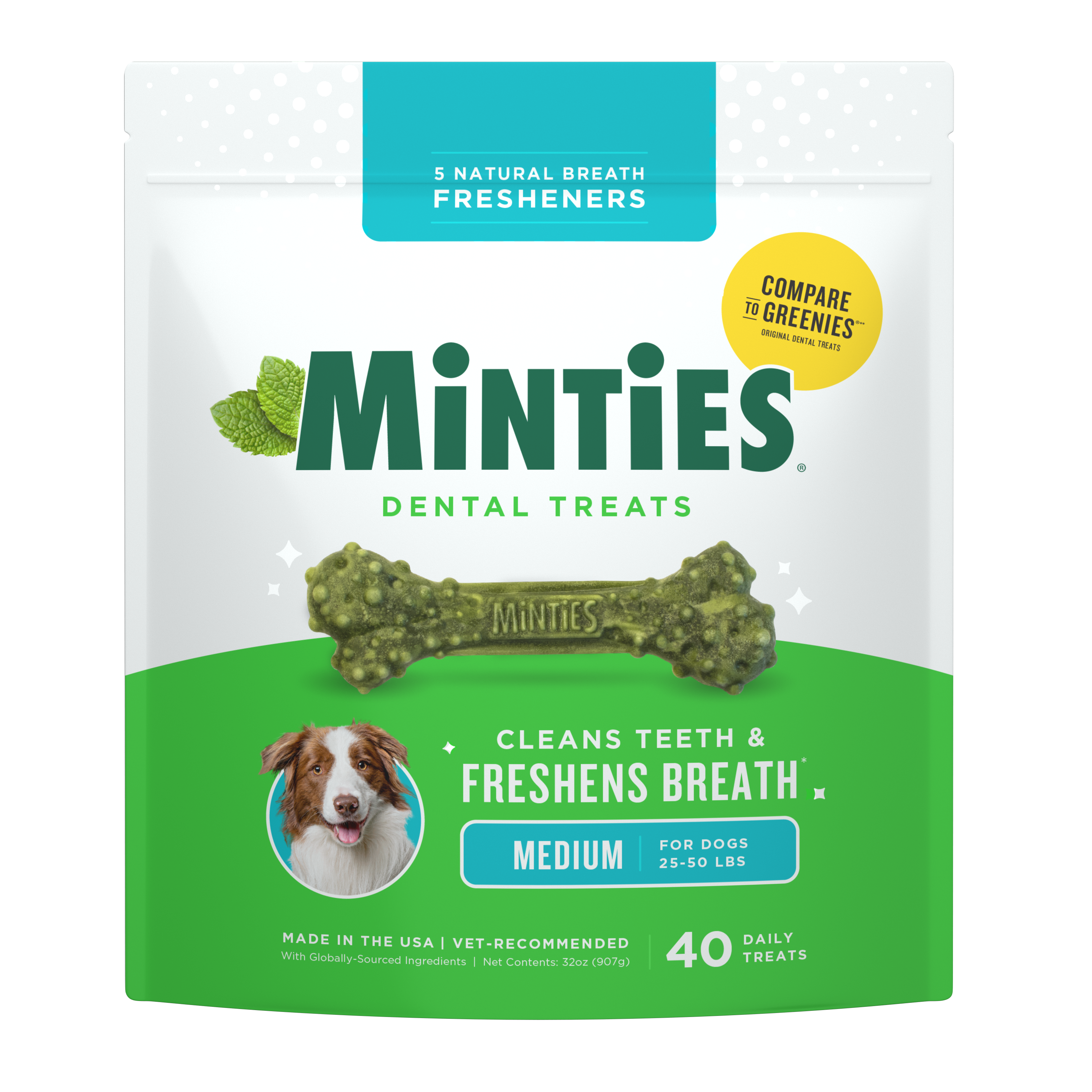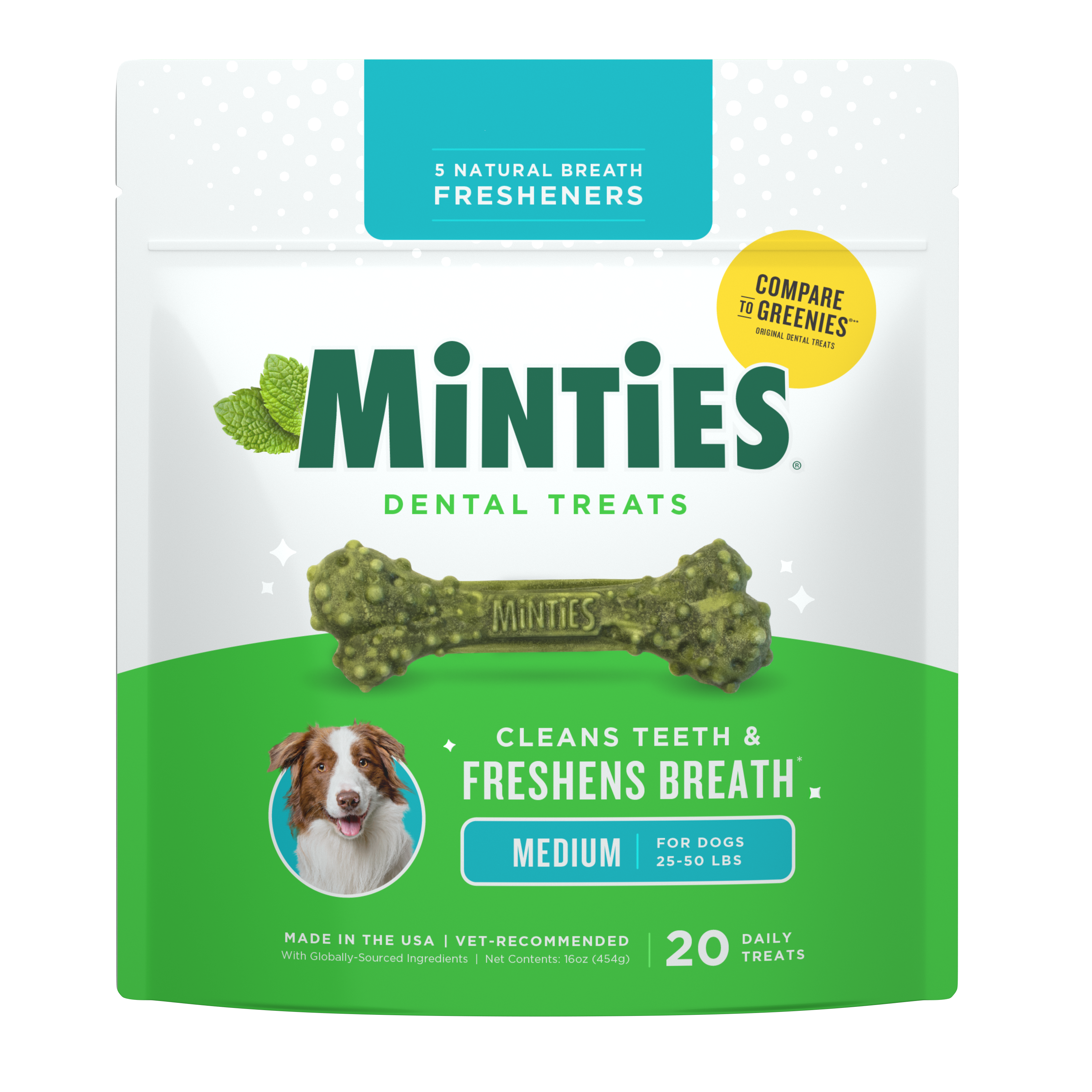 Shop / Unknown Type / Minties Dog Dental Bone Treats Medium Minties Dog Dental Bone Treats Medium Minties $9.99 16oz 32oz 16oz 32oz Purchase Options Free In-Store Pick Up Not Available Save 20% on orders $100+ Set your store for inventory and store pickup details Zip Code Search Same-day Delivery* No minimum charge for delivery orders. *Order before 2pm and have it delivered today. Orders placed after 2pm will be delivered the next day. Must be inside delivery radius. Zip Code Unfortunately delivery is not available to this address. In order to ensure the best availability accuracy, changing your selected store will remove all items from your cart. You will need to re-add these items with your newly selected store if you choose to continue. Continue Cancel Ship it to Me Quantity Add To Cart Feeding guide disclaimer ✕ Feeding guides provide a starting point for the amount of food to give your pet each day. We recommend that you keep your pet in ideal body condition and not allow them to become overweight. The amount of food your pet needs can vary based on age, activity level or other food and treats given, so be sure to work with your veterinarian to determine an appropriate weight for your pet, and to make any necessary adjustments to their feeding. Information Say hello to Minties, the dental treats that make oral care fun for your dog! Designed to freshen breath and promote dental health, Minties are crafted with 5 natural breath fresheners—peppermint, parsley, fennel, dill, and alfalfa. Plus, these dental treats for dogs are made without corn, wheat, soy, and added sugars or salts, to be extra gentle on sensitive tummies. Each of these dog breath treats features a unique shape and bumpy texture that help to scrub teeth as your dog chews! Veterinarian recommended and proudly made in the USA, Minties dental treats for dogs come in different sizes (small, medium, large) to suit dogs of all ages and breeds. Whether given daily or as an occasional after-dinner breath freshener, Minties dental chews for dogs are a tasty way to support your dog's oral hygiene routine and dog dental care. Minties are a wholesome choice that dogs love and owners trust for maintaining fresh breath, sparkling smiles, and overall dental wellness. INGREDIENTS: Rice Flour, Vegetable Glycerin, Water, Natural Chicken Flavor, Calcium Carbonate, Tricalcium Phosphate, Dried Alfalfa (Source of Chlorophyll), Peppermint Oil, Brewers Dried Yeast, Lecithin, Parsley, Fennel, Dill, Mixed Tocopherols (Preservative), Cholecalciferol (Source of Vitamin D3), Yellow #5, Blue #1. GUARANTEED ANALYSIS: Min. 6 % Crude Protein Min. 1.5 % Crude Fat Max. 2.5 % Crude Fiber Max. 15 % Moisture Customers also liked Customer Reviews