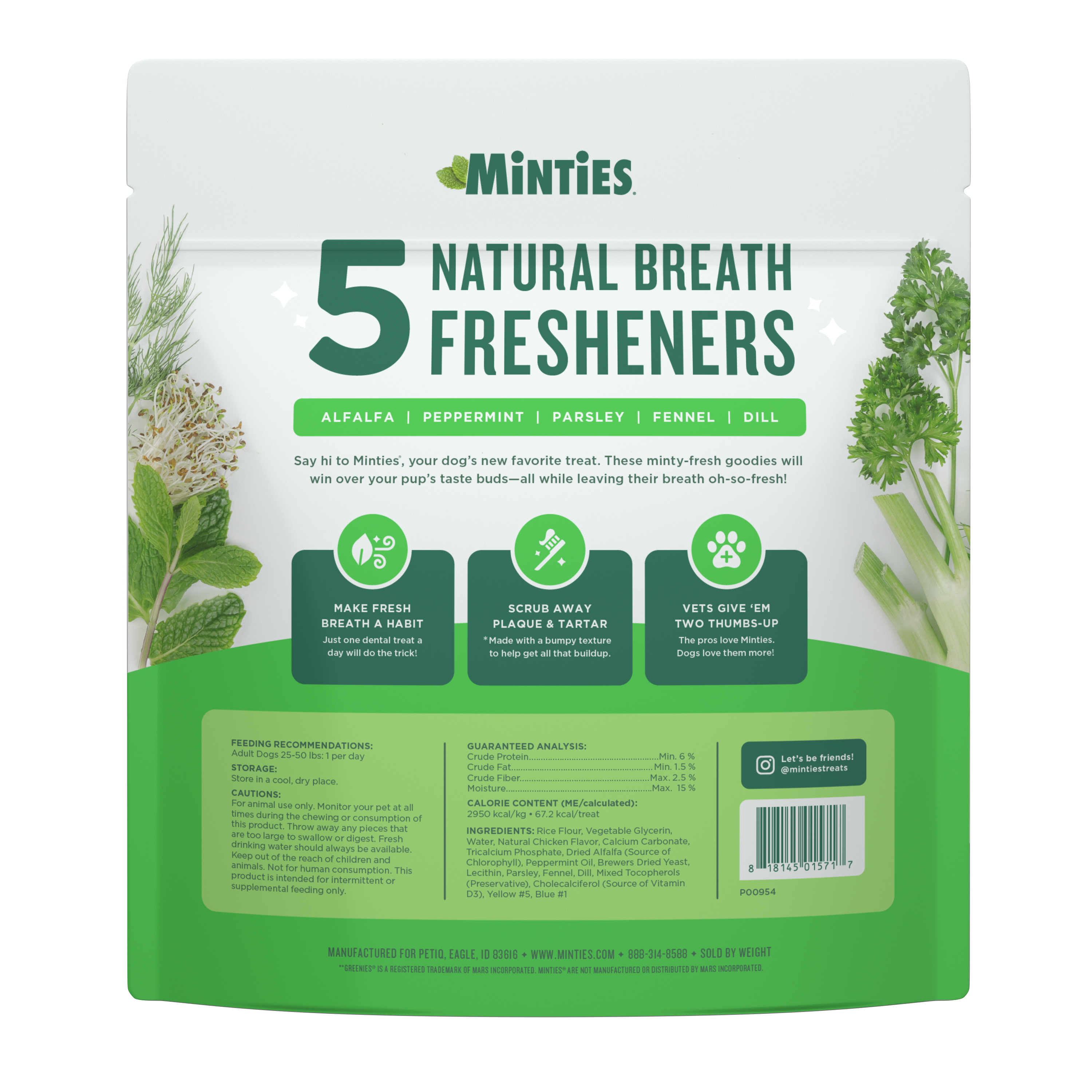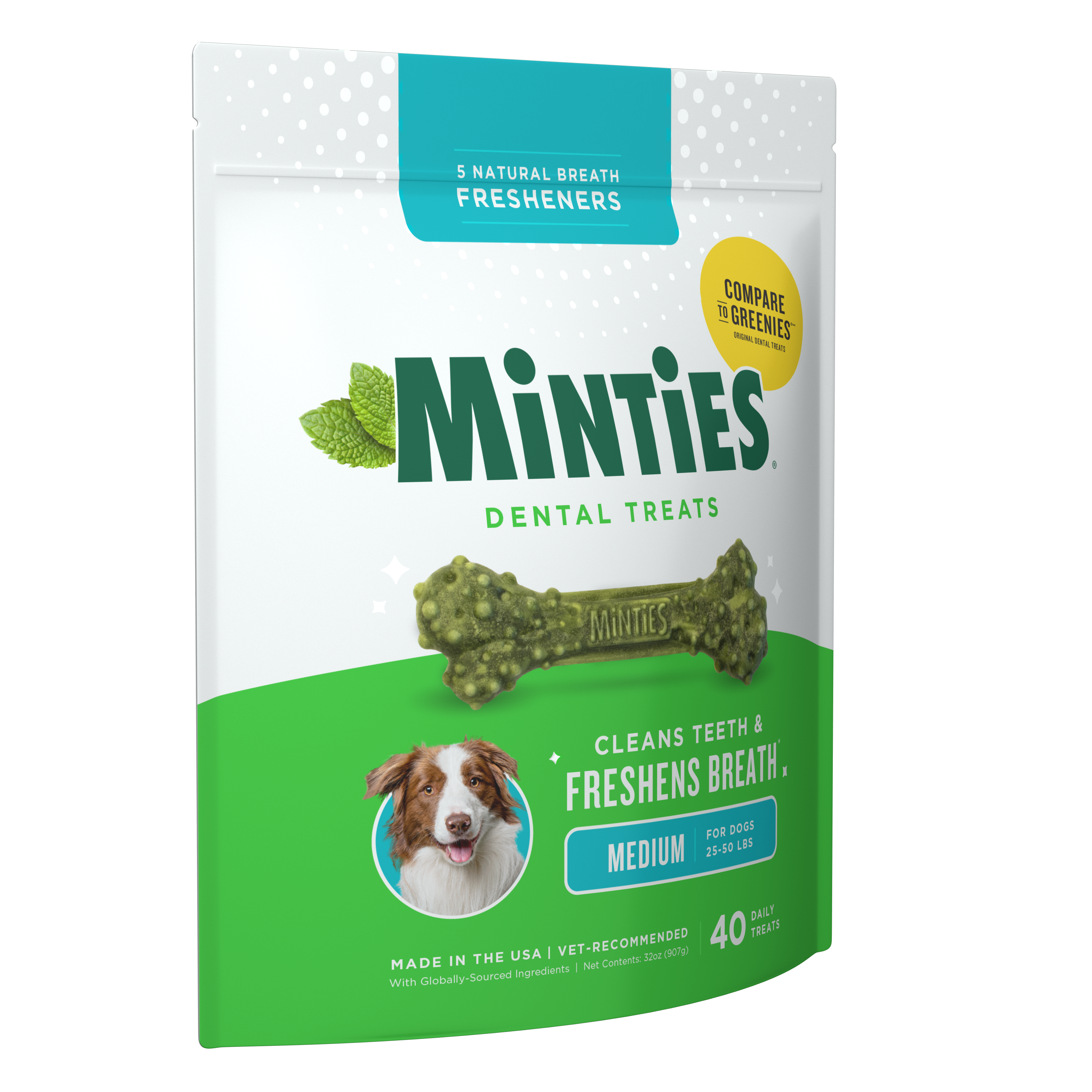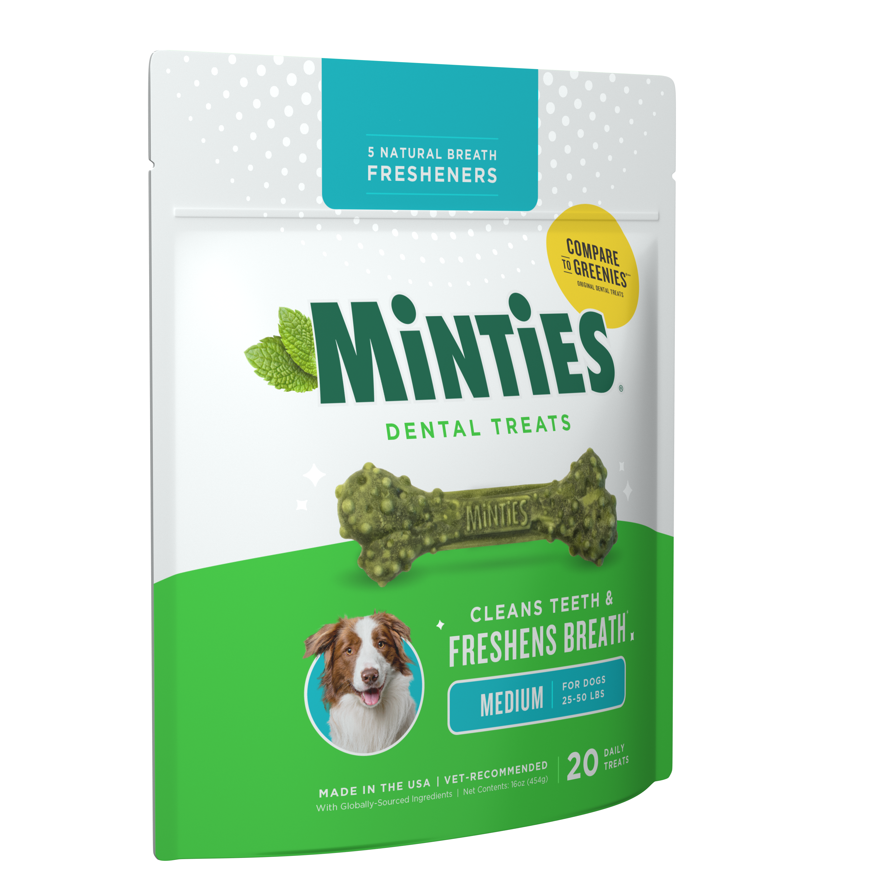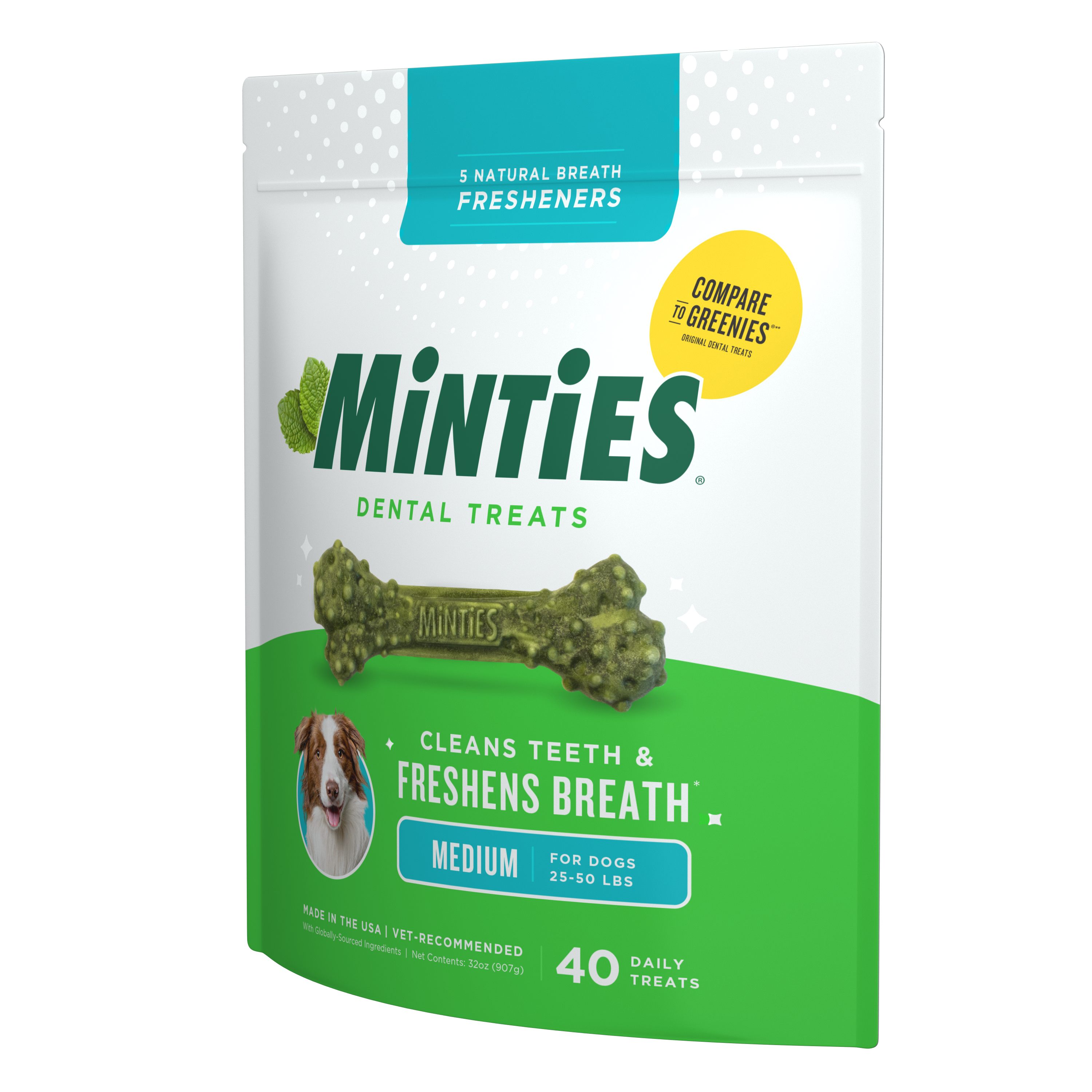 Shop / Unknown Type / Minties Dog Dental Bone Treats Medium Minties Dog Dental Bone Treats Medium Minties $9.99 16oz 32oz 16oz 32oz Purchase Options Free In-Store Pick Up Not Available Save 20% on orders $100+ Set your store for inventory and store pickup details Zip Code Search Same-day Delivery* No minimum charge for delivery orders. *Order before 2pm and have it delivered today. Orders placed after 2pm will be delivered the next day. Must be inside delivery radius. Zip Code Unfortunately delivery is not available to this address. In order to ensure the best availability accuracy, changing your selected store will remove all items from your cart. You will need to re-add these items with your newly selected store if you choose to continue. Continue Cancel Ship it to Me Quantity Add To Cart Feeding guide disclaimer ✕ Feeding guides provide a starting point for the amount of food to give your pet each day. We recommend that you keep your pet in ideal body condition and not allow them to become overweight. The amount of food your pet needs can vary based on age, activity level or other food and treats given, so be sure to work with your veterinarian to determine an appropriate weight for your pet, and to make any necessary adjustments to their feeding. Information Say hello to Minties, the dental treats that make oral care fun for your dog! Designed to freshen breath and promote dental health, Minties are crafted with 5 natural breath fresheners—peppermint, parsley, fennel, dill, and alfalfa. Plus, these dental treats for dogs are made without corn, wheat, soy, and added sugars or salts, to be extra gentle on sensitive tummies. Each of these dog breath treats features a unique shape and bumpy texture that help to scrub teeth as your dog chews! Veterinarian recommended and proudly made in the USA, Minties dental treats for dogs come in different sizes (small, medium, large) to suit dogs of all ages and breeds. Whether given daily or as an occasional after-dinner breath freshener, Minties dental chews for dogs are a tasty way to support your dog's oral hygiene routine and dog dental care. Minties are a wholesome choice that dogs love and owners trust for maintaining fresh breath, sparkling smiles, and overall dental wellness. INGREDIENTS: Rice Flour, Vegetable Glycerin, Water, Natural Chicken Flavor, Calcium Carbonate, Tricalcium Phosphate, Dried Alfalfa (Source of Chlorophyll), Peppermint Oil, Brewers Dried Yeast, Lecithin, Parsley, Fennel, Dill, Mixed Tocopherols (Preservative), Cholecalciferol (Source of Vitamin D3), Yellow #5, Blue #1. GUARANTEED ANALYSIS: Min. 6 % Crude Protein Min. 1.5 % Crude Fat Max. 2.5 % Crude Fiber Max. 15 % Moisture Customers also liked Customer Reviews