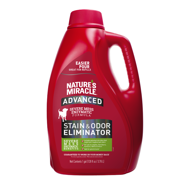 Shop / Unknown Type / Nature's Miracle Advanced Dog Stain & Odor Remover Pour 128 oz Nature's Miracle Advanced Dog Stain & Odor Remover Pour 128 oz Nature's Miracle 128oz $35.99 128oz Purchase Options Free In-Store Pick Up Not Available Save 10% on orders $49+ Set your store for inventory and store pickup details Zip Code Search Same-day Delivery* No minimum charge for delivery orders. *Order before 2pm and have it delivered today. Orders placed after 2pm will be delivered the next day. Must be inside delivery radius. Zip Code Unfortunately delivery is not available to this address. In order to ensure the best availability accuracy, changing your selected store will remove all items from your cart. You will need to re-add these items with your newly selected store if you choose to continue. Continue Cancel Ship it to Me Quantity Add To Cart Information Nature's Miracle Advanced Stain and Odor Eliminator for dogs works to discourage re-soiling by removing the odor of dog messes. The bacteria-based formula produces enzymes when it comes in contact with bio-based messes including severe urine, diarrhea, vomit and blood. The Stain and Odor Eliminator is safe to use on carpets, hard floors, furniture, fabrics and more, when used as directed, and leaves you with a light fresh scent. Discourages re-soiling by removing the odor of the toughest dog messes For use on carpets, hard floors, furniture, fabrics & more* Safe for pets & home* Enzymes target severe dog messes Works to eliminate severe stains and odors *When used and stored as directed Customers also liked Customer Reviews