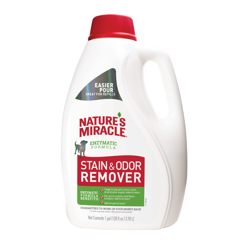 Shop / Unknown Type / Nature's Miracle Dog Stain & Odor Remover Pour 128oz Nature's Miracle Dog Stain & Odor Remover Pour 128oz Nature's Miracle 128oz $24.99 128oz Purchase Options Free In-Store Pick Up Not Available Save 10% on orders $49+ Set your store for inventory and store pickup details Zip Code Search Same-day Delivery* No minimum charge for delivery orders. *Order before 2pm and have it delivered today. Orders placed after 2pm will be delivered the next day. Must be inside delivery radius. Zip Code Unfortunately delivery is not available to this address. In order to ensure the best availability accuracy, changing your selected store will remove all items from your cart. You will need to re-add these items with your newly selected store if you choose to continue. Continue Cancel Ship it to Me Quantity Add To Cart Information Nature's Miracle® Stain and Odor Remover formula is an enzymatic stain and odor remover that’s tough on dog urine, feces, vomit, drool and other organic stains while freshening with a light scent. Bacteria-based formulas produce enzymes when they come into contact with bio-based messes. This formula is great to have on hand for spot-cleaning everyday pet messes. Why choose Nature’s Miracle® products? Nature’s Miracle pet stain and odor removers have been a trusted brand for pet mess cleanup for more than 40 years. When cute pets make not-so-cute messes, you can rely on Nature’s Miracle products to get the job done. Enzymatic formula For everyday pet messes Freshens with a light scent Customers also liked Customer Reviews
