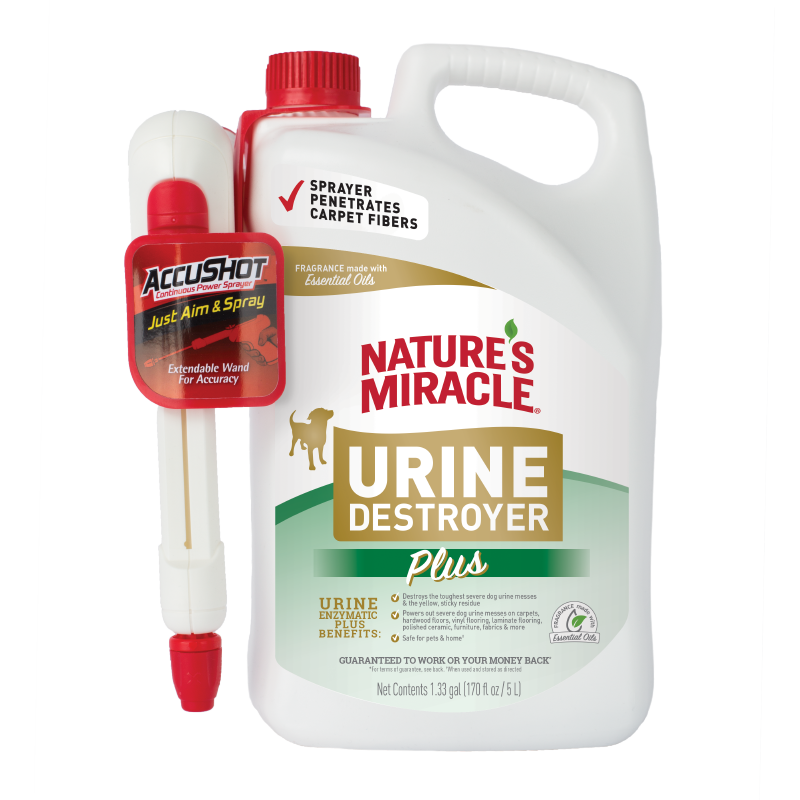 Shop / Unknown Type / Nature's Miracle Dog Urine Destroyer Plus AccuShot 170oz Nature's Miracle Dog Urine Destroyer Plus AccuShot 170oz Nature's Miracle 170oz $51.99 170oz Purchase Options Free In-Store Pick Up Not Available Save 10% on orders $49+ Set your store for inventory and store pickup details Zip Code Search Same-day Delivery* No minimum charge for delivery orders. *Order before 2pm and have it delivered today. Orders placed after 2pm will be delivered the next day. Must be inside delivery radius. Zip Code Unfortunately delivery is not available to this address. In order to ensure the best availability accuracy, changing your selected store will remove all items from your cart. You will need to re-add these items with your newly selected store if you choose to continue. Continue Cancel Ship it to Me Quantity Add To Cart Information Nature's Miracle Urine Destroyer for dogs is tough on strong dog urine and the yellow, sticky residue that comes along with it. The bacteria-based formula produces enzymes when it comes in contact with bio-based messes to target urine and freshens with a light fresh scent. When used as directed it's safe to use on carpets, hard floors, furniture, fabrics and more. Targeted urine destroyer Tough on strong dog urine and the yellow, sticky residue Freshens with a light fresh scent For use on carpets, hard floors, furniture, fabrics and more Customers also liked Customer Reviews