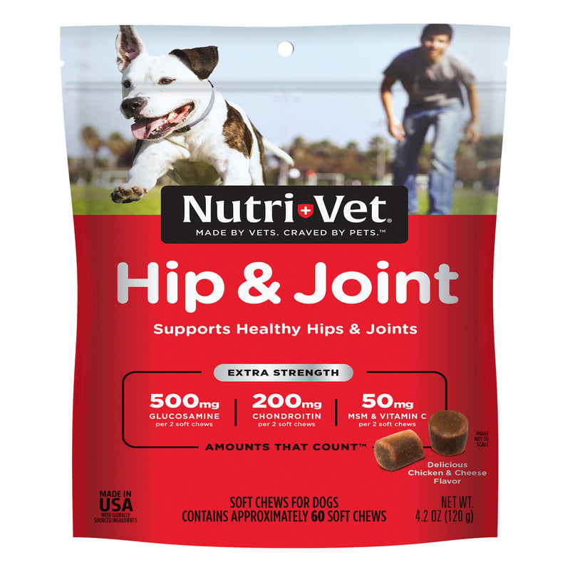 Shop / Unknown Type / Nutri-Vet Hip & Joint Extra Strength Soft Chews 60 Count Nutri-Vet Hip & Joint Extra Strength Soft Chews 60 Count Nutri-Vet 60ct $16.99 20% offDiscount will apply in cart 60ct Purchase Options Free In-Store Pick Up Not Available Save 10% on orders $49+ Set your store for inventory and store pickup details Zip Code Search Same-day Delivery* No minimum charge for delivery orders. *Order before 2pm and have it delivered today. Orders placed after 2pm will be delivered the next day. Must be inside delivery radius. Zip Code Unfortunately delivery is not available to this address. In order to ensure the best availability accuracy, changing your selected store will remove all items from your cart. You will need to re-add these items with your newly selected store if you choose to continue. Continue Cancel Ship it to Me Quantity Add To Cart Information Nutri-Vet Hip & Joint Extra Strength soft chews are great for active dogs of all sizes. Each chew contains balanced levels of glucosamine for dogs and chondroitin to support hips and joints and maintain healthy cartilage, as well as vitamin C. This chicken and cheese flavor treat is veterinary-formulated to provide the best joint supplement for dogs. 500 mg of Glucosamine HCL, the key building block for making cartilage, helps maintain mobility and activity. 200 mg of chondroitin sulfate protects existing cartilage and slows its breakdown. Vitamin C, a potent antioxidant, supports bones and cartilage while fighting free radicals and supporting the immune system. Directions For Use: Two soft chews per 40 pounds body weight twice daily. Allow four to six weeks for best results. Continue as needed. Acitive Ingredients per Two Soft Chews: Glucosamine HCL (Shellfish) - 500 mg, Chondroitin Sulfate (Porcine) - 200 mg, Methylsulfonylmethane (MSM) - 50 mg, Vitamin C - 50 mg, Manganese (Manganese Gluconate) - 5 mg, Hyaluronic Acid (Sodium Hyaluronate) - 1 mg Inactive Ingredients: Brewers Dried Yeast, Calcium Propionate, Canola Oil, Caramel Color, Corn Starch, Dried Cheese, Dried Chicken Liver, Green Tea Extract, Mixed Tocopherols, Natural Flavors, Rosemary Extract, Sorbic Acid, Soy Lecithin, Vegetable glycerin, Vegetable Oil, Yucca Schidigera Extract. Customers also liked Customer Reviews