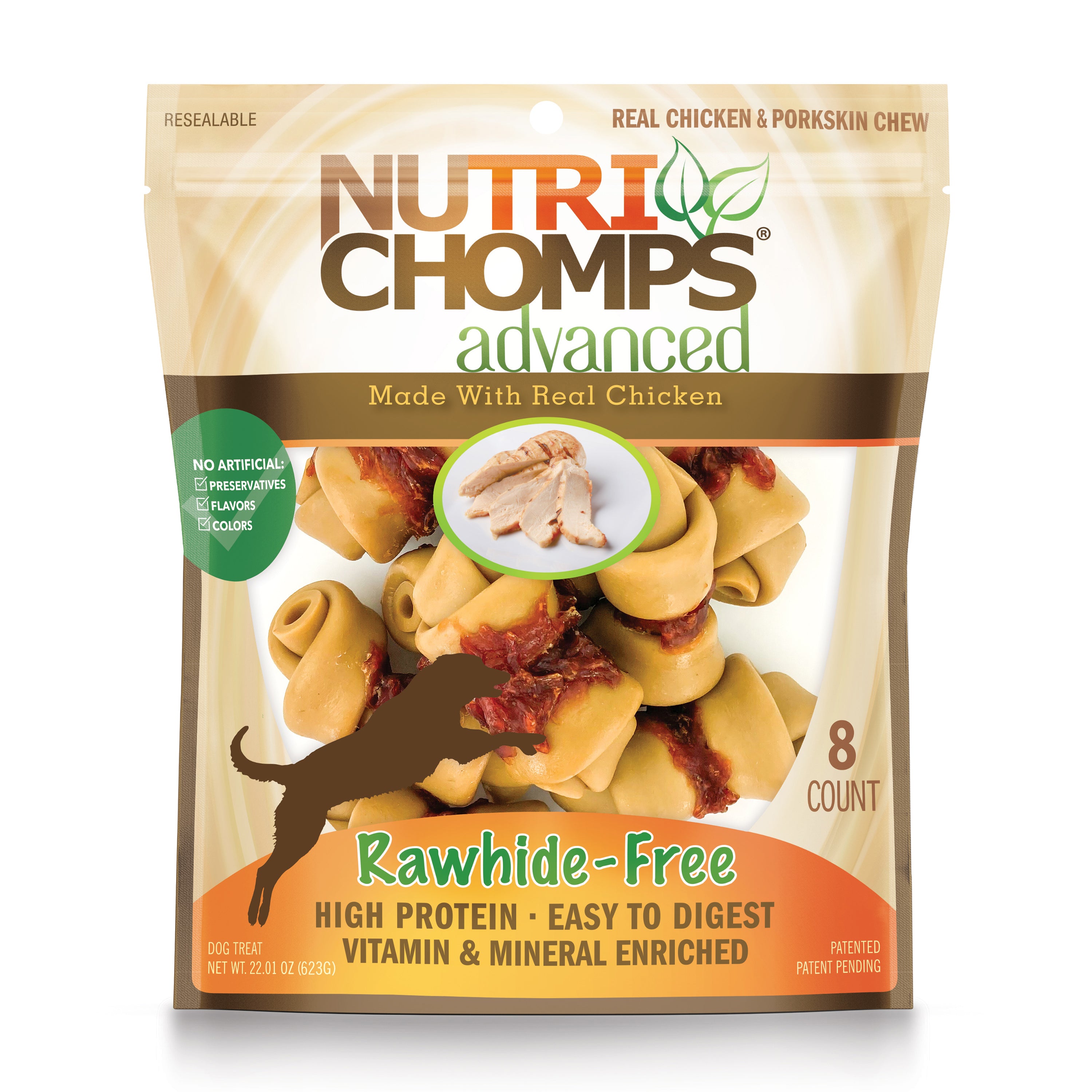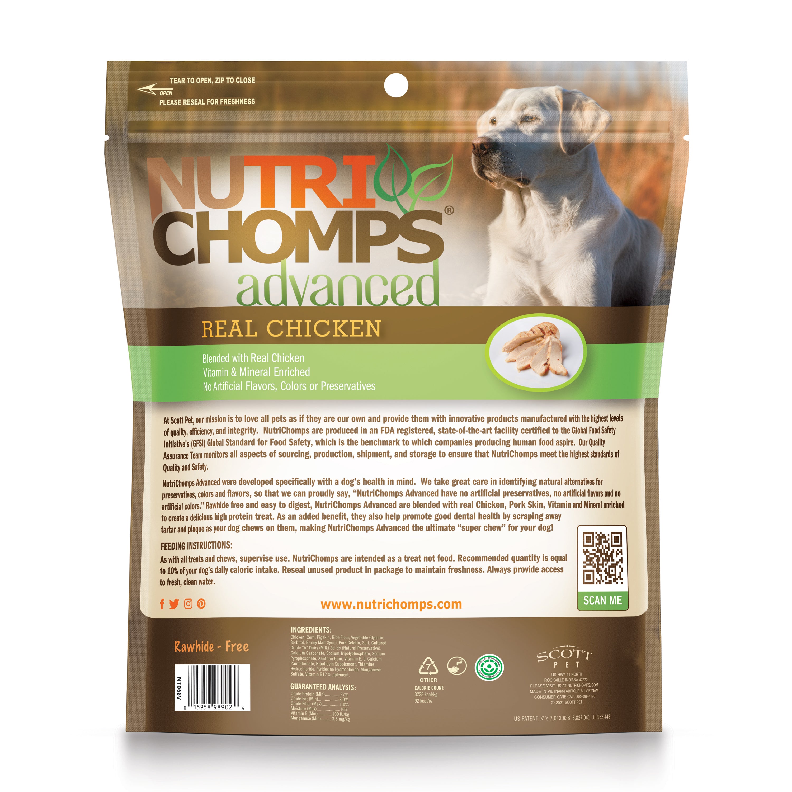 Shop / Unknown Type / NutriChomps Advanced 4" Chicken Flavor Knots Wrapped with Real Chicken, 8 Count Dog Chews NutriChomps Advanced 4" Chicken Flavor Knots Wrapped with Real Chicken, 8 Count Dog Chews NutriChomps Default Title $21.98 Default Title Purchase Options Free In-Store Pick Up Not Available Save 10% on orders $49+ Set your store for inventory and store pickup details Zip Code Search Same-day Delivery* No minimum charge for delivery orders. *Order before 2pm and have it delivered today. Orders placed after 2pm will be delivered the next day. Must be inside delivery radius. Zip Code Unfortunately delivery is not available to this address. In order to ensure the best availability accuracy, changing your selected store will remove all items from your cart. You will need to re-add these items with your newly selected store if you choose to continue. Continue Cancel Ship it to Me Quantity Add To Cart Feeding guide disclaimer ✕ Feeding guides provide a starting point for the amount of food to give your pet each day. We recommend that you keep your pet in ideal body condition and not allow them to become overweight. The amount of food your pet needs can vary based on age, activity level or other food and treats given, so be sure to work with your veterinarian to determine an appropriate weight for your pet, and to make any necessary adjustments to their feeding. Information Treat your fur friend to the colossal flavor of Premium NutriChomps Advanced 4" Chicken Flavor Knots Wrapped with Real Chicken. NutriChomps Advanced combines the great taste of real chicken with wholesome ingredients to create the perfect made-to-crave dog chew. Rawhide-free and naturally tasty, these premium chews have ZERO artificial preservatives, flavors or dyes. Natural chews also help promote good dental health between brushings by scraping away plaque and tartar as your pup chews. For even more healthy rewards, NutriChomps Advanced dog chews are easy to digest and vitamin & mineral enriched to support a variety of internal systems that help keep your pooch looking and feeling their best. Perfectly sized for Medium and Large Dogs. Ingredients: Chicken, Corn, Pigskin, Rice Flour, Vegetable Glycerin, Sorbitol, Barley Malt Syrup, Pork Gelatin, Salt, Cultured Grade “A” Dairy (Milk) Solids (Natural Preservative), Calcium Carbonate, Sodium Tripolyphosphate, Sodium Pyrophosphate, Xanthan Gum, Vitamin E, d-Calcium Pantothenate, Riboflavin Supplement, Thiamine Hydrochloride, Pyridoxine Hydrochloride, Manganese Sulfate, Vitamin B12 Supplement. Guaranteed Analysis: Crude Protein (min) 27.0%, Crude Fat (min) 3.0%, Crude Fiber (max) 1.0%, Moisture (max) 16.0%, Vit E 100 IU/kg, Manganese 3.5mg/kg Customers also liked Customer Reviews