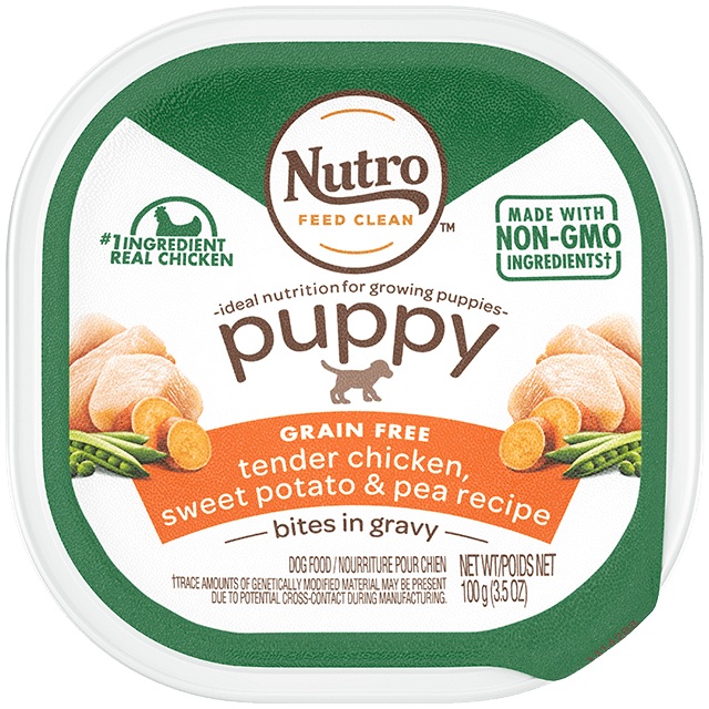 Your puppy will do a happy dance when you feed them NUTRO™ PUPPY Bites in Gravy Trays Wet Dog Food . Real chicken is the first ingredient in this delicious, grain free wet puppy food recipe. NUTRO Puppy Bites in Gravy Trays are made with ingredients that serve a precise purpose and are crafted with balanced protein and fat for optimal growth. This NUTRO recipe is made with non-GMO ingredients* and has no chicken by-product meal, corn, wheat, or soy, and no artificial flavors, colors, or preservatives. Plus, it's made at facilities that are committed to zero waste to landfill. Give your dog NUTRO PUPPY Bites in Gravy Trays Wet Dog Food with the NUTRO FEED CLEAN logo every day for ultimate tail wags.
