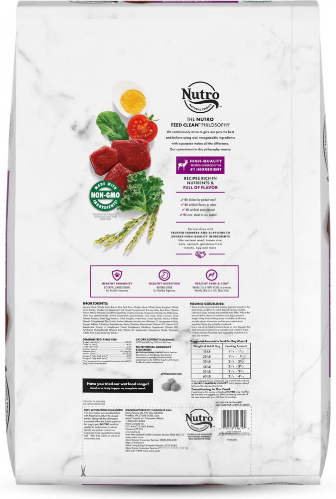 Shop / Dog Food / Nutro Wholesome Essentials Adult Venison Meal, Brown Rice and Oatmeal Dry Dog Food Nutro Wholesome Essentials Adult Venison Meal, Brown Rice and Oatmeal Dry Dog Food Nutro Weight: 30 lb $104.99 30-lb Purchase Options Free In-Store Pick Up Not Available Save 10% on orders $49+ Set your store for inventory and store pickup details Zip Code Search Same-day Delivery* No minimum charge for delivery orders. *Order before 2pm and have it delivered today. Orders placed after 2pm will be delivered the next day. Must be inside delivery radius. Zip Code Unfortunately delivery is not available to this address. In order to ensure the best availability accuracy, changing your selected store will remove all items from your cart. You will need to re-add these items with your newly selected store if you choose to continue. Continue Cancel Ship it to Me Quantity Add To Cart Feeding guide disclaimer ✕ Feeding guides provide a starting point for the amount of food to give your pet each day. We recommend that you keep your pet in ideal body condition and not allow them to become overweight. The amount of food your pet needs can vary based on age, activity level or other food and treats given, so be sure to work with your veterinarian to determine an appropriate weight for your pet, and to make any necessary adjustments to their feeding. Information Nutro Adult Venison Meal, Brown Rice & Oatmeal Recipe Dog Food always starts with Venison Meal as the first ingredient. High in protein and healthy fats, venison is an excellent alternative for dogs with sensitivites to more traditional proteins. This natural adult dog food provides natural fiber for healthy digestion and essential antioxidants, such as Vitamin E, for a healthy immune system, plus vitamins, minerals and other nutrients. These recipes are also crafted to promote healthy skin and a soft, shiny coat. Nutro Food for Dogs also follows the the Nutro Feed Clean philosophy; always made with Non-GMO Ingredients and is made with no artificial flavors, colors or preservatives. Why We Love It Real venison is the first ingredient Nutro Feed Clean philosophy ensures no GMO ingredients and no artificial preservatives or colors Made in the USA About NutroOur dogs love to get dirty. Rainy games of fetch at the park, muddy walks in the woods, jumping into the lake, it's all in a day's work for our best friends. While our dogs get dirty, NUTRO has gone above and beyond to create clean recipes. With non-GMO ingredients (trace amounts of genetically modified material may be present due to cross-contact during manufacturing), no artificial flavors, colors, or preservatives, and with high quality, real proteins like real chicken, venison, and duck as the first ingredient in every recipe, NUTRO Feed Clean philosophy brings new meaning to dog food. With tailored, natural nutrition including grain-free, limited ingredient, high protein and more, all made in the USA, the highest safety standards, unmatched community involvement, and visible health benefits, NUTRO continues to show their commitment to providing high-quality, clean recipes so that our dogs can get back to doing what they do best - getting dirty. Nutro. Feed Clean. Ingredients Venison Meal, Whole Brown Rice, Whole Grain Oatmeal, Brewers Rice, Chickpeas, Rice Bran, Pea Protein, Split Peas, Chicken Fat (preserved with mixed Tocopherols), Natural Flavor, Flaxseed, Sunflower Oil (preserved with mixed Tocopherols), Soybean Oil (preserved with mixed Tocopherols), Potassium Chloride, Salt, Choline Chloride, DL-Methionine, Taurine, Zinc Sulfate, Niacin Supplement, Vitamin E Supplement, Calcium Pantothenate, Riboflavin Supplement (Vitamin B2), Pyridoxine Hydrochloride (Vitamin B6), Vitamin B12 Supplement, Iron Amino Acid Chelate, Copper Amino Acid Chelate, Selenium Yeast, Manganese Amino Acid Chelate, Biotin, Vitamin A Supplement, Thiamine Mononitrate (Vitamin B1), Vitamin D3 Supplement, Potassium Iodide, Folic Acid, Rosemary Extract, Decaffeinated Green Tea Extract, Spearmint Extract. Guaranteed Analysis Nutrient Guaranteed Units Crude Protein 22.0% min Crude Fat 14.0% min Crude Fiber 3.5% max Moisture 10.0% max Linoleic Acid 3.5% min Zinc 250 mg/kg min Selenium 0.35 mg/kg min Vitamin E 60 IU/kg min Customers also liked Customer Reviews