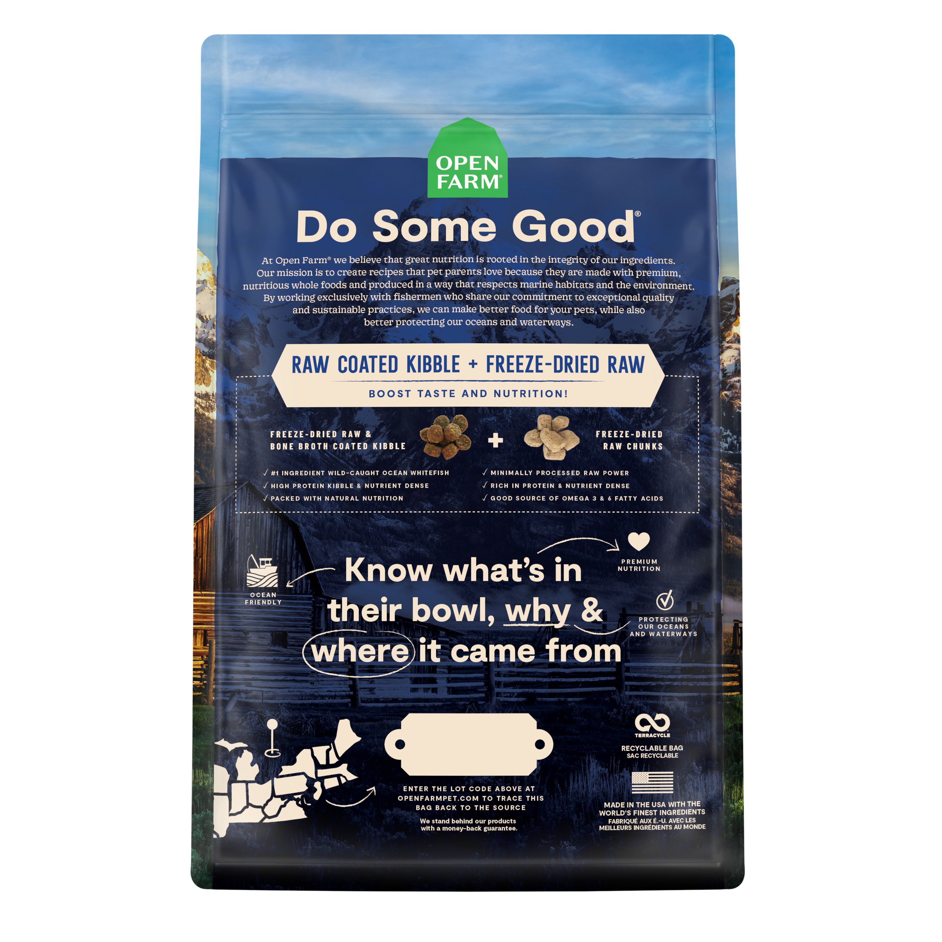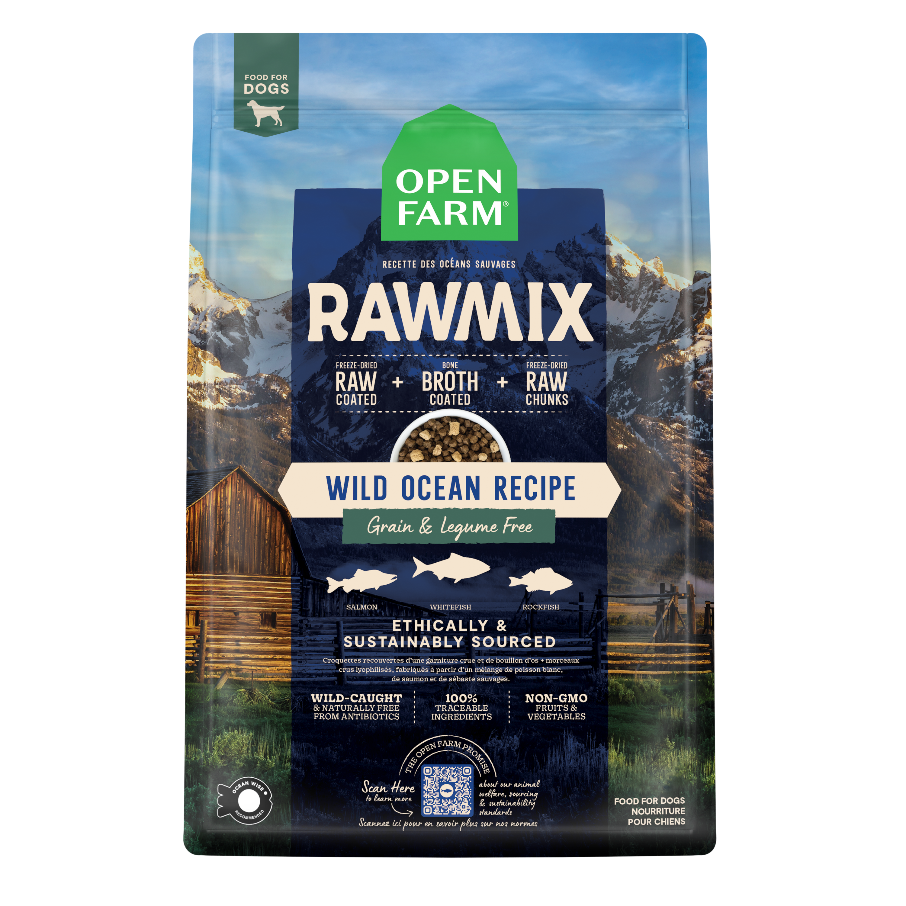 Shop / Unknown Type / Open Farm RawMix Wild Ocean Grain-Free Dog Kibble Open Farm RawMix Wild Ocean Grain-Free Dog Kibble Open Farm 3.5lb 15% Off Open Farm $29.99 3.5lb Purchase Options Free In-Store Pick Up Not Available Save 10% on orders $49+ Set your store for inventory and store pickup details Zip Code Search Same-day Delivery* No minimum charge for delivery orders. *Order before 2pm and have it delivered today. Orders placed after 2pm will be delivered the next day. Must be inside delivery radius. Zip Code Unfortunately delivery is not available to this address. In order to ensure the best availability accuracy, changing your selected store will remove all items from your cart. You will need to re-add these items with your newly selected store if you choose to continue. Continue Cancel Ship it to Me Quantity Add To Cart Feeding guide disclaimer ✕ Feeding guides provide a starting point for the amount of food to give your pet each day. We recommend that you keep your pet in ideal body condition and not allow them to become overweight. The amount of food your pet needs can vary based on age, activity level or other food and treats given, so be sure to work with your veterinarian to determine an appropriate weight for your pet, and to make any necessary adjustments to their feeding. Information ReWild their diet with this multi-animal protein blend of Ocean Wise recommended wild-caught whitefish, salmon and rockfish, covered in a bone broth and freeze dried raw coating. Bonus freeze dried raw chunks provide a protein-packed boost, while nutrient-dense ancient grains and superfoods like pumpkin ensure complete and balanced nutrition. Ingredients Ocean Whitefish, Menhaden Fish Meal, Potatoes, Salmon, Sweet Potatoes, Herring Meal, Tapioca , Coconut Oil, Ocean Rockfish, Sunflower Oil (Preserved with Mixed Tocopherols), Pumpkin, Natural Flavor, Carrots, Apples, Cranberries, Salt, Vitamins (Vitamin E Supplement, Vitamin A Supplement, Niacin Supplement, Pantothenic Acid, Riboflavin Supplement, Thiamine Mononitrate, Vitamin B12 Supplement, Pyridoxine Hydrochloride, Folic Acid), Potassium Chloride, Choline Chloride, Dried Chicory Root, Magnesium Sulfate, Minerals (Zinc Proteinate, Iron Proteinate, Copper Proteinate, Manganese Proteinate, Selenium Yeast, Calcium Iodate), Taurine, Dried Kelp, Organic Butternut Squash, Organic Blueberries, Montmorillonite Clay, Miscanthus Grass, Fish Bone Broth, Flaxseed, Cinnamon, Turmeric, Organic Spinach, Dandelion Greens, Organic Kale, Organic Apple Cider Vinegar, Organic Pumpkin Seeds, Organic Sunflower Seeds, Rosemary Extract. Guaranteed Analysis Crude Protein (Min) 30%, Crude Fat (Min) 15%, Crude Fiber (Max) 4.5%, Moisture (Max) 10%, Docosahexaenoic Acid (Dha) (Min) 0.11%, Calcium (Min) 1.2%, Phosphorus (Min) 1%, Omega-3 Fatty Acids* (Min) 0.4%, Omega-6 Fatty Acids* (Min) 3%, Taurine* (Min) 0.2% Customers also liked Customer Reviews