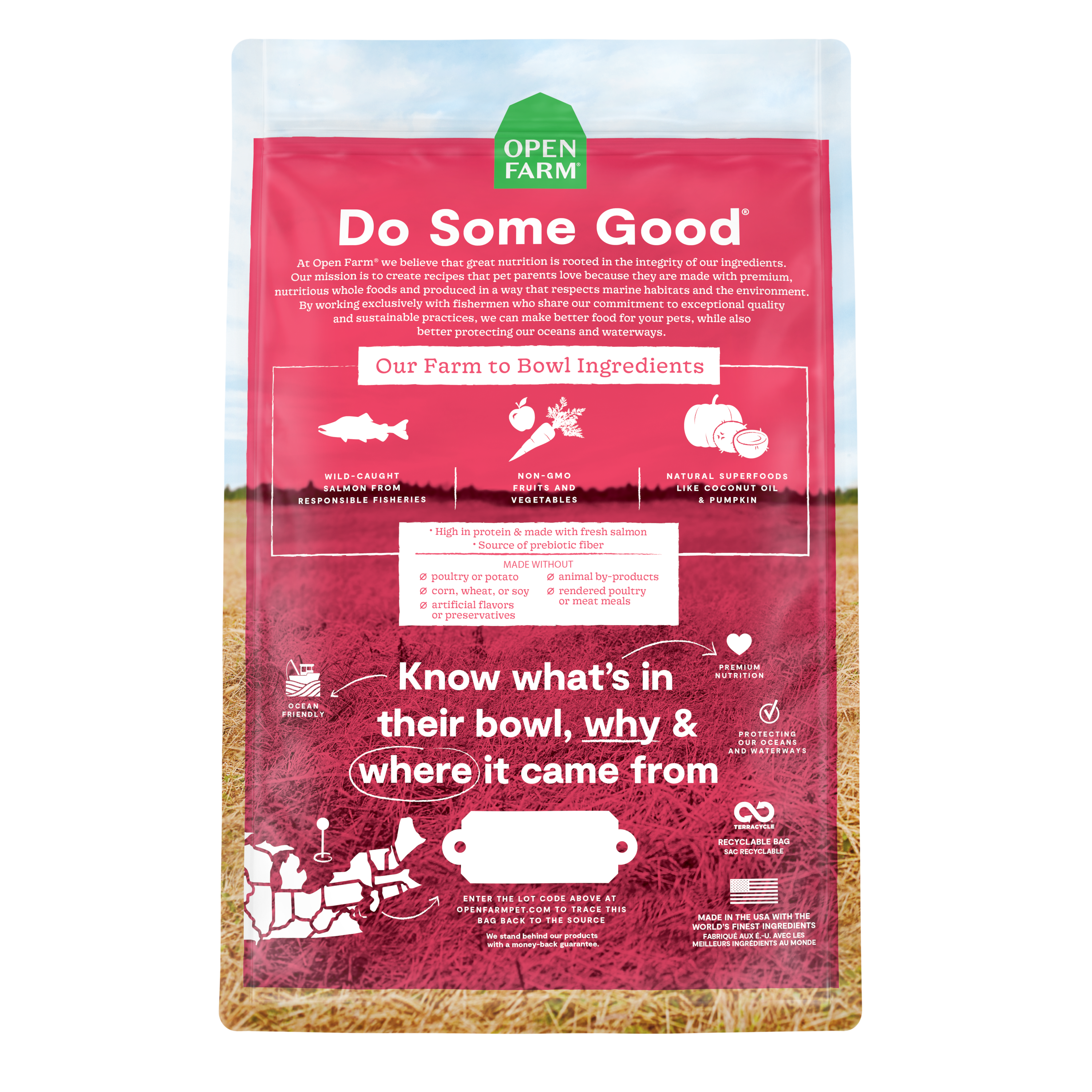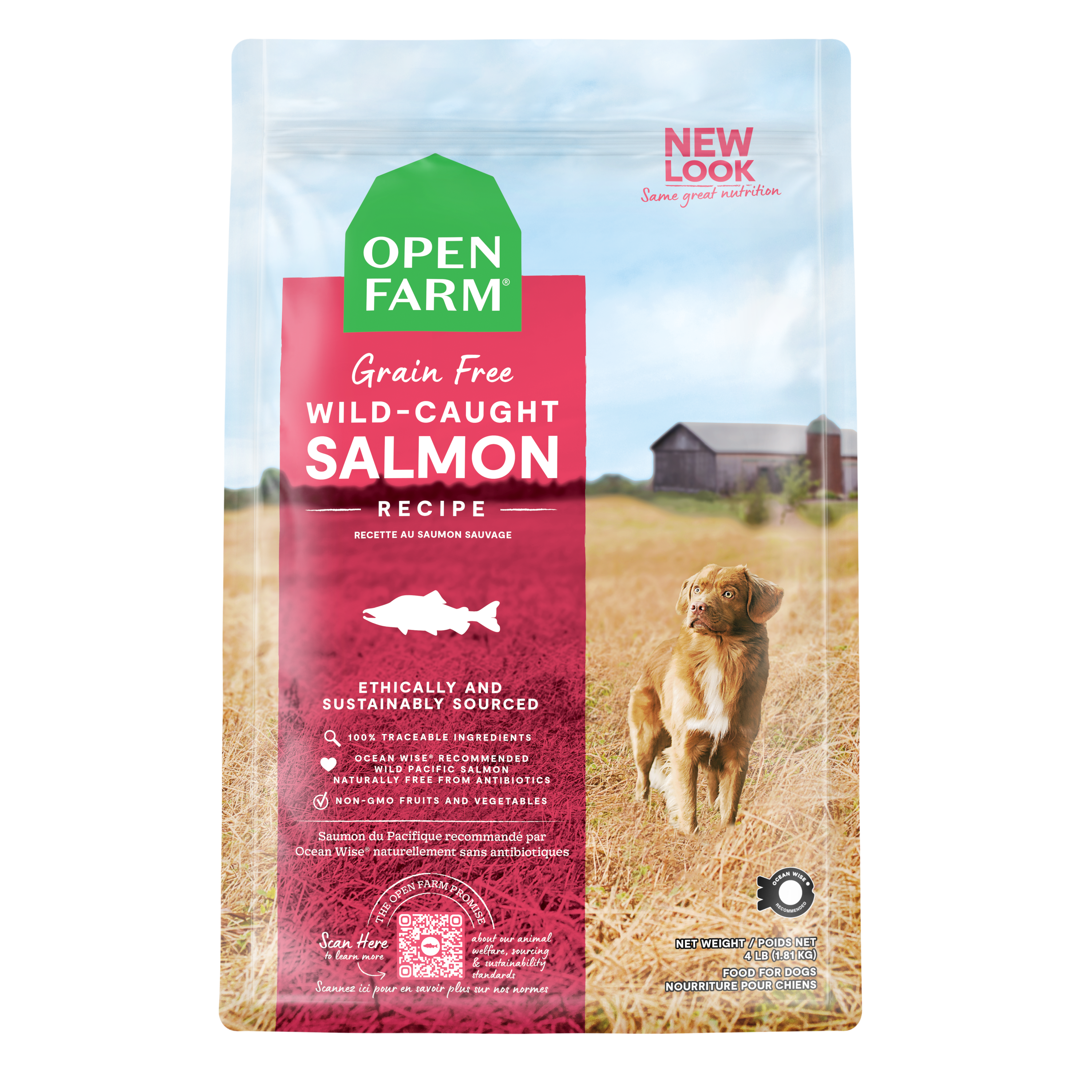 Shop / Unknown Type / Open Farm Wild-Caught Salmon Grain-Free Dog Kibble Open Farm Wild-Caught Salmon Grain-Free Dog Kibble Open Farm 4lb 15% Off Open Farm $29.99 4lb Purchase Options Free In-Store Pick Up Not Available Save 10% on orders $49+ Set your store for inventory and store pickup details Zip Code Search Same-day Delivery* No minimum charge for delivery orders. *Order before 2pm and have it delivered today. Orders placed after 2pm will be delivered the next day. Must be inside delivery radius. Zip Code Unfortunately delivery is not available to this address. In order to ensure the best availability accuracy, changing your selected store will remove all items from your cart. You will need to re-add these items with your newly selected store if you choose to continue. Continue Cancel Ship it to Me Quantity Add To Cart Feeding guide disclaimer ✕ Feeding guides provide a starting point for the amount of food to give your pet each day. We recommend that you keep your pet in ideal body condition and not allow them to become overweight. The amount of food your pet needs can vary based on age, activity level or other food and treats given, so be sure to work with your veterinarian to determine an appropriate weight for your pet, and to make any necessary adjustments to their feeding. Information Bring a nutrient-dense, grain-free diet to your dog's bowl with this protein-packed complete and balanced meal, featuring Ocean Wise recommended wild-caught salmon, non-GMO fruits and veggies, and superfoods like pumpkin and coconut oil. Rich in omega-3 fatty acids and always free of corn, wheat, and soy, this 100% traceable recipe is formulated for optimal nutrition. Ingredients Salmon, Chickpeas, Ocean Whitefish Meal, Peas, Herring Meal, Red Lentils, Coconut Oil, Green Lentils, Coconut Meal, Pumpkin, Natural Flavor, Carrots, Sunflower Oil, Apples, Salt, Cranberries, Flaxseed, Dried Chicory Root Extract, Vitamin E Supplement, Vitamin A Supplement, Niacin Supplement, Calcium Pantothenate, Riboflavin Supplement, Thiamine Mononitrate, Vitamin B12 Supplement, Pyridoxine Hydrochloride, Folic Acid, Salmon Oil (Source of DHA), Suncured Alfalfa Meal, Dicalcium Phosphate, Choline Chloride, Zinc Proteinate, Iron Proteinate, Copper Proteinate, Manganese Proteinate, Selenium Yeast, Calcium Iodate, Taurine, Mixed Tocopherols (A Preservative), Cinnamon, Turmeric, Rosemary Extract. Guaranteed Analysis CRUDE PROTEIN (min) 30%CRUDE FAT (min) 14%CRUDE FIBER (max) 4.5%MOISTURE (max) 10%DOCOSAHEXAENOIC ACID (DHA) (min) 0.11%CALCIUM (min) 1.2%PHOSPHORUS (min) 1%VITAMIN A (min) 5,000 IU/kgVITAMIN E (min) 50 IU/kgOMEGA-3 FATTY ACIDS* (min) 0.4%OMEGA-6 FATTY ACIDS* (min) 1.25%TAURINE* (min) 0.2% Customers also liked Customer Reviews