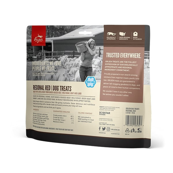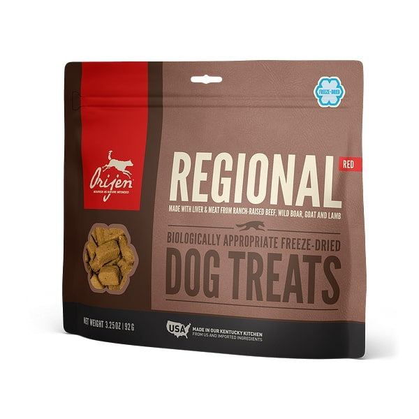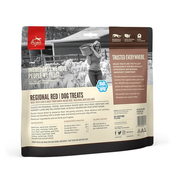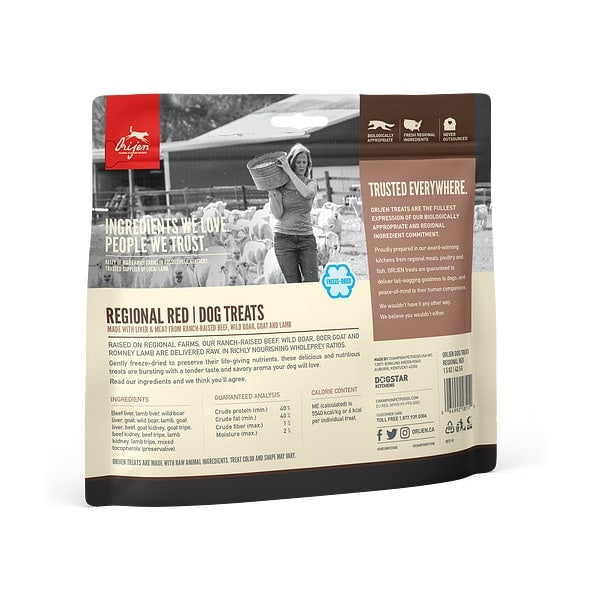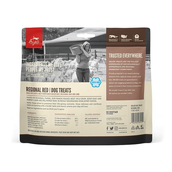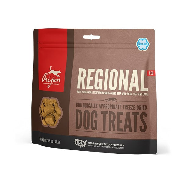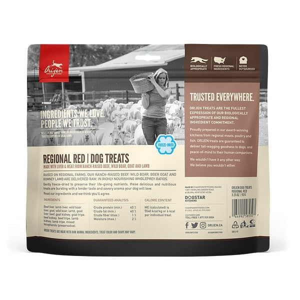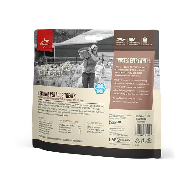 Shop / Treats / ORIJEN Freeze Dried Regional Red Dog Treats ORIJEN Freeze Dried Regional Red Dog Treats ORIJEN Weight: 3.25 oz $16.99 Sorry, this product is currently out of stock. Feeding guide disclaimer ✕ Feeding guides provide a starting point for the amount of food to give your pet each day. We recommend that you keep your pet in ideal body condition and not allow them to become overweight. The amount of food your pet needs can vary based on age, activity level or other food and treats given, so be sure to work with your veterinarian to determine an appropriate weight for your pet, and to make any necessary adjustments to their feeding. Information ORIJEN freeze-dried treats are prepared without cooking, so they retain all of the natural goodness of our authentically fresh ingredients.Our freeze-dry kitchens are equipped with nitrogen tunnels which flash-freeze our fresh ingredients at extremely low temperatures (-60°F), locking in their life-giving nutrients. Then an 18-hour freeze-drying process gently converts the water frozen in the ingredients into ice vapor, without creating any liquid.This means only water is removed from our fresh ingredients, leaving behind all their goodness in concentrated form, creating a nourishing taste experience your dog will love. Ingredients Beef liver, lamb liver, wild boar liver, goat, wild boar, lamb, goat liver, beef, goat kidney, goat tripe, beef kidney, wild boar heart, beef tripe, lamb kidney, lamb tripe, mixed tocopherols (preservative), citric acid (preservative), rosemary extract. Guaranteed Analysis Nutrient Guaranteed Units Crude Protein 40% min Crude Fat 40% min Customers also liked Customer Reviews