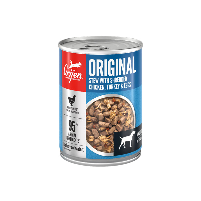 Shop / Unknown Type / ORIJEN Premium Wet Dog Food Original Stew, 12.8oz ORIJEN Premium Wet Dog Food Original Stew, 12.8oz ORIJEN 12.8 OZ $5.99 12.8 OZ Purchase Options Free In-Store Pick Up Not Available Save 10% on orders $49+ Set your store for inventory and store pickup details Zip Code Search Same-day Delivery* No minimum charge for delivery orders. *Order before 2pm and have it delivered today. Orders placed after 2pm will be delivered the next day. Must be inside delivery radius. Zip Code Unfortunately delivery is not available to this address. In order to ensure the best availability accuracy, changing your selected store will remove all items from your cart. You will need to re-add these items with your newly selected store if you choose to continue. Continue Cancel Ship it to Me Quantity Add To Cart Information Help your dog thrive with the power of protein-rich ORIJEN Original Stew Recipe with Chicken, Turkey & Eggs Wet Dog Food. This ORIJEN dog food diet is made with rich inclusions of chicken and turkey shreds that will help your dog thrive. With a Biologically Appropriate recipe, this wet dog food is based on what your canine's ancestors consumed in the wild. Packed with 95 percent animal ingredients*, ORIJEN wet dog food provides a high protein diet that will nourish a lifetime of adventures. The ingredients of this high protein dog food include chicken, turkey, and eggs giving your dog a strong source of essential protein, vitamins and minerals. ORIJEN WholePrey ingredients including organs and bones provide your dog with the most succulent and nutrient-rich parts of prey. Feed your dog ORIJEN wet dog food alone to add moisture and nourishment to their diet, or add it on top of ORIJEN kibble for a nutritious addition to mealtime. Our included fresh ingredients are delivered refrigerated and our included raw ingredients are delivered frozen. NOURISH AS NATURE INTENDED *Approximate 95 percent, and excludes water for processing One (1) 12.8 oz can of ORIJEN Original Stew Recipe with Chicken, Turkey & Eggs Wet Dog Food ORIJEN wet dog food is tailored to help your dog thrive with a high moisture content to keep your canine hydrated ORIJEN dog food containing 95% animal ingredients*, including WholePrey ingredients like bones and organs to mimic what your dog's ancestors consumed in the wild Easily digestible wet food formula is ideal to feed alone or to incorporate into ORIJEN kibble for a nutritious addition at mealtime Made in the USA using quality ingredients from around the world Ingredients Chicken, chicken bone broth, turkey bone broth, chicken liver, turkey, dried egg whites, dried egg product, chicken heart, herring, turkey liver, carrots, mackerel, natural flavor, salt, herring oil (preserved with mixed tocopherols), organic guar gum, turkey heart, broccoli, pumpkin, potassium chloride, minerals (zinc amino acid chelate, iron amino acid chelate, selenium yeast, copper amino acid chelate, manganese amino acid chelate, cobalt amino acid chelate, potassium iodide), blueberries, calcium carbonate, choline chloride, vitamins (thiamine mononitrate, vitamin E supplement, niacin supplement, D-calcium pantothenate, vitamin A supplement, riboflavin supplement, biotin, vitamin B12 supplement, pyridoxine hydrochloride, vitamin D3 supplement, folic acid), inulin, turmeric. Guaranteed Analysis Crude protein (min.) 11 %Crude fat (min.) 4 %Crude fiber (max.) 1.5 %Moisture (max.) 82 % Customers also liked Customer Reviews