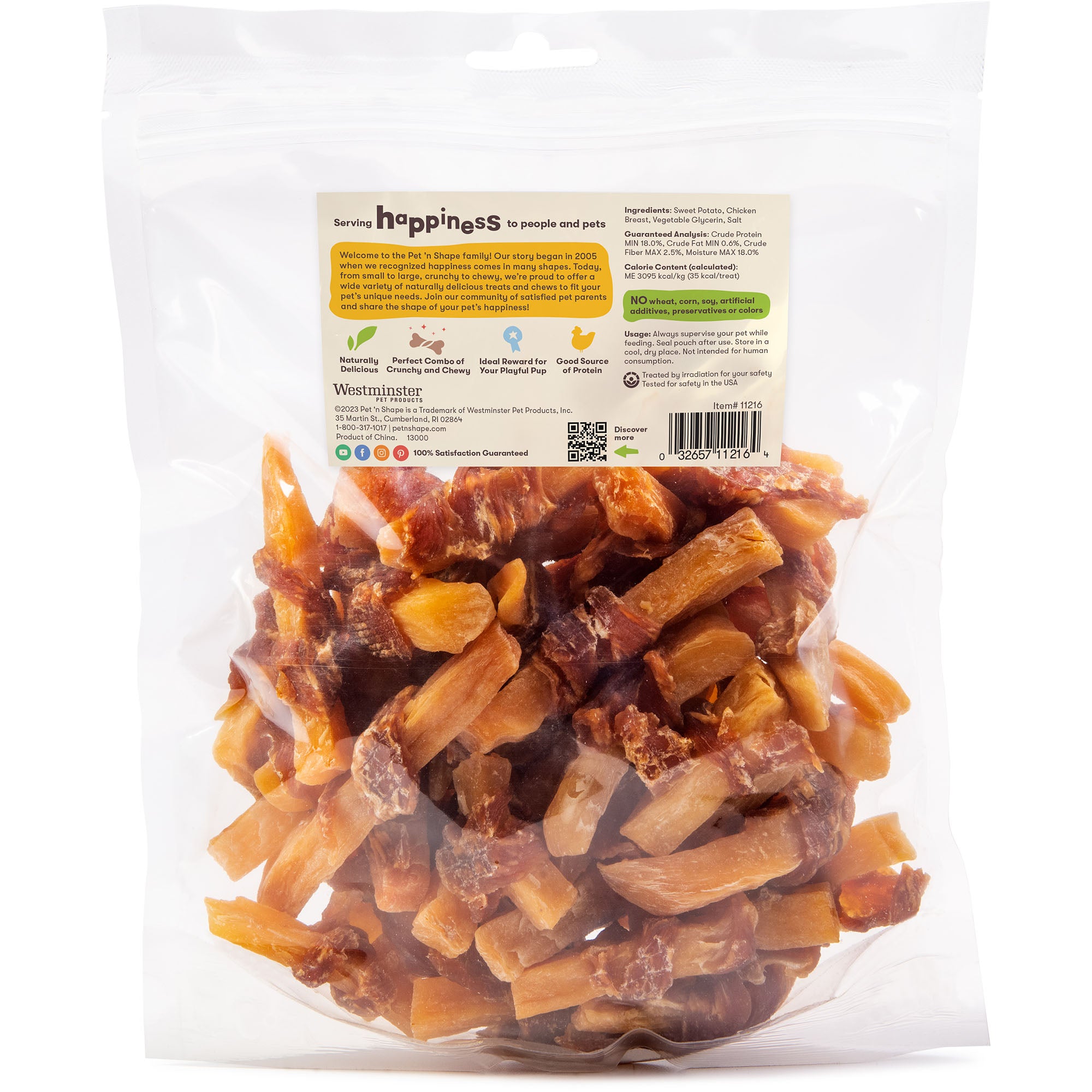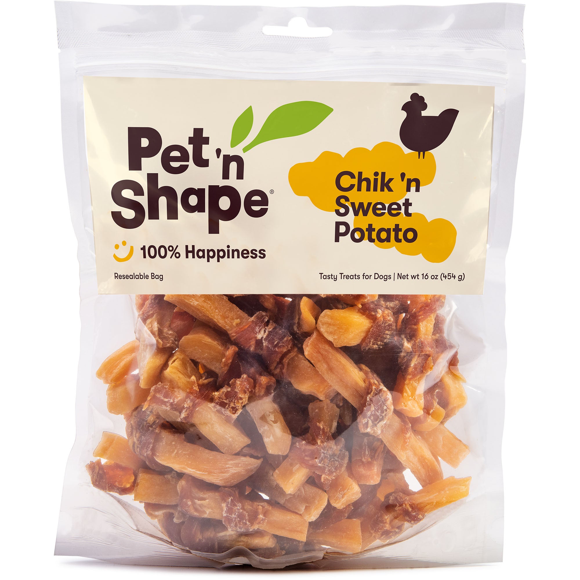 Shop / Unknown Type / Pet 'n Shape Chik 'n Sweet Potato Dog Treat 16oz Pet 'n Shape Chik 'n Sweet Potato Dog Treat 16oz Pet n Shape 16oz $26.99 16oz Purchase Options Free In-Store Pick Up Not Available Save 10% on orders $49+ Set your store for inventory and store pickup details Zip Code Search Same-day Delivery* No minimum charge for delivery orders. *Order before 2pm and have it delivered today. Orders placed after 2pm will be delivered the next day. Must be inside delivery radius. Zip Code Unfortunately delivery is not available to this address. In order to ensure the best availability accuracy, changing your selected store will remove all items from your cart. You will need to re-add these items with your newly selected store if you choose to continue. Continue Cancel Ship it to Me Quantity Add To Cart Feeding guide disclaimer ✕ Feeding guides provide a starting point for the amount of food to give your pet each day. We recommend that you keep your pet in ideal body condition and not allow them to become overweight. The amount of food your pet needs can vary based on age, activity level or other food and treats given, so be sure to work with your veterinarian to determine an appropriate weight for your pet, and to make any necessary adjustments to their feeding. Information Chik 'n Sweet Potato is a Pet 'n Shape classic and fan favorite treat! Made from naturally delicious chicken breast wrapped around a bite-sized piece of vitamin-rich sweet potato, these grain-free chewy bites are perfect for dogs of all sizes. Great for puppies, adults and seniors, Chik 'n Sweet Potato treats contain no artificial additives, preservatives, colors, or flavors. All Pet 'n Shape treats are U.S. lab tested for safety and carefully roasted to ensure optimal quality and delicious flavor. Resealable packaging locks in freshness and is ideal for easy storage. Ingredients Sweet Potato, Chicken Breast, Vegetable Glycerin, Salt Guaranteed Analysis 3,095 kcal/kg, 35 kcal/treatCrude Protein (Min) 18%, Crude Fat (Min) 0.6%, Crude Fiber (Max) 2.5%, Moisture (Max) 18% Customers also liked Customer Reviews