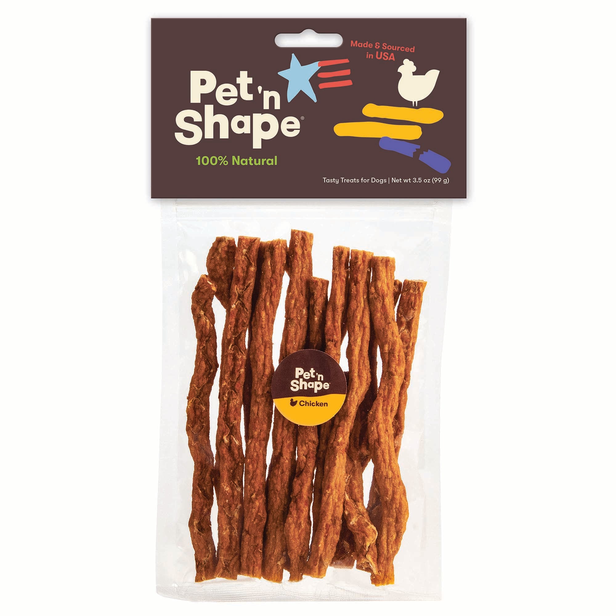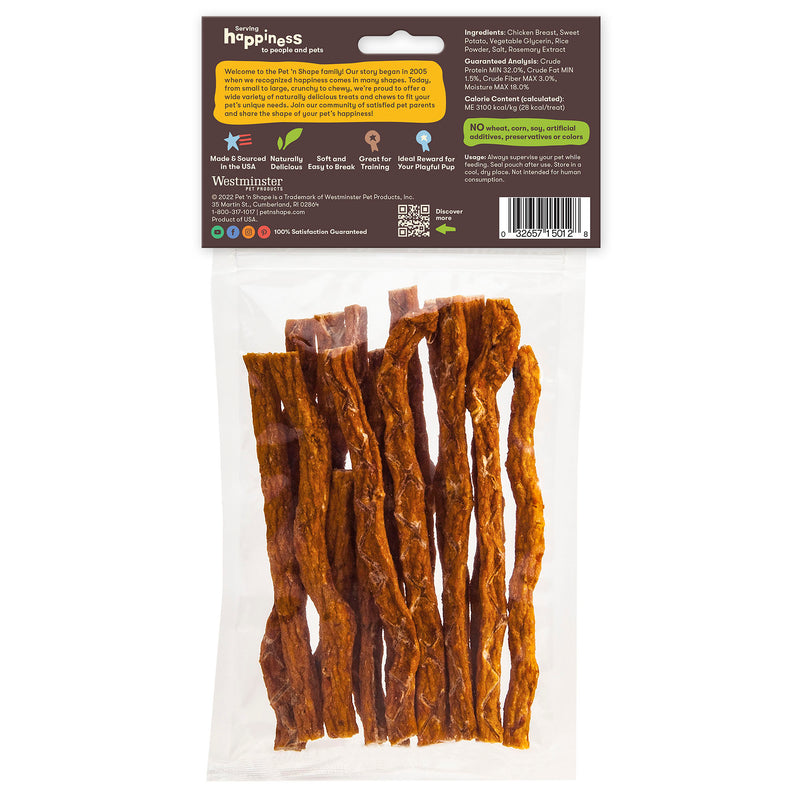 Shop / Unknown Type / Pet 'n Shape Chik 'n Sweet Potato Stix Dog Treat 3.5oz Pet 'n Shape Chik 'n Sweet Potato Stix Dog Treat 3.5oz Pet n Shape 3.5oz $12.99 3.5oz Purchase Options Free In-Store Pick Up Not Available Save 10% on orders $49+ Set your store for inventory and store pickup details Zip Code Search Same-day Delivery* No minimum charge for delivery orders. *Order before 2pm and have it delivered today. Orders placed after 2pm will be delivered the next day. Must be inside delivery radius. Zip Code Unfortunately delivery is not available to this address. In order to ensure the best availability accuracy, changing your selected store will remove all items from your cart. You will need to re-add these items with your newly selected store if you choose to continue. Continue Cancel Ship it to Me Quantity Add To Cart Feeding guide disclaimer ✕ Feeding guides provide a starting point for the amount of food to give your pet each day. We recommend that you keep your pet in ideal body condition and not allow them to become overweight. The amount of food your pet needs can vary based on age, activity level or other food and treats given, so be sure to work with your veterinarian to determine an appropriate weight for your pet, and to make any necessary adjustments to their feeding. Information Pet 'n Shape made and sourced in USA Chik ‘n Sweet Potato Stix are made from a 100% natural chicken and sweet potato medley formed into a savory stick. These deliciously chewy treats are easy to break off into smaller pieces for puppy training and are ideal for dogs of all breeds and life stages. Resealable packaging locks in freshness and is ideal for easy storage. Ingredients Chicken, Sweet Potato, Vegetable Glycerin, Rice Powder, Salt, Rosemary Extract Guaranteed Analysis 3,100 kcal/kg, 28 kcal/treatCrude Protein (Min) 32%, Crude Fat (Min) 1.5%, Crude Fiber (Max) 3%, Moisture (Max) 18% Customers also liked Customer Reviews