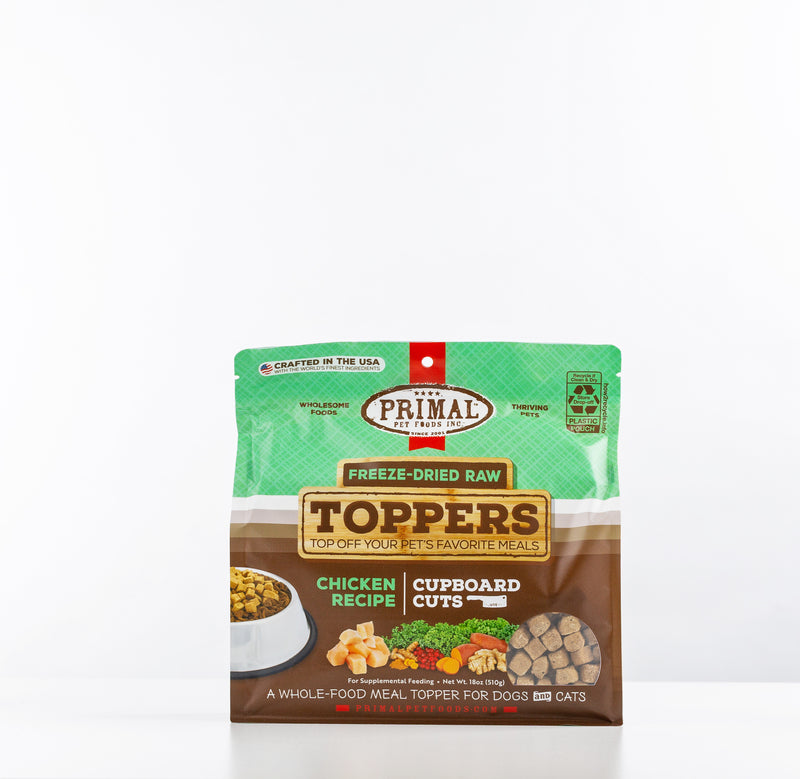 Shop / Unknown Type / Primal 18oz Chicken Cupboard Cuts Topper for Dogs & Cats Primal 18oz Chicken Cupboard Cuts Topper for Dogs & Cats Primal Pet Foods 18oz $40.99 18oz Purchase Options Free In-Store Pick Up Not Available Save 10% on orders $49+ Set your store for inventory and store pickup details Zip Code Search Same-day Delivery* No minimum charge for delivery orders. *Order before 2pm and have it delivered today. Orders placed after 2pm will be delivered the next day. Must be inside delivery radius. Zip Code Unfortunately delivery is not available to this address. In order to ensure the best availability accuracy, changing your selected store will remove all items from your cart. You will need to re-add these items with your newly selected store if you choose to continue. Continue Cancel Ship it to Me Quantity Add To Cart Feeding guide disclaimer ✕ Feeding guides provide a starting point for the amount of food to give your pet each day. We recommend that you keep your pet in ideal body condition and not allow them to become overweight. The amount of food your pet needs can vary based on age, activity level or other food and treats given, so be sure to work with your veterinarian to determine an appropriate weight for your pet, and to make any necessary adjustments to their feeding. Information Add a boost of biologically-appropriate raw nutrition to your pet’s diet! This shelf-stable meal topper is crafted in the USA with high-quality protein, certified organic fruits & vegetables, and no synthetic vitamins or minerals - just scoop onto your pet's regular meal & serve! Ingredients Chicken, Chicken Liver, Organic Sweet Potato, Organic Kale, Organic Rosemary Extract, Organic Cranberry, Organic Turmeric, Organic Ginger, Liquid Lactobacillus acidophilus fermentation product, Liquid Lactobacillus casei fermentation product, Liquid Lactobacillus reuteri fermentation product, Liquid Bifidobacterium animalis fermentation product Guaranteed Analysis Crude Protein (min) 35%, Crude Fat (min) 15%, Crude Fiber (max) 5%, Moisture (max) 7% *Microorganisms (min) 100 million CFU/kg Customers also liked Customer Reviews