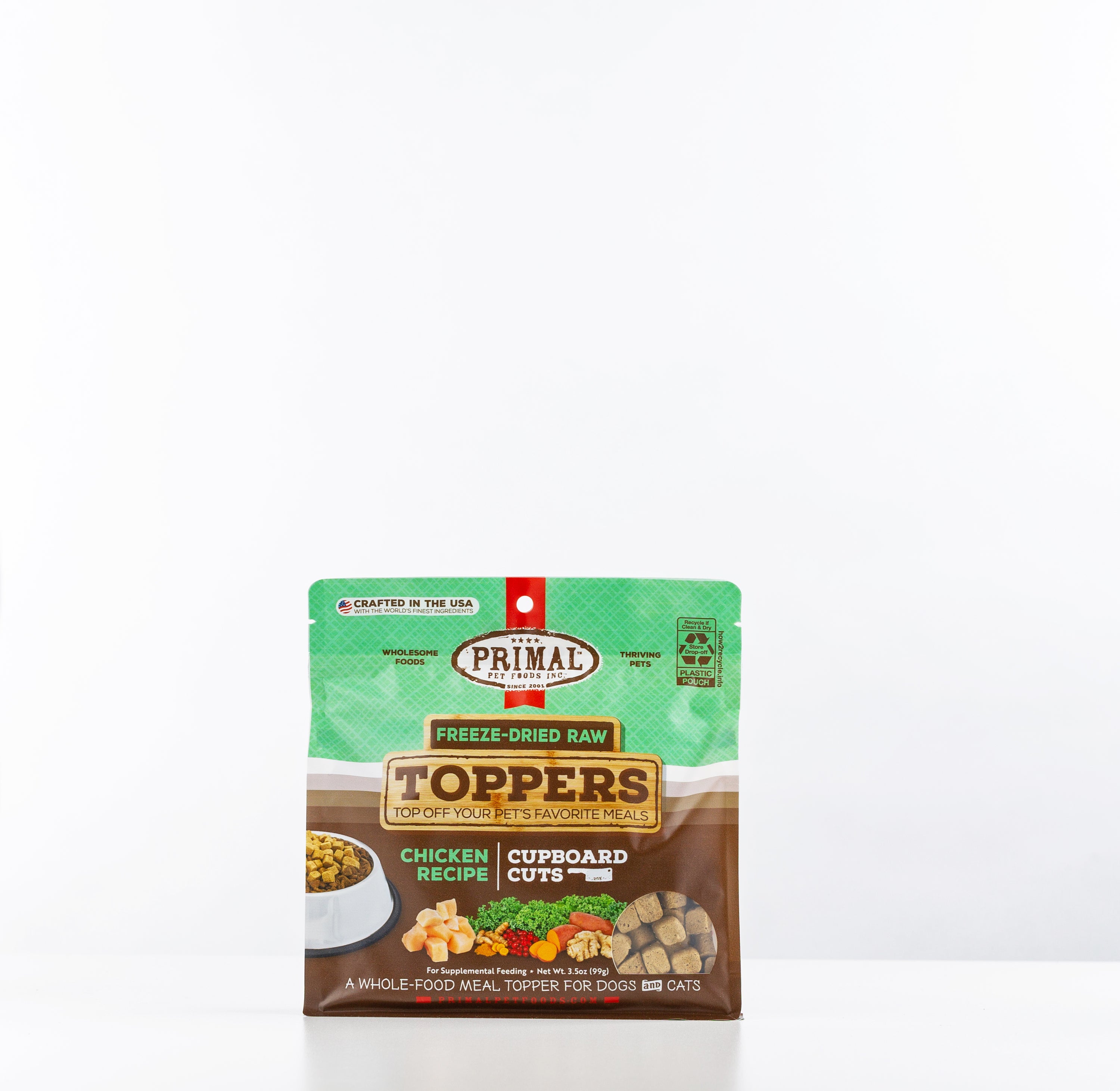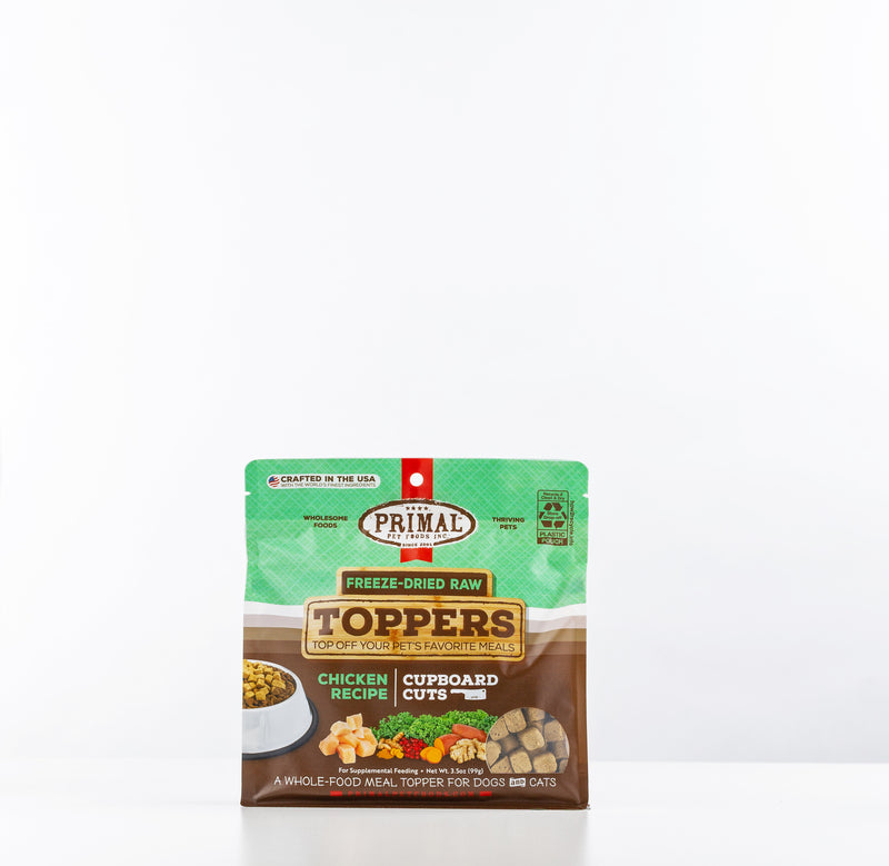Shop / Unknown Type / Primal 3.5oz Chicken Cupboard Cuts Topper for Dogs & Cats Primal 3.5oz Chicken Cupboard Cuts Topper for Dogs & Cats Primal Pet Foods 3.5oz $9.99 Buy One Get One 50% OffDiscount will apply in cart 3.5oz Purchase Options Free In-Store Pick Up Not Available Save 10% on orders $49+ Set your store for inventory and store pickup details Zip Code Search Same-day Delivery* No minimum charge for delivery orders. *Order before 2pm and have it delivered today. Orders placed after 2pm will be delivered the next day. Must be inside delivery radius. Zip Code Unfortunately delivery is not available to this address. In order to ensure the best availability accuracy, changing your selected store will remove all items from your cart. You will need to re-add these items with your newly selected store if you choose to continue. Continue Cancel Ship it to Me Quantity Add To Cart Feeding guide disclaimer ✕ Feeding guides provide a starting point for the amount of food to give your pet each day. We recommend that you keep your pet in ideal body condition and not allow them to become overweight. The amount of food your pet needs can vary based on age, activity level or other food and treats given, so be sure to work with your veterinarian to determine an appropriate weight for your pet, and to make any necessary adjustments to their feeding. Information Add a boost of biologically-appropriate raw nutrition to your pet’s diet! This shelf-stable meal topper is crafted in the USA with high-quality protein, certified organic fruits & vegetables, and no synthetic vitamins or minerals - just scoop onto your pet's regular meal & serve! Ingredient Chicken, Chicken Liver, Organic Sweet Potato, Organic Kale, Organic Rosemary, Organic Cranberry, Organic Turmeric, Organic Ginger, Liquid Lactobacillus acidophilus fermentation product, Liquid Lactobacillus casei fermentation product, Liquid Lactobacillus reuteri fermentation product, Liquid Bifidobacterium animalis fermentation product Guaranteed Analysis Crude Protein (min) 35%, Crude Fat (min) 15%, Crude Fiber (max) 5%, Moisture (max) 7% *Microorganisms (min) 100 million CFU/kg Guaranteed Analysis Crude Protein (min) 35%, Crude Fat (min) 15%, Crude Fiber (max) 5%, Moisture (max) 7% *Microorganisms (min) 100 million CFU/kg Customers also liked Customer Reviews