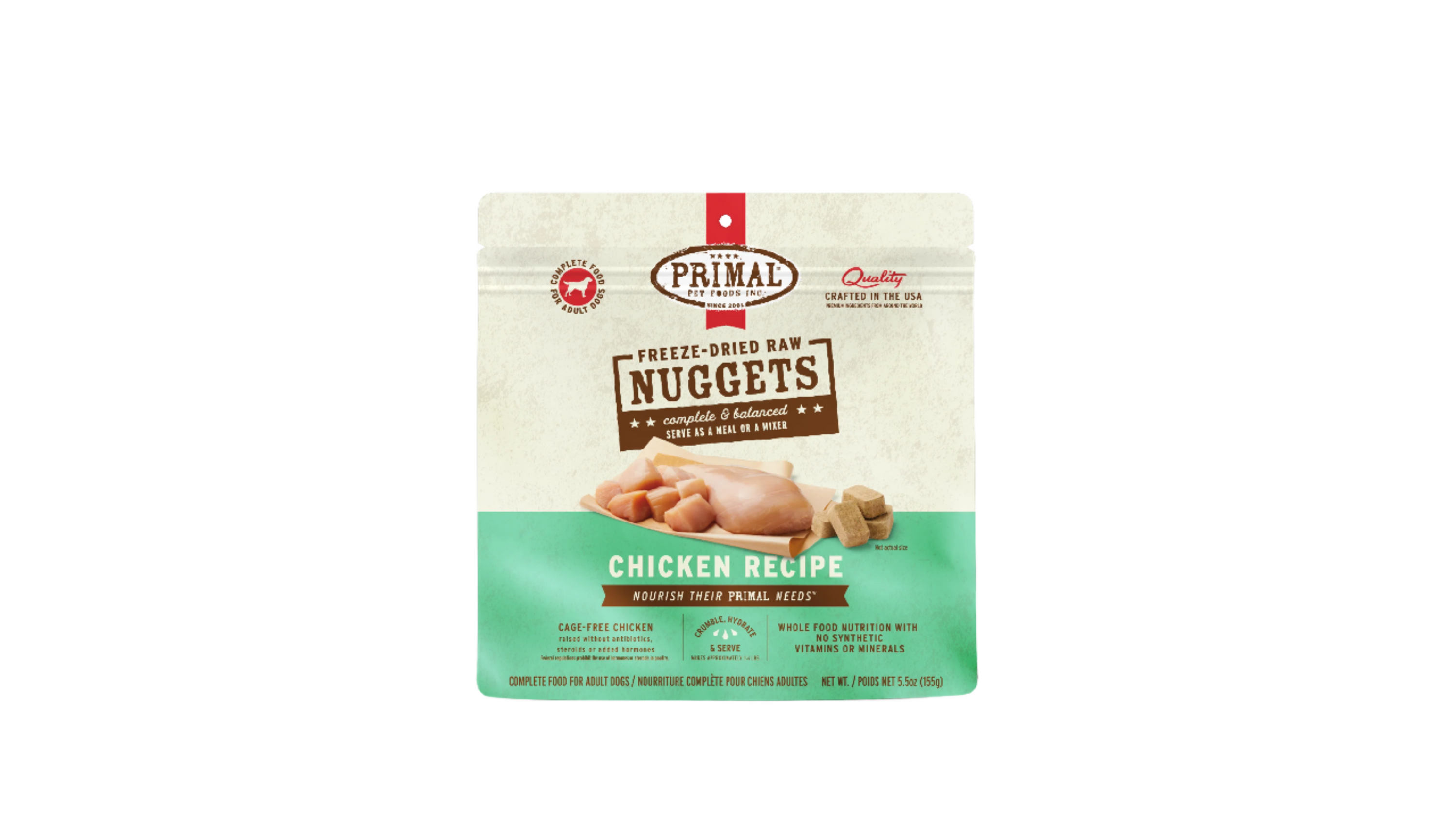 Shop / Unknown Type / Primal 5.5oz Dog Freeze-Dried Nuggets Chicken Recipe Primal 5.5oz Dog Freeze-Dried Nuggets Chicken Recipe Primal Pet Foods 5.5oz $15.99 5.5oz Purchase Options Free In-Store Pick Up Not Available Save 10% on orders $49+ Set your store for inventory and store pickup details Zip Code Search Same-day Delivery* No minimum charge for delivery orders. *Order before 2pm and have it delivered today. Orders placed after 2pm will be delivered the next day. Must be inside delivery radius. Zip Code Unfortunately delivery is not available to this address. In order to ensure the best availability accuracy, changing your selected store will remove all items from your cart. You will need to re-add these items with your newly selected store if you choose to continue. Continue Cancel Ship it to Me Quantity Add To Cart Feeding guide disclaimer ✕ Feeding guides provide a starting point for the amount of food to give your pet each day. We recommend that you keep your pet in ideal body condition and not allow them to become overweight. The amount of food your pet needs can vary based on age, activity level or other food and treats given, so be sure to work with your veterinarian to determine an appropriate weight for your pet, and to make any necessary adjustments to their feeding. Information Shelf-stable and ready to serve – just portion, shred, and rehydrate with water, Bone Broth, or Raw Goat Milk. Made with high-quality protein and Certified Organic produce, crafted especially for your canine. Ingredients Chicken (with ground bone), Chicken Livers, Organic Carrots, Organic Squash, Organic Kale, Organic Apples, Organic Parsley, Organic Pumpkin Seeds, Organic Sunflower Seeds, Organic Broccoli, Organic Blueberries, Organic Cranberries, Organic Sunflower Oil, Dried Yeast, Montmorillonite Clay, Organic Apple Cider Vinegar, Cod Liver Oil, Fish Oil, Organic Coconut Oil, Organic Rosemary Extract, Vitamin E Supplement, Organic Ground Alfalfa, Dried Organic Kelp, Liquid Lactobacillus acidophilus fermentation product, Liquid Lactobacillus casei fermentation product, Liquid Lactobacillus reuteri fermentation product, Liquid Bifidobacterium animalis fermentation product, Taurine Guaranteed Analysis Crude Protein (min) 45%, Crude Fat (min) 33%, Crude Fiber (max) 4%, Moisture (max) 8%, *Microorganisms (min) 100 million CFU/kg Customers also liked Customer Reviews