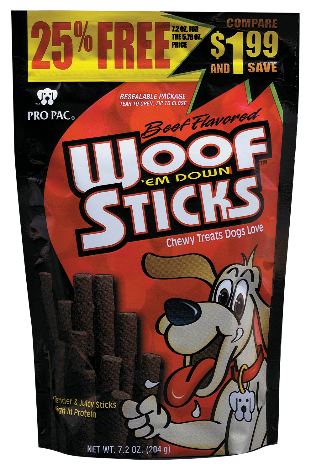 Shop / Dog Treats / Pro Pac Beef Flavored Woof 'Em Down Sticks Dog Treats Pro Pac Beef Flavored Woof 'Em Down Sticks Dog Treats Pro Pac Weight: 7.2 oz $1.99 7.2-oz Purchase Options Free In-Store Pick Up Not Available Save 10% on orders $49+ Set your store for inventory and store pickup details Zip Code Search Same-day Delivery* No minimum charge for delivery orders. *Order before 2pm and have it delivered today. Orders placed after 2pm will be delivered the next day. Must be inside delivery radius. Zip Code Unfortunately delivery is not available to this address. In order to ensure the best availability accuracy, changing your selected store will remove all items from your cart. You will need to re-add these items with your newly selected store if you choose to continue. Continue Cancel Ship it to Me Quantity Add To Cart Feeding guide disclaimer ✕ Feeding guides provide a starting point for the amount of food to give your pet each day. We recommend that you keep your pet in ideal body condition and not allow them to become overweight. The amount of food your pet needs can vary based on age, activity level or other food and treats given, so be sure to work with your veterinarian to determine an appropriate weight for your pet, and to make any necessary adjustments to their feeding. Information Dogs will go wild for PRO PAC Woof 'Em Down Sticks! That's because the juicy meaty flavor of beef is sealed in every mouth-watering bite! Specially baked in our family-owned US kitchens and packed in a convenient, resealable zip pouch, our chewy treats are a great training aid or everyday reward for your best buddy! Ingredients Porcine Meal, Wheat Flour, Chicken Meal, Soy Flour, Corn Flour, Sugar, Chicken Fat (preserved with mixed Tocopherols, a source of Vitamin E), Beef Flavor, Propylene Glycol, Liquid Smoke, Salt, Garlic, BHA (a preservative), Caramel Color, Titanium Dioxide, FD & C Food Colors Red #40 and Emerald Green. Customers also liked Customer Reviews