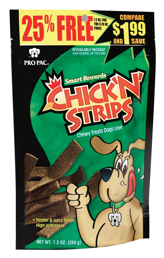 Shop / Dog Treats / Pro Pac Chick'N'Strips Dog Treats Pro Pac Chick'N'Strips Dog Treats Pro Pac Weight: 7.2 oz $1.99 7.2-oz Purchase Options Free In-Store Pick Up Not Available Save 10% on orders $49+ Set your store for inventory and store pickup details Zip Code Search Same-day Delivery* No minimum charge for delivery orders. *Order before 2pm and have it delivered today. Orders placed after 2pm will be delivered the next day. Must be inside delivery radius. Zip Code Unfortunately delivery is not available to this address. In order to ensure the best availability accuracy, changing your selected store will remove all items from your cart. You will need to re-add these items with your newly selected store if you choose to continue. Continue Cancel Ship it to Me Quantity Add To Cart Feeding guide disclaimer ✕ Feeding guides provide a starting point for the amount of food to give your pet each day. We recommend that you keep your pet in ideal body condition and not allow them to become overweight. The amount of food your pet needs can vary based on age, activity level or other food and treats given, so be sure to work with your veterinarian to determine an appropriate weight for your pet, and to make any necessary adjustments to their feeding. Information PRO PAC Chick'N'Meal Strips are an awesome treat for your dog. They're chewy, delicious and packed with the taste of yummy real chicken! Chick'N'Meal Strips chewy treats are a great training aid or everyday reward for your best buddy! Specially baked in our family-owned US kitchens and packed in a convenient, resealable zip pouch, our chewy treats are a great training aid or everyday reward for your best buddy! Ingredients Chicken Meal, Wheat Flour, Soy Flour, Corn Flour, Sugar, Chicken Fat (preserved with mixed Tocopherols, a source of Vitamin E), Natural Chicken Flavor, Propylene Glycol, Liquid Smoke, Salt, Garlic, BHA (a preservative), Caramel Color, Titanium Dioxide, FD & C Food Color Yellow #5. Customers also liked Customer Reviews
