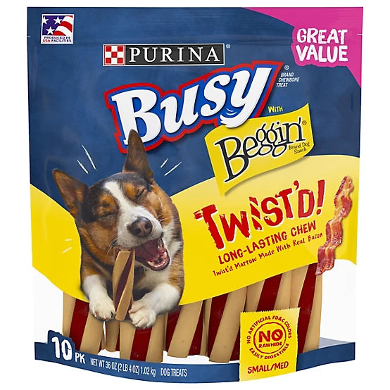 Shop / Unknown Type / Purina Busy With Beggin' Small/Medium Breed Twist'd Dog Treats, 36 oz. Purina Busy With Beggin' Small/Medium Breed Twist'd Dog Treats, 36 oz. Purina 36oz $15.99 36oz Purchase Options Free In-Store Pick Up Not Available Save 10% on orders $49+ Set your store for inventory and store pickup details Zip Code Search Same-day Delivery* No minimum charge for delivery orders. *Order before 2pm and have it delivered today. Orders placed after 2pm will be delivered the next day. Must be inside delivery radius. Zip Code Unfortunately delivery is not available to this address. In order to ensure the best availability accuracy, changing your selected store will remove all items from your cart. You will need to re-add these items with your newly selected store if you choose to continue. Continue Cancel Ship it to Me Quantity Add To Cart Feeding guide disclaimer ✕ Feeding guides provide a starting point for the amount of food to give your pet each day. We recommend that you keep your pet in ideal body condition and not allow them to become overweight. The amount of food your pet needs can vary based on age, activity level or other food and treats given, so be sure to work with your veterinarian to determine an appropriate weight for your pet, and to make any necessary adjustments to their feeding. Information Watch the hilarious antics that happen when you give your dog Purina Busy With Beggin' Twist'd Small/Medium adult dog chew treats. The mix of savory Beggin' bacon flavor along with the long-lasting Busy chew gives your dog double the fun in one dog treat. Watch him flip each time you open the pouch and the sizzling scent of bacon reaches his nose. The tasty spiral of yum helps feed his natural instinct to chew, giving him some busy work when you can't give him your full attention. These easily digestible treats are made without artificial FD and C colors, so you can feel good about serving them to your small or medium-sized dog. Made without rawhide, this engaging chew treat is ideal for adult dogs over 24 pounds. Feed this tasty Purina Busy With Beggin' Twist'd Small/Medium adult dog chew treat in addition to his well-balanced daily diet and with your vet's recommendations according to his weight, and watch the fun unroll with every twist and turn. Ingredients Rice, Glycerin, Wheat Flour, Water, Hydrogenated Corn Syrup, Brewers Dried Yeast, Wheat Gluten, Sugar, Gelatin, Bacon, Corn Germ Meal, Sodium Caseinate, Beef Tallow Naturally Preserved With Mixed-Tocopherols, Phosphoric Acid, Salt, Sorbic Acid (A Preservative), Iron Oxide Color, Calcium Propionate (A Preservative), Natural And Artificial Smoke Flavors, Bha (A Preservative), Bht (A Preservative), Calcium Carbonate, Citric Acid. D546418 Guaranteed Analysis Crude Protein (Min) 7.0% Crude Fat (Min) 2.0% Crude Fiber (Max) 1.5% Moisture (Max) 16% Customers also liked Customer Reviews