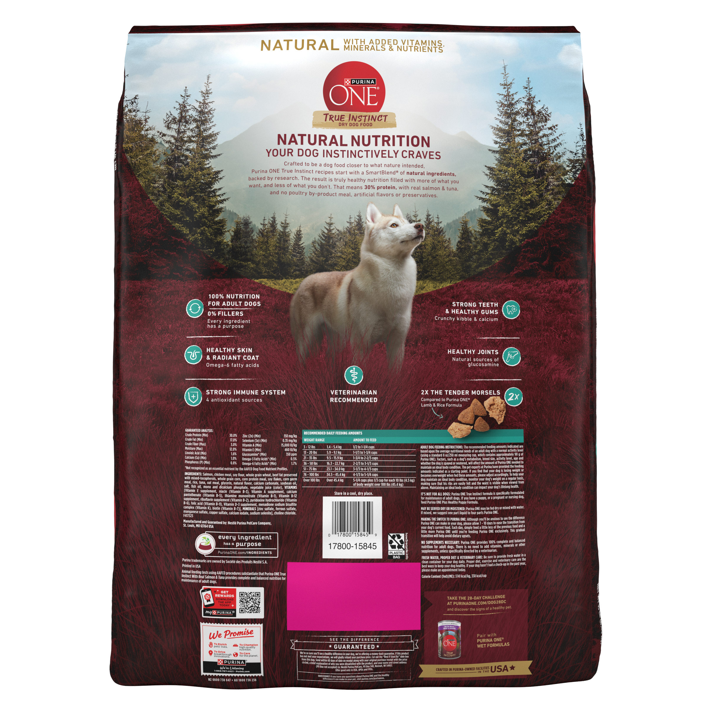Shop / Dry Dog Food / Purina ONE True Instinct With Real Salmon and Tuna Natural With Added Vitamins, Minerals and Nutrients High Protein Dog Food Dry Formula Purina ONE True Instinct With Real Salmon and Tuna Natural With Added Vitamins, Minerals and Nutrients High Protein Dog Food Dry Formula Purina ONE 15lb $32.99 15lb Purchase Options Free In-Store Pick Up Not Available Save 10% on orders $49+ Set your store for inventory and store pickup details Zip Code Search Same-day Delivery* No minimum charge for delivery orders. *Order before 2pm and have it delivered today. Orders placed after 2pm will be delivered the next day. Must be inside delivery radius. Zip Code Unfortunately delivery is not available to this address. In order to ensure the best availability accuracy, changing your selected store will remove all items from your cart. You will need to re-add these items with your newly selected store if you choose to continue. Continue Cancel Ship it to Me Quantity Add To Cart Feeding guide disclaimer ✕ Feeding guides provide a starting point for the amount of food to give your pet each day. We recommend that you keep your pet in ideal body condition and not allow them to become overweight. The amount of food your pet needs can vary based on age, activity level or other food and treats given, so be sure to work with your veterinarian to determine an appropriate weight for your pet, and to make any necessary adjustments to their feeding. Customers also liked Customer Reviews