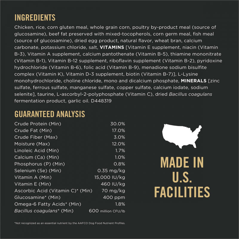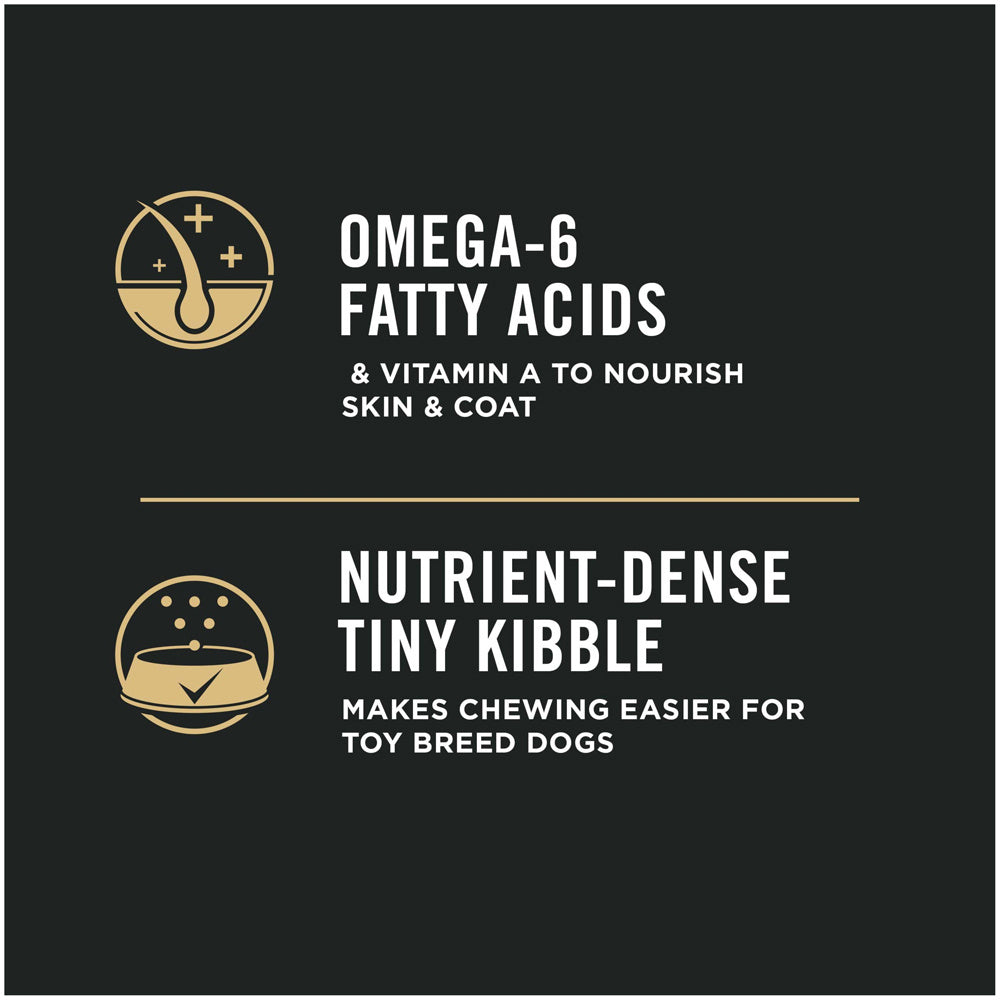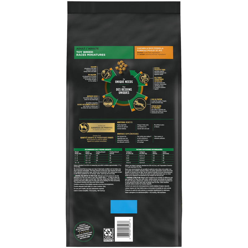 Shop / Dog Food / Purina Pro Plan Chicken & Rice Formula Toy Breed Dry Dog Food Purina Pro Plan Chicken & Rice Formula Toy Breed Dry Dog Food Purina Pro Plan Weight: 5 lb $20.99 5-lb Purchase Options Free In-Store Pick Up Not Available Save 10% on orders $49+ Set your store for inventory and store pickup details Zip Code Search Same-day Delivery* No minimum charge for delivery orders. *Order before 2pm and have it delivered today. Orders placed after 2pm will be delivered the next day. Must be inside delivery radius. Zip Code Unfortunately delivery is not available to this address. In order to ensure the best availability accuracy, changing your selected store will remove all items from your cart. You will need to re-add these items with your newly selected store if you choose to continue. Continue Cancel Ship it to Me Quantity Add To Cart Feeding guide disclaimer ✕ Feeding guides provide a starting point for the amount of food to give your pet each day. We recommend that you keep your pet in ideal body condition and not allow them to become overweight. The amount of food your pet needs can vary based on age, activity level or other food and treats given, so be sure to work with your veterinarian to determine an appropriate weight for your pet, and to make any necessary adjustments to their feeding. Information Deliver big taste and wholesome nutrition to your toy-breed dog's bowl with Purina Pro Plan Brand Dog Food Toy Breed Chicken & Rice Formula adult dry dog food. Real chicken as the first ingredient helps provide protein, which is an essential building block, while the optimal protein-to-fat ratio helps maintain an ideal body condition. Fortified with guaranteed live probiotics for digestive and immune health, this mouthwatering formula features bits of bite-sized kibble that are easy for your toy breed to chew at feeding time and a delicious flavor that keeps him coming back for more. Every ingredient in this super premium dry dog food recipe is carefully chosen for a specific nutritional or functional purpose, giving your canine companion a high-quality meal option you can both appreciate. Formulated for adult toy-breed dogs weighing under 10 pounds, this Purina Pro Plan dry dog food offers specialized nutrition for your dog's exceptional life. Ingredients : Chicken, rice, corn gluten meal, whole grain corn, poultry by-product meal (source of glucosamine), beef fat preserved with mixed-tocopherols, corn germ meal, fish meal (source of glucosamine), dried egg product, natural flavor, wheat bran, calcium carbonate, potassium chloride, salt, VITAMINS [Vitamin E supplement, niacin (Vitamin B-3), Vitamin A supplement, calcium pantothenate (Vitamin B-5), thiamine mononitrate (Vitamin B-1), Vitamin B-12 supplement, riboflavin supplement (Vitamin B-2), pyridoxine hydrochloride (Vitamin B-6), folic acid (Vitamin B-9), menadione sodium bisulfite complex (Vitamin K), Vitamin D-3 supplement, biotin (Vitamin B-7)], L-Lysine monohydrochloride, choline chloride, mono and dicalcium phosphate, MINERALS [zinc sulfate, ferrous sulfate, manganese sulfate, copper sulfate, calcium iodate, sodium selenite], taurine, L-ascorbyl-2-polyphosphate (Vitamin C), dried Bacillus coagulans fermentation product, garlic oil. Guaranteed Analysis Nutrient Guaranteed Units Crude Protein 30% min Crude Fat 17% min Crude Fiber 3% max Moisture 12% max Linoleic Acid 1.7% min Calcium 1.0% min Phosphorus 0.8% min Selenium 0.35 mg/kg min Vitamin A 15,000 IU/kg min Vitamin E 460 IU/kg Ascorbic Acid (Vitamin C) 70 mg/kg Glucosamine 400 ppm Omega-6 Fatty Acids 1.8% min Customers also liked Customer Reviews