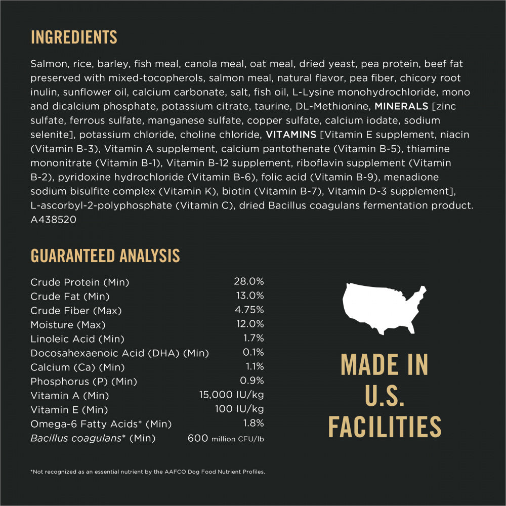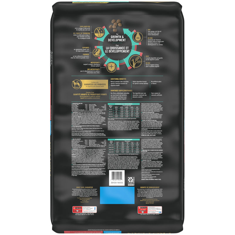Shop / Dog Food / Purina Pro Plan Development Sensitive Skin & Stomach Salmon & Rice With Probiotics Large Breed Dry Puppy Food Purina Pro Plan Development Sensitive Skin & Stomach Salmon & Rice With Probiotics Large Breed Dry Puppy Food Purina Pro Plan $52.99 16 lb 24 lb 16-lb 24-lb Purchase Options Free In-Store Pick Up Not Available Save 10% on orders $49+ Set your store for inventory and store pickup details Zip Code Search Same-day Delivery* No minimum charge for delivery orders. *Order before 2pm and have it delivered today. Orders placed after 2pm will be delivered the next day. Must be inside delivery radius. Zip Code Unfortunately delivery is not available to this address. In order to ensure the best availability accuracy, changing your selected store will remove all items from your cart. You will need to re-add these items with your newly selected store if you choose to continue. Continue Cancel Ship it to Me Quantity Add To Cart Feeding guide disclaimer ✕ Feeding guides provide a starting point for the amount of food to give your pet each day. We recommend that you keep your pet in ideal body condition and not allow them to become overweight. The amount of food your pet needs can vary based on age, activity level or other food and treats given, so be sure to work with your veterinarian to determine an appropriate weight for your pet, and to make any necessary adjustments to their feeding. Information Purina Pro Plan sensitive skin and stomach large breed dog food with probiotics is formulated for puppies with sensitive systems. Try this tasty food, made with salmon and rice. Ingredients Salmon, rice, barley, fish meal, canola meal, oat meal, dried yeast, pea protein, beef fat preserved with mixed-tocopherols, salmon meal, natural flavor, pea fiber, chicory root inulin, sunflower oil, calcium carbonate, salt, fish oil, L-Lysine monohydrochloride, mono and dicalcium phosphate, potassium citrate, taurine, DL-Methionine, MINERALS [zinc sulfate, ferrous sulfate, manganese sulfate, copper sulfate, calcium iodate, sodium selenite], potassium chloride, choline chloride, VITAMINS [Vitamin E supplement, niacin (Vitamin B-3), Vitamin A supplement, calcium pantothenate (Vitamin B-5), thiamine mononitrate (Vitamin B-1), Vitamin B-12 supplement, riboflavin supplement (Vitamin B-2), pyridoxine hydrochloride (Vitamin B-6), folic acid (Vitamin B-9), menadione sodium bisulfite complex (Vitamin K), biotin (Vitamin B-7), Vitamin D-3 supplement], L-ascorbyl-2-polyphosphate (Vitamin C), dried Bacillus coagulans fermentation product Guaranteed Analysis Nutrient Guaranteed Units Crude Protein 28% min Crude Fat 13% min Crude Fiber 4.75% max Moisture 12% max Linoleic Acid 1.7% min DHA 0.1% min Calcium 1.1% min Phosphorus 0.9% min Vitamin A 15,000 IU/kg Vitamin E 100 IU/kg Omega-6 Fatty Acids 1.8% min Customers also liked Customer Reviews