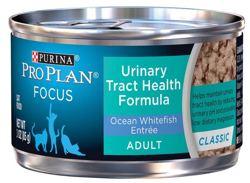 Shop / Unknown Type / Purina Pro Plan Focus Adult Urinary Tract Health Formula Ocean Whitefish Entree Canned Cat Food Purina Pro Plan Focus Adult Urinary Tract Health Formula Ocean Whitefish Entree Canned Cat Food Purina Pro Plan Weight: 3 oz, case of 24 $47.99 3-oz, case of 24 Purchase Options Free In-Store Pick Up Not Available Save 10% on orders $49+ Set your store for inventory and store pickup details Zip Code Search Same-day Delivery* No minimum charge for delivery orders. *Order before 2pm and have it delivered today. Orders placed after 2pm will be delivered the next day. Must be inside delivery radius. Zip Code Unfortunately delivery is not available to this address. In order to ensure the best availability accuracy, changing your selected store will remove all items from your cart. You will need to re-add these items with your newly selected store if you choose to continue. Continue Cancel Ship it to Me Quantity Add To Cart Feeding guide disclaimer ✕ Feeding guides provide a starting point for the amount of food to give your pet each day. We recommend that you keep your pet in ideal body condition and not allow them to become overweight. The amount of food your pet needs can vary based on age, activity level or other food and treats given, so be sure to work with your veterinarian to determine an appropriate weight for your pet, and to make any necessary adjustments to their feeding. Information Pro Plan Focus Urinary Tract Health Formula Ocean Whitefish Entree Classic is specially designed to help maintain your cat's urinary health by reducing urinary pH and providing low dietary magnesium. This formula is made with real ocean whitefish and an excellent taste. Every cat is special and you want the best for her. With over 50 formulas, Purina Pro Plan can help you find our best cat food to meet your cat's unique needs. Feed adult cats 1.0 oz per pound of body weight daily, divided into two or more meals. Vary amounts according to your cat's needs. Feed only with cat foods intended for urinary tract health. Pro Plan Focus Urinary Tract Health Formula should not be fed to pregnant or nursing cats or to kittens. For your pet's health, see your veterinarian regularly. Refrigerate unused portion. Ingredients Ocean Whitefish, Meat By-Products, Chicken, Water Sufficient for Processing, Chicken By-Products, Rice, Guar Gum, Added Color, Potassium Chloride, Salt, Vitamin E Supplement, Carrageenan, Taurine, Zinc Sulfate, Thiamine Mononitrate, Ferrous Sulfate, Niacin, Copper Sulfate, Manganese Sulfate, Calcium Pantothenate, Vitamin A Supplement, Menadione Sodium Bisulfite Complex (Source of Vitamin K Activity), Pyridoxine Hydrochloride, Riboflavin Supplement, Vitamin B-12 Supplement, Biotin, Folic Acid, Vitamin D-3 Supplement, Potassium Iodide. A-4741. Guaranteed Analysis Nutrient Guaranteed Units Crude Protein 10% min Crude Fat 6.5% min Crude Fiber 0.5% max Moisture 78% max Ash 2.8% max Potassium 0.2% min Magnesium 0.024% max Taurine 0.05% min Customers also liked Customer Reviews