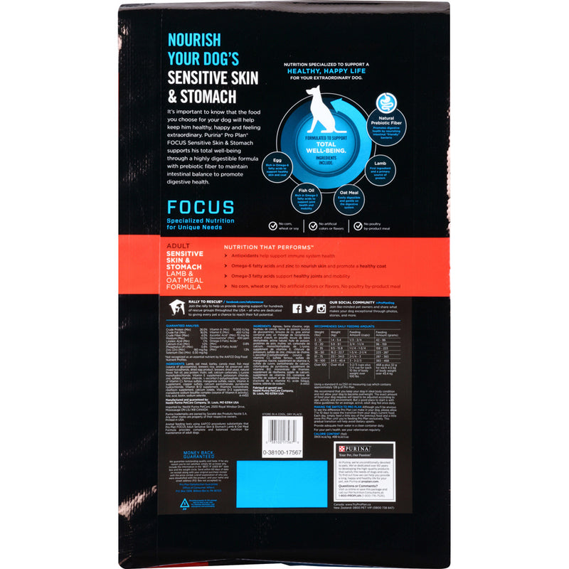Shop / Sensitive Stomach / Purina Pro Plan Focus Sensitive Skin & Stomach Formula Lamb & Oat Meal Formula Dry Dog Food Purina Pro Plan Focus Sensitive Skin & Stomach Formula Lamb & Oat Meal Formula Dry Dog Food Purina Pro Plan $54.99 16 lb 24 lb 16-lb 24-lb Purchase Options Free In-Store Pick Up Not Available Save 10% on orders $49+ Set your store for inventory and store pickup details Zip Code Search Same-day Delivery* No minimum charge for delivery orders. *Order before 2pm and have it delivered today. Orders placed after 2pm will be delivered the next day. Must be inside delivery radius. Zip Code Unfortunately delivery is not available to this address. In order to ensure the best availability accuracy, changing your selected store will remove all items from your cart. You will need to re-add these items with your newly selected store if you choose to continue. Continue Cancel Ship it to Me Quantity Add To Cart Feeding guide disclaimer ✕ Feeding guides provide a starting point for the amount of food to give your pet each day. We recommend that you keep your pet in ideal body condition and not allow them to become overweight. The amount of food your pet needs can vary based on age, activity level or other food and treats given, so be sure to work with your veterinarian to determine an appropriate weight for your pet, and to make any necessary adjustments to their feeding. Information Care for your dog's sensitive skin and stomach while still tending to his nutritional needs with Purina Pro Plan Sensitive Skin & Stomach Lamb & Oat Meal Formula adult dry dog food. This recipe is made without corn, wheat, soy or poultry by-product meal, giving your canine companion wholesome ingredients you expect from a super-premium dog food. Omega-6 fatty acids and zinc in every serving help to nourish your dog's skin and promote his healthy coat, so he can look his very best, and omega-3 fatty acids help to support his healthy joints and mobility for an active lifestyle. With high-quality ingredients chosen for a specific nutritional or functional purpose, this dry dog food recipe delivers outstanding nutrition to your best buddy's bowl every day. Make Purina Pro Plan part of his regular diet, and show him just how important his overall health and wellness are to you. Ingredients Lamb, oat meal, barley, fish meal (source of glucosamine), canola meal, rice, beef fat preserved with mixed-tocopherols, dried egg product, pea protein, dried yeast, natural flavor, fish oil, sunflower oil, chicory root inulin, salt, L-Lysine monohydrochloride, potassium chloride, calcium carbonate, VITAMINS [Vitamin E supplement, niacin (Vitamin B-3), Vitamin A supplement, calcium pantothenate (Vitamin B-5), thiamine mononitrate (Vitamin B-1), Vitamin B-12 supplement, riboflavin supplement (Vitamin B-2), pyridoxine hydrochloride (Vitamin B-6), folic acid (Vitamin B-9), menadione sodium bisulfite complex (Vitamin K), Vitamin D-3 supplement, biotin (Vitamin B-7)], MINERALS [zinc sulfate, ferrous sulfate, manganese sulfate, copper sulfate, calcium iodate, sodium selenite], choline chloride, L-ascorbyl-2-polyphosphate (Vitamin C), dried Bacillus coagulans fermentation product. Guaranteed Analysis Nutrient Guaranteed Units Crude Protein 26% min Crude Fat 16% min Crude Fiber 4% max Moisture 12% max Linoleic Acid 1.3% min Calcium 1% min Phosphorus 0.8% min Selenium 0.35 mg/kg min Vitamin A 15,000 IU/kg min Vitamin E 460 IU/kg min Ascorbic Acid (Vitamin C) 70 mg/kg min Glucosamine 400 ppm min Omega-3 Fatty Acids 0.7% min Omega-6 Fatty Acids 1.5% min Customers also liked Customer Reviews