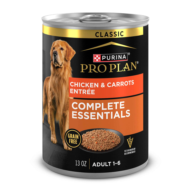 Shop / Unknown Type / Purina Pro Plan Grain Free Complete Essentials Classic Pate Dog Food, Chicken and Carrots Entrée Purina Pro Plan Grain Free Complete Essentials Classic Pate Dog Food, Chicken and Carrots Entrée Purina Pro Plan 13 oz. $2.99 13 oz. Purchase Options Free In-Store Pick Up Not Available Save 10% on orders $49+ Set your store for inventory and store pickup details Zip Code Search Same-day Delivery* No minimum charge for delivery orders. *Order before 2pm and have it delivered today. Orders placed after 2pm will be delivered the next day. Must be inside delivery radius. Zip Code Unfortunately delivery is not available to this address. In order to ensure the best availability accuracy, changing your selected store will remove all items from your cart. You will need to re-add these items with your newly selected store if you choose to continue. Continue Cancel Ship it to Me Quantity Add To Cart Feeding guide disclaimer ✕ Feeding guides provide a starting point for the amount of food to give your pet each day. We recommend that you keep your pet in ideal body condition and not allow them to become overweight. The amount of food your pet needs can vary based on age, activity level or other food and treats given, so be sure to work with your veterinarian to determine an appropriate weight for your pet, and to make any necessary adjustments to their feeding. Information Give your dog exceptional nutrition and outstanding taste without compromise when you serve Purina Pro Plan Grain Free Complete Essentials Wet Dog Food Classic Pate, Chicken and Carrots Entree. This grain free chicken dog food entree features high quality ingredients like real chicken and carrots. Every Pro Plan wet dog food serving delivers 23 essential vitamins and nutrients to his bowl, and real chicken helps provide the high-quality protein your dog needs to build lean muscle so he can run, jump and play. Purina formulates this super-premium dog food classic pate without artificial colors, flavors or preservatives. Tend to your adult dog's nutritional needs with a grain free high protein dog food that provides 100 percent complete and balanced nutrition for adult dogs. Purina proudly manufactures this no-grain dog food at Purina-owned U.S. facilities. Ingredients Chicken, Water, Liver, Meat By-Products, Carrots, Guar Gum, MINERALS [Potassium Chloride, Zinc Sulfate, Ferrous Sulfate, Copper Sulfate, Manganese Sulfate, Potassium Iodide, Sodium Selenite], Salt, Carrageenan, Fish Oil, VITAMINS [Vitamin E Supplement, Niacin (Vitamin B-3), Thiamine Mononitrate (Vitamin B-1), Calcium Pantothenate (Vitamin B-5), Pyridoxine Hydrochloride (Vitamin B-6), Vitamin B-12 Supplement, Riboflavin Supplement (Vitamin B-2), Vitamin A Supplement, Folic Acid (Vitamin B-9), Vitamin D-3 Supplement, Biotin (Vitamin B-7)], Choline Chloride. E437122 Guaranteed Analysis Crude Protein (Min)…9.0%, Crude Fat (Min)…6.0%, Crude Fiber (Max)…1.5%, Moisture (Max)…78.0% Customers also liked Customer Reviews