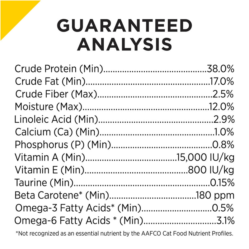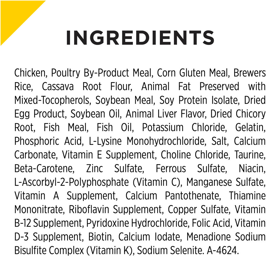 Shop / Cat Food / Purina Pro Plan Prime Plus Chicken & Rice Formula Senior Dry Cat Food Purina Pro Plan Prime Plus Chicken & Rice Formula Senior Dry Cat Food Purina Pro Plan Weight: 3.2 lb $17.99 3.2-lb Purchase Options Free In-Store Pick Up Not Available Save 10% on orders $49+ Set your store for inventory and store pickup details Zip Code Search Same-day Delivery* No minimum charge for delivery orders. *Order before 2pm and have it delivered today. Orders placed after 2pm will be delivered the next day. Must be inside delivery radius. Zip Code Unfortunately delivery is not available to this address. In order to ensure the best availability accuracy, changing your selected store will remove all items from your cart. You will need to re-add these items with your newly selected store if you choose to continue. Continue Cancel Ship it to Me Quantity Add To Cart Feeding guide disclaimer ✕ Feeding guides provide a starting point for the amount of food to give your pet each day. We recommend that you keep your pet in ideal body condition and not allow them to become overweight. The amount of food your pet needs can vary based on age, activity level or other food and treats given, so be sure to work with your veterinarian to determine an appropriate weight for your pet, and to make any necessary adjustments to their feeding. Information Serve your feline friend Purina Pro Plan Prime Plus Adult 7+ Chicken & Rice Formula dry cat food, and watch her enjoy every bite to the bottom of her bowl. This dry cat food contains a unique blend that has been proven in a 9-year study to improve and extend the lives of cats age 7+. It has all the protein your cat needs to promote lean muscle mass and help maintain a healthy weight. Featuring chicken as the #1 ingredient, the Chicken & Rice recipe is sure to impress, while giving her the balanced nutrition she needs. Our formula includes the antioxidants beta carotene and vitamin E, omega-3 fatty acids from fish oil along with omega-6 fatty acids from soybean oil, and prebiotic fiber from chicory root. This formula also contains key nutrients to help support her immune system, improve the microflora in her stomach to help maintain a balanced digestive system, and help to support your cat's healthy skin. Ingredients Chicken, Poultry By-Product Meal, Corn Gluten Meal, Brewers Rice, Cassava Root Flour, Animal Fat Preserved With Mixed-Tocopherols, Soybean Meal, Soy Protein Isolate, Dried Egg Product, Soybean Oil, Animal Liver Flavor, Dried Chicory Root, Fish Meal, Fish Oil, Potassium Chloride, Gelatin, Phosphoric Acid, L-Lysine Monohydrochloride, Salt, Calcium Carbonate, Vitamin E Supplement, Choline Chloride, Taurine, Beta-Carotene, Zinc Sulfate, Ferrous Sulfate, Niacin, L-Ascorbyl-2-Polyphosphate (Vitamin C), Manganese Sulfate, Vitamin A Supplement, Calcium Pantothenate, Thiamine Mononitrate, Riboflavin Supplement, Copper Sulfate, Vitamin B-12 Supplement, Pyridoxine Hydrochloride, Folic Acid, Vitamin D-3 Supplement, Biotin, Calcium Iodate, Menadione Sodium Bisulfite Complex (Vitamin K), Sodium Selenite. A-4624. Guaranteed Analysis Nutrient Guaranteed Units Crude Protein 38% min Crude Fat 17% min Crude Fiber 2.5% max Moisture 12% max Customers also liked Customer Reviews