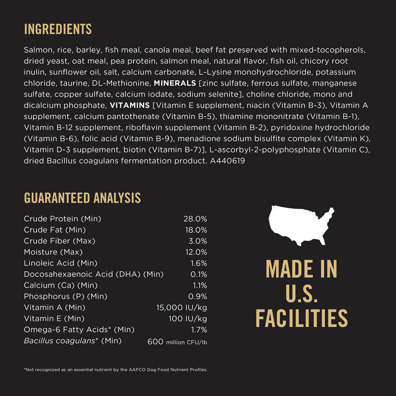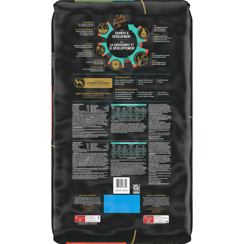 Shop / Dog Food / Purina Pro Plan Probiotic Sensitive Stomach Sensitive Skin & Stomach Salmon & Rice Formula Dry Puppy Food Purina Pro Plan Probiotic Sensitive Stomach Sensitive Skin & Stomach Salmon & Rice Formula Dry Puppy Food Purina Pro Plan $19.99 4 lb 16 lb 24 lb 4-lb 16-lb 24-lb Purchase Options Free In-Store Pick Up Not Available Save 10% on orders $49+ Set your store for inventory and store pickup details Zip Code Search Same-day Delivery* No minimum charge for delivery orders. *Order before 2pm and have it delivered today. Orders placed after 2pm will be delivered the next day. Must be inside delivery radius. Zip Code Unfortunately delivery is not available to this address. In order to ensure the best availability accuracy, changing your selected store will remove all items from your cart. You will need to re-add these items with your newly selected store if you choose to continue. Continue Cancel Ship it to Me Quantity Add To Cart Feeding guide disclaimer ✕ Feeding guides provide a starting point for the amount of food to give your pet each day. We recommend that you keep your pet in ideal body condition and not allow them to become overweight. The amount of food your pet needs can vary based on age, activity level or other food and treats given, so be sure to work with your veterinarian to determine an appropriate weight for your pet, and to make any necessary adjustments to their feeding. Information Specialized dry formula that nourishes skin and coat and supports the digestive health of puppies. Made with sunflower oil rich in omega-6 fatty acids for healthy skin and coat as well as rice that is easily digestible. Ingredients Salmon, rice, barley, fish meal, canola meal, beef fat preserved with mixed-tocopherols, dried yeast, oat meal, pea protein, salmon meal, natural flavor, fish oil, chicory root inulin, sunflower oil, salt, calcium carbonate, L-Lysine monohydrochloride, potassium chloride, taurine, DL-Methionine, MINERALS [zinc sulfate, ferrous sulfate, manganese sulfate, copper sulfate, calcium iodate, sodium selenite], choline chloride, mono and dicalcium phosphate, VITAMINS [Vitamin E supplement, niacin (Vitamin B-3), Vitamin A supplement, calcium pantothenate (Vitamin B-5), thiamine mononitrate (Vitamin B-1), Vitamin B-12 supplement, riboflavin supplement (Vitamin B-2), pyridoxine hydrochloride (Vitamin B6), folic acid (Vitamin B-9), menadione sodium bisulfite complex (Vitamin K), Vitamin D-3 supplement, biotin (Vitamin B-7)], L-ascorbyl-2-polyphosphate (Vitamin C), dried Bacillus coagulans fermentation product. Guaranteed Analysis Nutrient Guaranteed Units Crude Protein 28% min Crude Fat 18% min Crude Fiber 3% max Moisture 12% max Linoleic Acid 1.6% min DHA 0.1% min Calcium 1.1% min Phosphorus 0.9% min Vitamin A 15,000 IU/kg Vitamin E 100 IU/kg Omega-6 Fatty Acids 1.7% min Customers also liked Customer Reviews