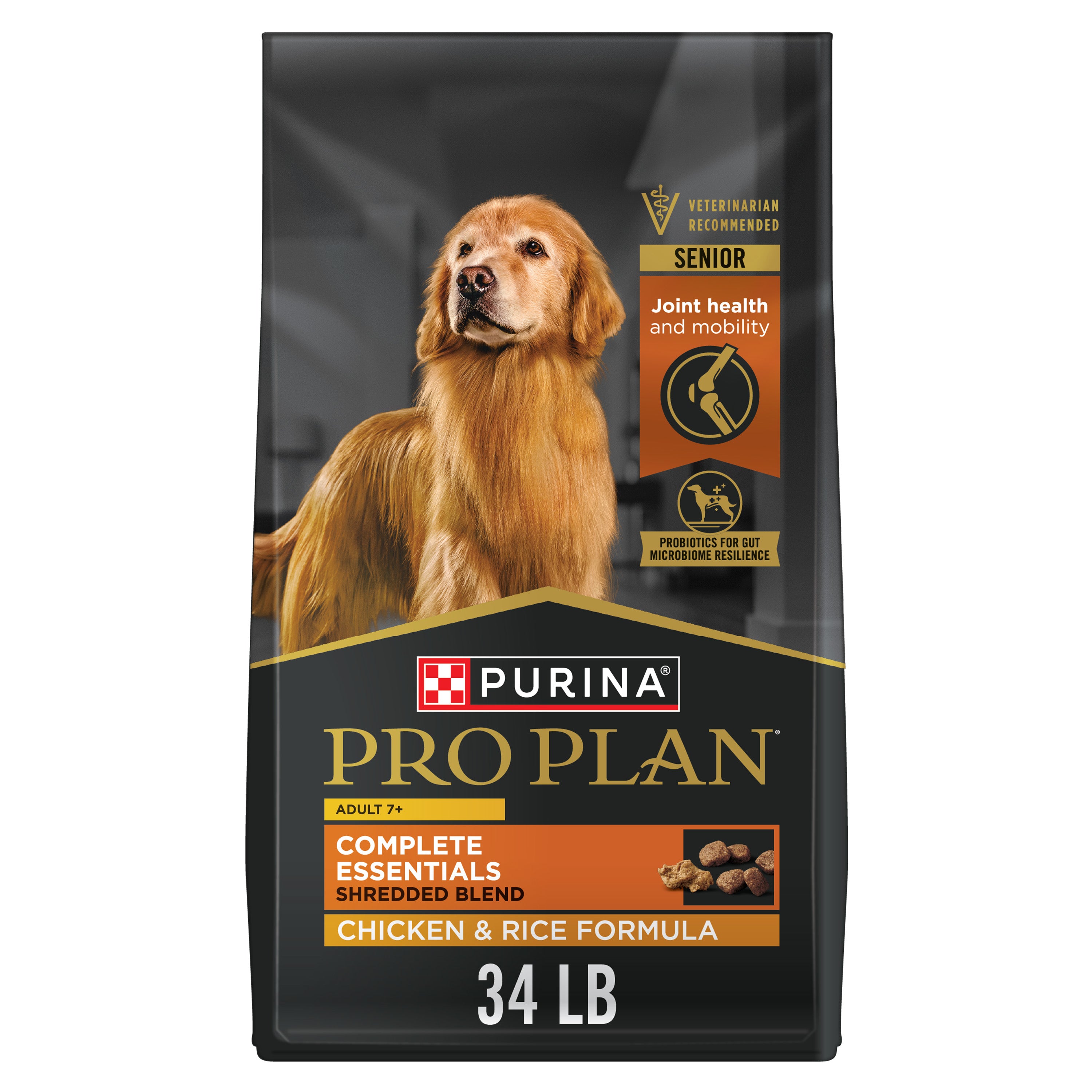 Shop / Unknown Type / Purina Pro Plan Senior Dog Food With Probiotics for Dogs, Shredded Blend Chicken & Rice Formula Purina Pro Plan Senior Dog Food With Probiotics for Dogs, Shredded Blend Chicken & Rice Formula Purina Pro Plan 34 lb. $77.99 34 lb. Purchase Options Free In-Store Pick Up Not Available Save 10% on orders $49+ Set your store for inventory and store pickup details Zip Code Search Same-day Delivery* No minimum charge for delivery orders. *Order before 2pm and have it delivered today. Orders placed after 2pm will be delivered the next day. Must be inside delivery radius. Zip Code Unfortunately delivery is not available to this address. In order to ensure the best availability accuracy, changing your selected store will remove all items from your cart. You will need to re-add these items with your newly selected store if you choose to continue. Continue Cancel Ship it to Me Quantity Add To Cart Feeding guide disclaimer ✕ Feeding guides provide a starting point for the amount of food to give your pet each day. We recommend that you keep your pet in ideal body condition and not allow them to become overweight. The amount of food your pet needs can vary based on age, activity level or other food and treats given, so be sure to work with your veterinarian to determine an appropriate weight for your pet, and to make any necessary adjustments to their feeding. Information Care for your older dog's nutritional needs while giving him the taste he loves with each bowl of Purina Pro Plan SENIOR Shredded Blend Chicken and Rice Formula Adult 7+ dry dog food. Featuring real chicken as the number 1 ingredient, this immune system support formula delivers the outstanding nutrition your senior dog needs to maintain his healthy body. Our delicious chicken and rice dog kibble recipe doesn't compromise on nutrition or flavor, creating a wholesome meal that makes you both happy. Enjoy seeing him come running for the crunchy kibble combined with tender shredded pieces for a taste and texture that dogs love. Prebiotic fiber supports beneficial bacteria in your dog's intestinal tract, while guaranteed live probiotics help support digestive and immune health. Feeding him Purina Pro Plan SENIOR Shredded Blend Chicken and Rice Formula Adult 7+ dry dog food lets you feed him what he needs to stay happy and active. Ingredients Chicken, Rice, Poultry By-Product Meal, Soybean Meal, Corn Protein Meal, Whole Grain Corn, Whole Grain Wheat, Beef Fat Preserved With Mixed-Tocopherols, Corn Germ Meal, Barley, Dried Egg Product, Fish Meal, Natural Flavor, Glycerin, Fish Oil, Wheat Bran, Calcium Carbonate, Soybean Oil, Salt, Mono And Dicalcium Phosphate, Potassium Chloride, MINERALS [Zinc Proteinate, Ferrous Sulfate, Manganese Proteinate, Copper Proteinate, Calcium Iodate, Sodium Selenite], VITAMINS [Vitamin E Supplement, Niacin (Vitamin B-3), Vitamin A Supplement, Calcium Pantothenate (Vitamin B-5), Thiamine Mononitrate (Vitamin B-1), Vitamin B-12 Supplement, Riboflavin Supplement (Vitamin B-2), Pyridoxine Hydrochloride (Vitamin B-6), Folic Acid (Vitamin B-9), Vitamin D-3 Supplement, Menadione Sodium Bisulfite Complex (Vitamin K), Biotin (Vitamin B-7)], Choline Chloride, L-Ascorbyl-2-Polyphosphate (Vitamin C), L-Lysine Monohydrochloride, Dried Bacillus Coagulans Fermentation Product, Dl-Methionine, Garlic Oil. H448623 Guaranteed Analysis Crude Protein (Min)...29.0%, Crude Fat (Min)...14.0%, Crude Fiber (Max)...3.0%, Moisture (Max)...12.0%, Linoleic Acid (Min)...1.8%, Docosahexaenoic Acid (DHA) (Min)...0.12%, Eicosapentaenoic Acid (EPA) (Min)...0.14%, Calcium (Ca) (Min)...1.0%, Phosphorus (P) (Min)...0.8%, Selenium (Se) (Min)...0.35 mg/kg, Vitamin A (Min)...14,000 IU/kg, Vitamin E (Min)...500 IU/kg, Ascorbic Acid (Vitamin C)* (Min)...70 mg/kg, Glucosamine* (Min)...500 ppm, Omega-3 Fatty Acids* (Min)...0.4%, Omega-6 Fatty Acids* (Min)...1.9%, Bacillus coagulans* (Min)...600 million CFU/lb *Not recognized as an essential nutrient by the AAFCO Dog Food Nutrient Profiles. Customers also liked Customer Reviews