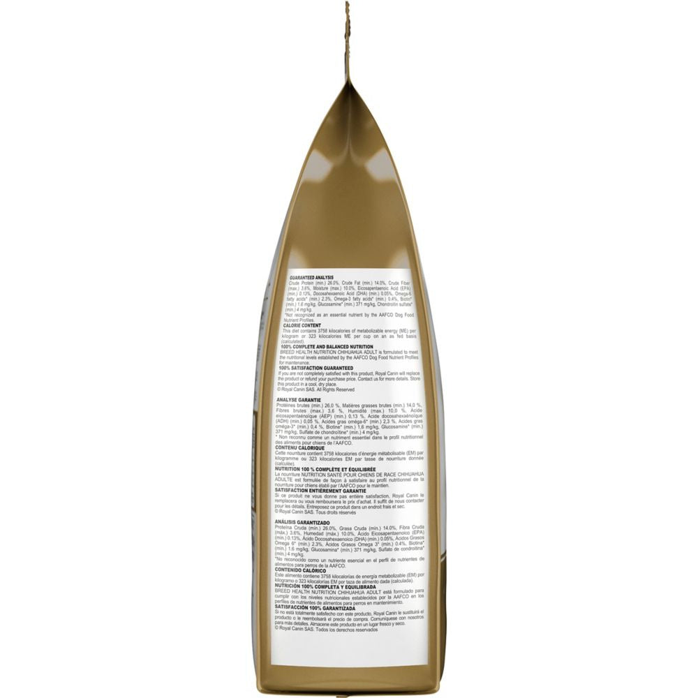 Shop / Dry Food / Royal Canin Breed Health Nutrition Chihuahua Adult Dry Dog Food Royal Canin Breed Health Nutrition Chihuahua Adult Dry Dog Food Royal Canin $65.99 10 lb 2.5 lb 10-lb 2.5-lb Purchase Options Free In-Store Pick Up Not Available Save 10% on orders $49+ Set your store for inventory and store pickup details Zip Code Search Same-day Delivery* No minimum charge for delivery orders. *Order before 2pm and have it delivered today. Orders placed after 2pm will be delivered the next day. Must be inside delivery radius. Zip Code Unfortunately delivery is not available to this address. In order to ensure the best availability accuracy, changing your selected store will remove all items from your cart. You will need to re-add these items with your newly selected store if you choose to continue. Continue Cancel Ship it to Me Quantity Add To Cart Feeding guide disclaimer ✕ Feeding guides provide a starting point for the amount of food to give your pet each day. We recommend that you keep your pet in ideal body condition and not allow them to become overweight. The amount of food your pet needs can vary based on age, activity level or other food and treats given, so be sure to work with your veterinarian to determine an appropriate weight for your pet, and to make any necessary adjustments to their feeding. Information Royal Canin knows what makes your Chihuahua magnificent is in the details. While Chihuahuas might be one of the smallest breeds in the world, these protective little pooches have big nutritional needs. They can benefit from the right diet to aid digestion, maintain a healthy coat, and satisfy their finicky appetites. Royal Canin Chihuahua Adult dog food is tailor-made nutrition created just for your pure breed Chihuahua. Whether you have a deer head, apple head, fawn, or teacup, this exclusive breed-specific diet is uniquely formulated for your Chihuahua, with the specific nutrients to help them thrive. The customized small-sized kibble is specially designed for your Chihuahua’s pointed muzzle and tiny jaw, making it easy for them to pick up and chew. Highly digestible proteins and precise fiber content support healthy digestion to promote optimal stool quality and reduce unpleasant stool odors. Optimal levels of EPA, DHA, and biotin give your Chihuahua’s smooth or long coat a beautiful shine. And the combination of kibble size, exceptional aromas, and flavors is sure to please. Mix in or complement with Royal Canin Chihuahua wet dog food for extra reinforcement when it comes to fussy eaters. Once your Chihuahua is over 8 years old, transition them to Royal Canin Chihuahua Adult 8+ dry dog food for precise nutrition into the golden years. With nearly 50 years of scientific research and observation, Royal Canin continues to deliver targeted nutrition to feed every pet’s magnificence. Not satisfied? Then neither are we. Our breed health formulas are 100% satisfaction guaranteed. (Just contact us for more details. Royal Canin Chihuahua Adult dry dog food is designed to meet the nutritional needs of purebred Chihuahuas 8 months and older Exclusive tailor-made kibble helps Chihuahuas easily pick up and chew their food Helps reduce stool odor with highly digestible proteins and precise fiber content Supports coat health with omega-3 EPA and DHA and biotin High palatability with exceptional aromas and flavors to satisfy picky appetites Ingredients Corn, chicken by-product meal, wheat gluten, oat groats, brewers rice, chicken fat, brown rice, natural flavors, dried plain beet pulp, fish oil, vegetable oil, calcium carbonate, potassium chloride, sodium silico aluminate, fructooligosaccharides, sodium tripolyphosphate, vitamins [DL-alpha tocopherol acetate (source of vitamin E), niacin supplement, L-ascorbyl-2-polyphosphate (source of vitamin C), D-calcium pantothenate, biotin, pyridoxine hydrochloride (vitamin B6), riboflavin supplement, thiamine mononitrate (vitamin B1), vitamin A acetate, folic acid, vitamin B12 supplement, vitamin D3 supplement], DL-methionine, taurine, choline chloride, L-lysine, salt, trace minerals [zinc proteinate, zinc oxide, ferrous sulfate, manganese proteinate, manganous oxide, copper sulfate, calcium iodate, sodium selenite, copper proteinate], marigold extract (Tagetes erecta L.), L-tyrosine, L-carnitine, GLA safflower oil, glucosamine hydrochloride, green tea extract, magnesium oxide, chondroitin sulfate, rosemary extract, preserved with mixed tocopherols and citric acid. Guaranteed Analysis Nutrient Guaranteed Units Crude Protein 26.0% min Crude Fat 14.0% min Crude Fiber 3.6% max Moisture 10.0% max EPA 0.13% min DHA 0.05% min Omega-6 Fatty Acids 2.3% min Omega-3 Fatty Acids 0.4% min Biotin 1.6 mg/kg min Glucosamine 371 mg/kg min Chondroitin Sulfate 4 mg/kg min Customers also liked Customer Reviews
