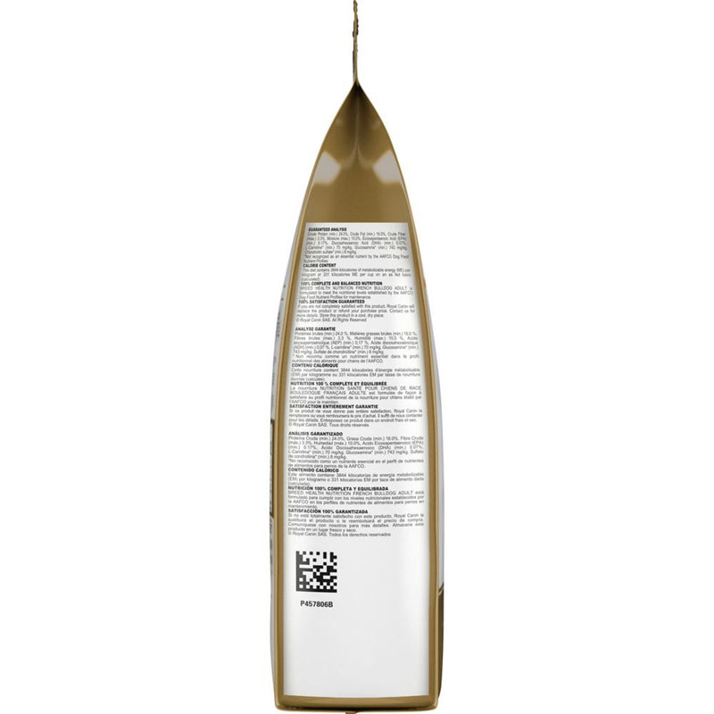 Shop / Dog Food / Royal Canin Breed Health Nutrition French Bulldog Adult Dry Dog Food Royal Canin Breed Health Nutrition French Bulldog Adult Dry Dog Food Royal Canin Weight: 17 lb $83.99 17-lb Purchase Options Free In-Store Pick Up Not Available Save 10% on orders $49+ Set your store for inventory and store pickup details Zip Code Search Same-day Delivery* No minimum charge for delivery orders. *Order before 2pm and have it delivered today. Orders placed after 2pm will be delivered the next day. Must be inside delivery radius. Zip Code Unfortunately delivery is not available to this address. In order to ensure the best availability accuracy, changing your selected store will remove all items from your cart. You will need to re-add these items with your newly selected store if you choose to continue. Continue Cancel Ship it to Me Quantity Add To Cart Feeding guide disclaimer ✕ Feeding guides provide a starting point for the amount of food to give your pet each day. We recommend that you keep your pet in ideal body condition and not allow them to become overweight. The amount of food your pet needs can vary based on age, activity level or other food and treats given, so be sure to work with your veterinarian to determine an appropriate weight for your pet, and to make any necessary adjustments to their feeding. Information Royal Canin knows what makes your French Bulldog magnificent is in the details. With their pointy bat ears, Frenchies are adorable miniature bulldogs with extremely flat muzzles. They can benefit from a diet that’s easy for them to eat, provides muscle support, and aids with digestion to help cut down on their not-so-adorable gas. Royal Canin French Bulldog Adult dog food is tailor-made nutrition created just for your pure breed French Bulldog. This exclusive breed-specific diet is uniquely formulated for your French Bulldog, with the specific nutrients to help them thrive. The customized curved-shaped kibble is specially designed for your French Bulldog’s short muzzle and underbite, making it easy for them to pick up and chew. Precise protein content and L-carnitine support healthy muscles. Exclusive nutrients reinforce the skin barrier for healthy skin. And a combination of highly digestible proteins, precise fiber content, and high-quality carbohydrate sources supports healthy digestion to help decrease flatulence and unpleasant stool odors. With nearly 50 years of scientific research and observation, Royal Canin continues to deliver targeted nutrition to feed every pet’s magnificence. Not satisfied? Then neither are we. Our breed health formulas are 100% satisfaction guaranteed. (Just contact us for more details. Ingredients Brewers rice, wheat, chicken by-product meal, chicken fat, wheat gluten, pork meal, natural flavors, dried plain beet pulp, fish oil, vegetable oil, sodium silico aluminate, potassium chloride, salt, calcium carbonate, fructooligosaccharides, sodium tripolyphosphate, vitamins [DL-alpha tocopherol acetate (source of vitamin E), niacin supplement, L-ascorbyl-2-polyphosphate (source of vitamin C), D-calcium pantothenate, biotin, pyridoxine hydrochloride (vitamin B6), riboflavin supplement, thiamine mononitrate (vitamin B1), vitamin A acetate, folic acid, vitamin B12 supplement, vitamin D3 supplement], choline chloride, L-tyrosine, glucosamine hydrochloride, marigold extract (Tagetes erecta L.), taurine, DL-methionine, trace minerals [zinc proteinate, zinc oxide, ferrous sulfate, manganese proteinate, manganous oxide, copper sulfate, calcium iodate, sodium selenite, copper proteinate], L-lysine, magnesium oxide, green tea extract, L-carnitine, chondroitin sulfate, rosemary extract, preserved with mixed tocopherols and citric acid. Guaranteed Analysis Nutrient Guaranteed Units Crude Protein 24.0% min Crude Fat 16.0% min Crude Fiber 3.3% max Moisture 10.0% max EPA 0.17% min DHA 0.07% min L-Carnitine 70 mg/kg min Glucosamine 743 mg/kg min Chondroitin Sulfate 8 mg/kg min Customers also liked Customer Reviews