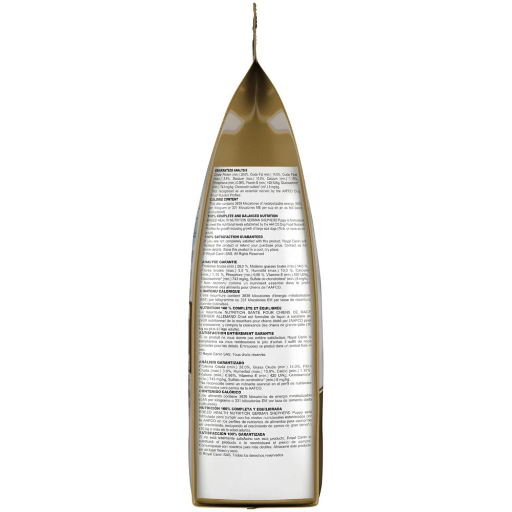 Shop / Dry Food / Royal Canin Breed Health Nutrition German Shepherd Puppy Dry Dog Food Royal Canin Breed Health Nutrition German Shepherd Puppy Dry Dog Food Royal Canin Weight: 30 lb $125.99 30-lb Purchase Options Free In-Store Pick Up Not Available Save 10% on orders $49+ Set your store for inventory and store pickup details Zip Code Search Same-day Delivery* No minimum charge for delivery orders. *Order before 2pm and have it delivered today. Orders placed after 2pm will be delivered the next day. Must be inside delivery radius. Zip Code Unfortunately delivery is not available to this address. In order to ensure the best availability accuracy, changing your selected store will remove all items from your cart. You will need to re-add these items with your newly selected store if you choose to continue. Continue Cancel Ship it to Me Quantity Add To Cart Feeding guide disclaimer ✕ Feeding guides provide a starting point for the amount of food to give your pet each day. We recommend that you keep your pet in ideal body condition and not allow them to become overweight. The amount of food your pet needs can vary based on age, activity level or other food and treats given, so be sure to work with your veterinarian to determine an appropriate weight for your pet, and to make any necessary adjustments to their feeding. Information Royal Canin knows what makes your German Shepherd puppy magnificent is in the details. These highly intelligent and playful puppies have big nutritional needs as they develop into faithful watchdogs. They can benefit from the right large breed growth formula to provide immune system support and bone and joint health—as well as support digestive health—all of which is important for the breed during puppyhood. Royal Canin German Shepherd dry puppy food is tailor-made nutrition created just for your pure breed puppy. Whether you call them a German Shepherd or an Alsatian, this exclusive breed-specific diet is uniquely formulated to your puppy, with the specific nutrients to help them thrive. The unique kibble shape and texture are specially designed for your German Shepherd’s long, strong muzzle and teeth, encouraging them to chew. An exclusive mix of antioxidants and vitamin E supports their developing immune system and keeps their body growing strong. Highly digestible proteins and specific fibers maintain digestive health since this breed has a tendency to have poor stool quality. And glucosamine and chondroitin support healthy bones and joints as your puppy grows to be a big dog. Once your German Shepherd puppy is over 15 months old, transition them to Royal Canin German Shepherd Adult dog food for precise nutrition into their adult years. With nearly 50 years of scientific research and observation, Royal Canin continues to deliver targeted nutrition to feed every pet’s magnificence. Not satisfied? Then neither are we. Our breed health formulas are 100% satisfaction guaranteed. (Just contact us for more details. Ingredients Chicken by-product meal, wheat gluten, corn, oat groats, brewers rice, corn gluten meal, chicken fat, brewers rice flour, brown rice, natural flavors, dried plain beet pulp, fish oil, sodium silico aluminate, monocalcium phosphate, vegetable oil, calcium carbonate, pea fiber, potassium chloride, psyllium seed husk, L-lysine, salt, fructooligosaccharides, sodium tripolyphosphate, vitamins [DL-alpha tocopherol acetate (source of vitamin E), niacin supplement, L-ascorbyl-2-polyphosphate (source of vitamin C), D-calcium pantothenate, biotin, pyridoxine hydrochloride (vitamin B6), riboflavin supplement, thiamine mononitrate (vitamin B1), vitamin A acetate, folic acid, vitamin B12 supplement, vitamin D3 supplement], hydrolyzed yeast (source of betaglucans), choline chloride, taurine, DL-methionine, glucosamine hydrochloride, trace minerals [zinc proteinate, zinc oxide, manganese proteinate, ferrous sulfate, manganous oxide, copper sulfate, calcium iodate, sodium selenite, copper proteinate], marigold extract (Tagetes erecta L.), Yucca schidigera extract, chondroitin sulfate, carotene, rosemary extract, preserved with mixed tocopherols and citric acid. Guaranteed Analysis Nutrient Guaranteed Units Crude Protein 28.0% min Crude Fat 14.0% min Crude Fiber 3.8% max Moisture 10.0% max Calcium 0.94% min Phosphorus 0.96% min Vitamin E 420 IU/kg min Glucosamine 743 mg/kg min Chondroitin Sulfate 8 mg/kg min Customers also liked Customer Reviews