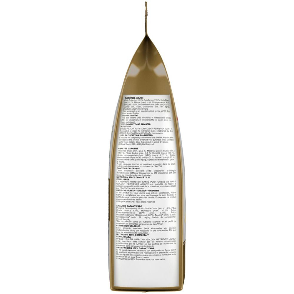 Shop / Dry Food / Royal Canin Breed Health Nutrition Golden Retriever Adult Dry Dog Food Royal Canin Breed Health Nutrition Golden Retriever Adult Dry Dog Food Royal Canin Weight: 30 lb $115.99 30-lb Purchase Options Free In-Store Pick Up Not Available Save 10% on orders $49+ Set your store for inventory and store pickup details Zip Code Search Same-day Delivery* No minimum charge for delivery orders. *Order before 2pm and have it delivered today. Orders placed after 2pm will be delivered the next day. Must be inside delivery radius. Zip Code Unfortunately delivery is not available to this address. In order to ensure the best availability accuracy, changing your selected store will remove all items from your cart. You will need to re-add these items with your newly selected store if you choose to continue. Continue Cancel Ship it to Me Quantity Add To Cart Feeding guide disclaimer ✕ Feeding guides provide a starting point for the amount of food to give your pet each day. We recommend that you keep your pet in ideal body condition and not allow them to become overweight. The amount of food your pet needs can vary based on age, activity level or other food and treats given, so be sure to work with your veterinarian to determine an appropriate weight for your pet, and to make any necessary adjustments to their feeding. Information Royal Canin knows what makes your Golden Retriever magnificent is in the details. Goldens are big, lovable canines prized for their playful personalities, trainability, and long, gorgeous coats. They can benefit from the right diet to help maintain a healthy skin and coat, and provide weight control to help support the bones and joints of this active, large breed. Royal Canin Golden Retriever Adult dog food is tailor-made nutrition created just for your pure breed Golden Retriever. This exclusive breed-specific diet is uniquely formulated for your Golden Retriever with specific nutrients to help them thrive. The unique kibble shape and texture are specially designed for your Golden’s straight muzzle and scissor bite, encouraging them to chew. Exclusive nutrients help reinforce the skin barrier to protect skin and help maintain a beautiful golden, long coat. Essential nutrients like taurine, EPA, and DHA help support heart health. And a precise amount of calories and fat helps maintain your Golden at a healthy weight. Mix in or complement with Royal Canin Golden Retriever wet dog food for a meal that’s sure to please your pedigree. With nearly 50 years of scientific research and observation, Royal Canin continues to deliver targeted nutrition to feed every pet’s magnificence. Not satisfied? Then neither are we. Our breed health formulas are 100% satisfaction guaranteed. (Just contact us for more details. Ingredients Brown rice, chicken by-product meal, oat groats, brewers rice, wheat, corn gluten meal, chicken fat, natural flavors, powdered cellulose, dried plain beet pulp, wheat gluten, fish oil, dried tomato pomace, vegetable oil, sodium silico aluminate, calcium carbonate, potassium chloride, psyllium seed husk, salt, fructooligosaccharides, vitamins [DL-alpha tocopherol acetate (source of vitamin E), niacin supplement, L-ascorbyl-2-polyphosphate (source of vitamin C), D-calcium pantothenate, biotin, pyridoxine hydrochloride (vitamin B6), riboflavin supplement, thiamine mononitrate (vitamin B1), vitamin A acetate, folic acid, vitamin B12 supplement, vitamin D3 supplement], sodium tripolyphosphate, L-lysine, taurine, choline chloride, monocalcium phosphate, glucosamine hydrochloride, DL-methionine, L-carnitine, trace minerals [zinc proteinate, zinc oxide, ferrous sulfate, manganese proteinate, manganous oxide, copper sulfate, calcium iodate, sodium selenite, copper proteinate], GLA safflower oil, marigold extract (Tagetes erecta L.), green tea extract, magnesium oxide, chondroitin sulfate, rosemary extract, preserved with mixed tocopherols and citric acid. Guaranteed Analysis Nutrient Guaranteed Units Crude Protein 23.0% min Crude Fat 11.0% min Crude Fiber 5.7% max Moisture 10.0% max EPA 0.17% min DHA 0.07% min Taurine 0.20% min Glucosamine 891 mg/kg min Chondroitin Sulfate 9 mg/kg min Customers also liked Customer Reviews
