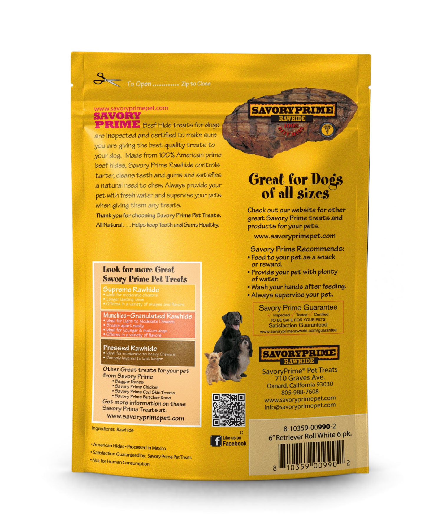 Shop / Unknown Type / Savory Prime 6” Supreme Retriever Roll White for Dogs - 6 pk Savory Prime 6” Supreme Retriever Roll White for Dogs - 6 pk Savory Prime 6 pack $15.99 Buy One Get One 50% OffDiscount will apply in cart 6 pack Purchase Options Free In-Store Pick Up Not Available Save 20% on orders $100+ Set your store for inventory and store pickup details Zip Code Search Same-day Delivery* No minimum charge for delivery orders. *Order before 2pm and have it delivered today. Orders placed after 2pm will be delivered the next day. Must be inside delivery radius. Zip Code Unfortunately delivery is not available to this address. In order to ensure the best availability accuracy, changing your selected store will remove all items from your cart. You will need to re-add these items with your newly selected store if you choose to continue. Continue Cancel Ship it to Me Quantity Add To Cart Feeding guide disclaimer ✕ Feeding guides provide a starting point for the amount of food to give your pet each day. We recommend that you keep your pet in ideal body condition and not allow them to become overweight. The amount of food your pet needs can vary based on age, activity level or other food and treats given, so be sure to work with your veterinarian to determine an appropriate weight for your pet, and to make any necessary adjustments to their feeding. Information Dogs love Savory Prime Retriever Rolls. These rawhide chews come from 100% American prime beef hides, oven dried to perfection in our very own certified plant located in Mexico. All of our products are inspected and tested, following strict GFSI food quality standards, and come with a satisfaction guarantee. Savory Prime Rawhide controls tartar, helps clean teeth and gums, and satisfies your dog's natural need to chew. Ingredient: Rawhide Customers also liked Customer Reviews