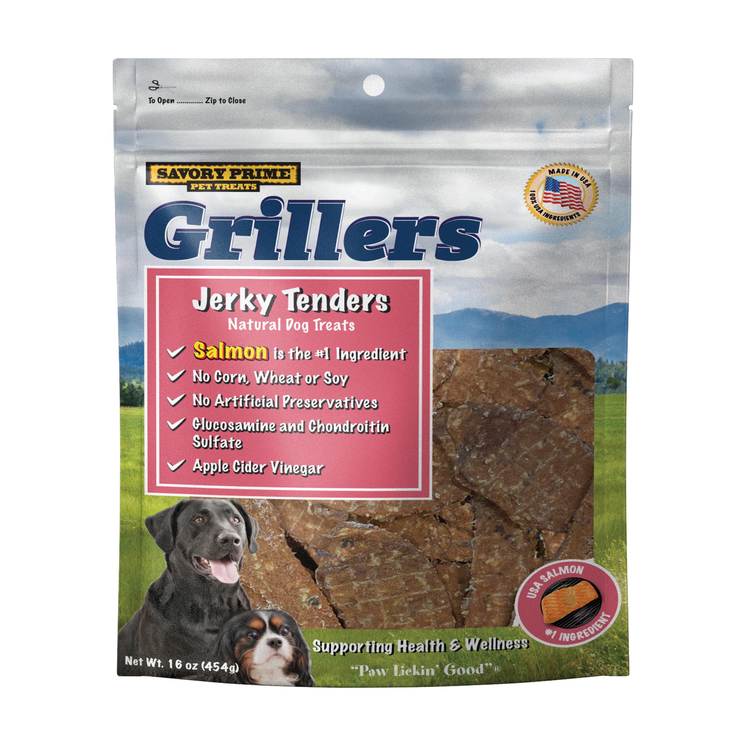 Shop / Unknown Type / Savory Prime Salmon Grillers Salmon Tender Dog treat 16oz Savory Prime Salmon Grillers Salmon Tender Dog treat 16oz Savory Prime 16oz $21.99 16oz Purchase Options Free In-Store Pick Up Not Available Save 10% on orders $49+ Set your store for inventory and store pickup details Zip Code Search Same-day Delivery* No minimum charge for delivery orders. *Order before 2pm and have it delivered today. Orders placed after 2pm will be delivered the next day. Must be inside delivery radius. Zip Code Unfortunately delivery is not available to this address. In order to ensure the best availability accuracy, changing your selected store will remove all items from your cart. You will need to re-add these items with your newly selected store if you choose to continue. Continue Cancel Ship it to Me Quantity Add To Cart Feeding guide disclaimer ✕ Feeding guides provide a starting point for the amount of food to give your pet each day. We recommend that you keep your pet in ideal body condition and not allow them to become overweight. The amount of food your pet needs can vary based on age, activity level or other food and treats given, so be sure to work with your veterinarian to determine an appropriate weight for your pet, and to make any necessary adjustments to their feeding. Information Slow oven roasted, super tender and easy to tear treats. Made with high-quality protein from USA sourced protein Ingredients Salmon; Pea Powder; Vegetable Glycerin; Pea Protein; Ground Rice; Salt; Colored with Paprika; Natural Smoke flavor; Apple Cider Vinegar; Sugar; Glucosamine Hydrochloride Guaranteed Analysis Crude Protein min 25%, Crude Fat min 12%, Crude Fiber Max 2%, Moisture Max 20%, Glucosomine Hydrochloride min 1000 mg/kg, Chondroitin Sulfate miin 500 mg/kg Customers also liked Customer Reviews