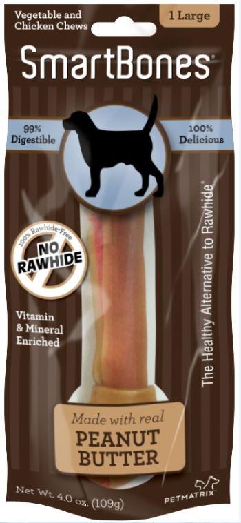 Shop / Unknown Type / SmartBones Large Peanut Butter Chew Bones Dog Treats SmartBones Large Peanut Butter Chew Bones Dog Treats SmartBones 3 pack $16.99 3-pack Purchase Options Free In-Store Pick Up Not Available Save 10% on orders $49+ Set your store for inventory and store pickup details Zip Code Search Same-day Delivery* No minimum charge for delivery orders. *Order before 2pm and have it delivered today. Orders placed after 2pm will be delivered the next day. Must be inside delivery radius. Zip Code Unfortunately delivery is not available to this address. In order to ensure the best availability accuracy, changing your selected store will remove all items from your cart. You will need to re-add these items with your newly selected store if you choose to continue. Continue Cancel Ship it to Me Quantity Add To Cart Feeding guide disclaimer ✕ Feeding guides provide a starting point for the amount of food to give your pet each day. We recommend that you keep your pet in ideal body condition and not allow them to become overweight. The amount of food your pet needs can vary based on age, activity level or other food and treats given, so be sure to work with your veterinarian to determine an appropriate weight for your pet, and to make any necessary adjustments to their feeding. Information SmartBones is the next generation dog chew that has all the benefits of a rawhide chew – without the rawhide. Many veterinarians are concerned with the potential health risks associated with dogs consuming rawhide. SmartBones chews, made with real chicken, vegetables and other healthy ingredients, provide your dog with needed chewing exercise and great taste. Independent digestibility studies show that SmartBones chews are over 99% digestible and tests demonstrate that 9 out of 10 dogs prefer these chews over the leading rawhide chews. -Great taste -Safe: rawhide-free -Chewing activity promotes healthy dental care -First chew of its kind to be fortified with vitamins and minerals -SmartBones Large measures about 6.5 inches -SmartBones Large are for dogs 40 lbs and over. Ingredients Corn, Chicken, Sorbitol, Glycerin, Fructose, Pork Gelatin, Peanut Butter, Barley Malt Syrup, Maltodextrin, Sweet Potatoes, Peas, Carrots, Dicalcium Phosphate, Salt, Ferrous Sulfate, Titanium Dioxide, Zinc Sulfate, Artificial Flavor, Niacinamide, Xanthan Gum, Potassium Sorbate (preservative), Sodium Pyrophosphate, Sodium Propionate (preservative), Sodium Tripolyphosphate, Vitamin E, d-Calcium Pantothenate, Riboflavin Supplement, Thiamine Hydrochloride, Pyridoxine Hydrochloride, Manganese Sulfate, Vitamin B12 Supplement, FD&C Red 40. Guaranteed Analysis Nutrient Guaranteed Units Crude Protein 9% min Crude Fat 0.2% min Crude Fiber 1.5% max Moisture 14% max Manganese 3.5 mg/kg min Vitamin E 100 iu/kg min Customers also liked Customer Reviews