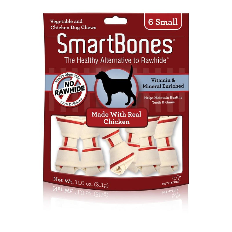 Shop / Treats / SmartBones Rawhide-Free Chicken Dog Treats SmartBones Rawhide-Free Chicken Dog Treats SmartBones $12.99 9 oz, Mini 16 Pack 11 oz, Small 6 Pack 9-oz, Mini 16-Pack 11-oz, Small 6-Pack Purchase Options Free In-Store Pick Up Not Available Save 10% on orders $49+ Set your store for inventory and store pickup details Zip Code Search Same-day Delivery* No minimum charge for delivery orders. *Order before 2pm and have it delivered today. Orders placed after 2pm will be delivered the next day. Must be inside delivery radius. Zip Code Unfortunately delivery is not available to this address. In order to ensure the best availability accuracy, changing your selected store will remove all items from your cart. You will need to re-add these items with your newly selected store if you choose to continue. Continue Cancel Ship it to Me Quantity Add To Cart Feeding guide disclaimer ✕ Feeding guides provide a starting point for the amount of food to give your pet each day. We recommend that you keep your pet in ideal body condition and not allow them to become overweight. The amount of food your pet needs can vary based on age, activity level or other food and treats given, so be sure to work with your veterinarian to determine an appropriate weight for your pet, and to make any necessary adjustments to their feeding. Information Rawhide Free Chew - Made with Real Dried Chicken Breast, Provides Chewing Activity that Promotes Healthy Dental Care, Fortified with Vitamins and Minerals. Ingredients Corn, Chicken, Sorbitol Glycerin, Fructose, Pork Gelatin, Barley Malt Syrup, Maltodextrin, Sweet Potatoes, Peas, Carrots, Dicalcium Phosphate, Salt, Ferrous Sulfate, Titanium Dioxide, Zinc Sulfate, Artificial Flavor, Niacinamide, Xanthan Gum, Potassium Sorbate (preservative), Sodium Pyrophosphate, Sodium Propionate (preservative), Sodium Tripolyphosphate, Vitamin E, d-Calcium Pantothenate, Riboflavin Supplement, Thiamine Hydrochloride, Pyridoxine Hydrochloride, Manganese Sulfate, Vitamin B12 Supplement, FD&C Red 40. Guaranteed Analysis Nutrient Guaranteed Units Crude Protein 4% min Crude Fat 0.2% min Crude Fiber 1% max Moisture 14% max Manganese 35 mg/kg min Vitamin E 100 IU/kg min Customers also liked Customer Reviews