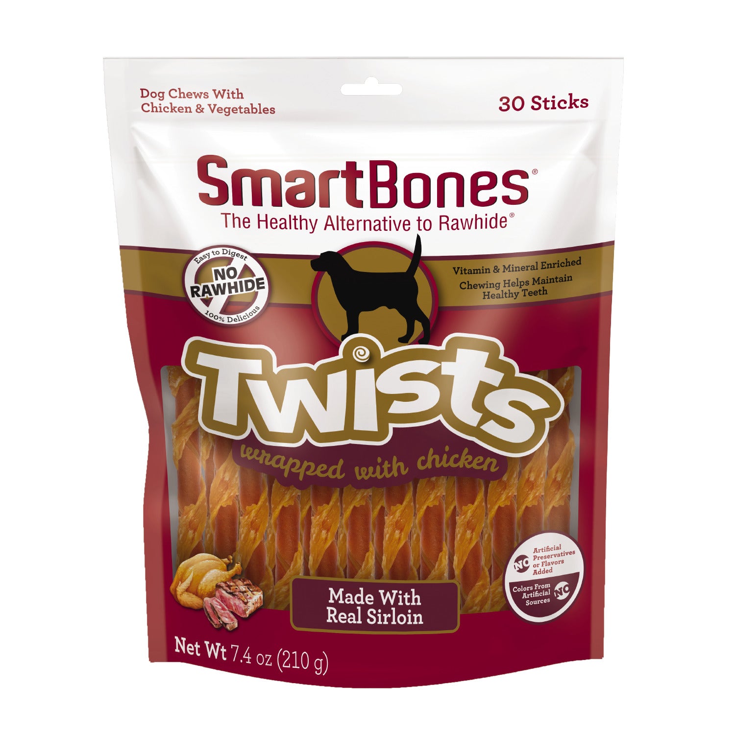 Shop / Unknown Type / SmartBones Sirloin Wrapped Chicken Twist Dog Treats SmartBones Sirloin Wrapped Chicken Twist Dog Treats SmartBones Default Title $14.99 Default Title Purchase Options Free In-Store Pick Up Not Available Save 10% on orders $49+ Set your store for inventory and store pickup details Zip Code Search Same-day Delivery* No minimum charge for delivery orders. *Order before 2pm and have it delivered today. Orders placed after 2pm will be delivered the next day. Must be inside delivery radius. Zip Code Unfortunately delivery is not available to this address. In order to ensure the best availability accuracy, changing your selected store will remove all items from your cart. You will need to re-add these items with your newly selected store if you choose to continue. Continue Cancel Ship it to Me Quantity Add To Cart Feeding guide disclaimer ✕ Feeding guides provide a starting point for the amount of food to give your pet each day. We recommend that you keep your pet in ideal body condition and not allow them to become overweight. The amount of food your pet needs can vary based on age, activity level or other food and treats given, so be sure to work with your veterinarian to determine an appropriate weight for your pet, and to make any necessary adjustments to their feeding. Information Made with Real Sirloin - Made with Real Chicken & Vegetables - Vitamin and Mineral Enriched - No colors from artificial sources - No artificial preservatives or flavors added - Cornstarch, Wheat Flour, Chicken, Glycerin, Pea Flour, Fructose, Beef, Barley Malt Syrup, Gelatin, Yeast Extract, Dried Sweet Potato, Dried Cultured Whey, Dried Carrots, Carrageenan, Sodium Pyrophosphate, Vitamin E Supplement, Ferrous Sulfate, D-Calcium Pantothenate, Carmine (Color), Zinc Sulfate, Manganese Sulfate - Guaranteed Analysis: Crude Protein (min) 16%, Crude Fat (min) 0.5%, Crude Fiber (max) 1.5%, Moisture (max) 20.0%, Manganese (min) 5.0 mg/kg, Vitamin E (min) 80IU/kg Customers also liked Customer Reviews
