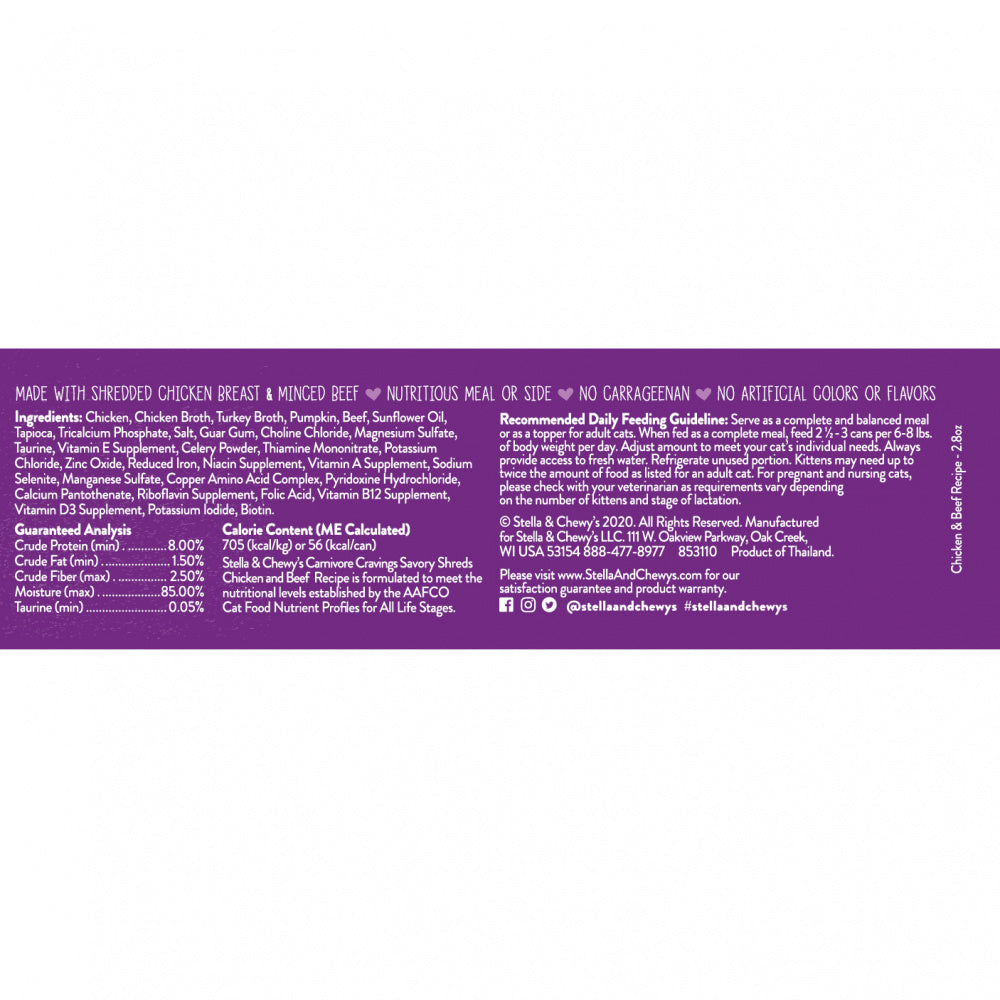 Shop / Unknown Type / Stella & Chewy's Carnivore Cravings Savory Shreds Chicken & Beef Dinner in Broth Wet Cat Food Stella & Chewy's Carnivore Cravings Savory Shreds Chicken & Beef Dinner in Broth Wet Cat Food Stella & Chewy's 5.2 oz ,case of 24 $64.99 5.2 oz ,case of 24 Purchase Options Free In-Store Pick Up Not Available Save 10% on orders $49+ Set your store for inventory and store pickup details Zip Code Search Same-day Delivery* No minimum charge for delivery orders. *Order before 2pm and have it delivered today. Orders placed after 2pm will be delivered the next day. Must be inside delivery radius. Zip Code Unfortunately delivery is not available to this address. In order to ensure the best availability accuracy, changing your selected store will remove all items from your cart. You will need to re-add these items with your newly selected store if you choose to continue. Continue Cancel Ship it to Me Quantity Add To Cart Feeding guide disclaimer ✕ Feeding guides provide a starting point for the amount of food to give your pet each day. We recommend that you keep your pet in ideal body condition and not allow them to become overweight. The amount of food your pet needs can vary based on age, activity level or other food and treats given, so be sure to work with your veterinarian to determine an appropriate weight for your pet, and to make any necessary adjustments to their feeding. Information While Stella & Chewys started as an exclusively raw pet food brand, we have responsibly expanded beyond raw diets over the years. Our wide variety of different products are now more available and able to meet the needs and budgets of all pet parents while still delivering best-in-class nutrition.Shredded muscle meat slowly simmered in a savory high-moisture broth to deliver a special meal even the finickiest of cats will love! Give your cat what they naturally crave with the protein-rich nutrition of Stella & Chewy's Carnivore Cravings Savory Shreds.Why We Love It Great texture real shredded muscle meat in a light meaty broth that provides essential moisture to keep cats hydrated Rich in responsibly sourced animal protein, low in carbs and free from grains, legumes, potatoes, carrageenan, wheat, meat by-products, soy, artificial colors, preservatives and flavors Only 4-6 simple wholesome ingredients with Taurine added to support overall heart health Ingredients Chicken, chicken broth, turkey broth, pumpkin, beef, sunflower oil, tapioca, tricalcium phosphate, salt, guar gum, choline chloride, magnesium sulfate, taurine, vitamin E supplement, celery powder, thiamine mononitrate, potassium chloride, zinc oxide, reduced iron, niacin supplement, vitamin A supplement, sodium selenite, manganese sulfate, copper amino acid complex, pyridoxine hydrochloride, calcium pantothenate, riboflavin supplement, folic acid, vitamin B12 supplement, vitamin D3 supplement, potassium iodide, biotin Guaranteed Analysis Nutrient Guaranteed Units Crude Protein 8% min Crude Fat 1.50% min Crude Fiber 2.50% max Moisture 85% max Customers also liked Customer Reviews