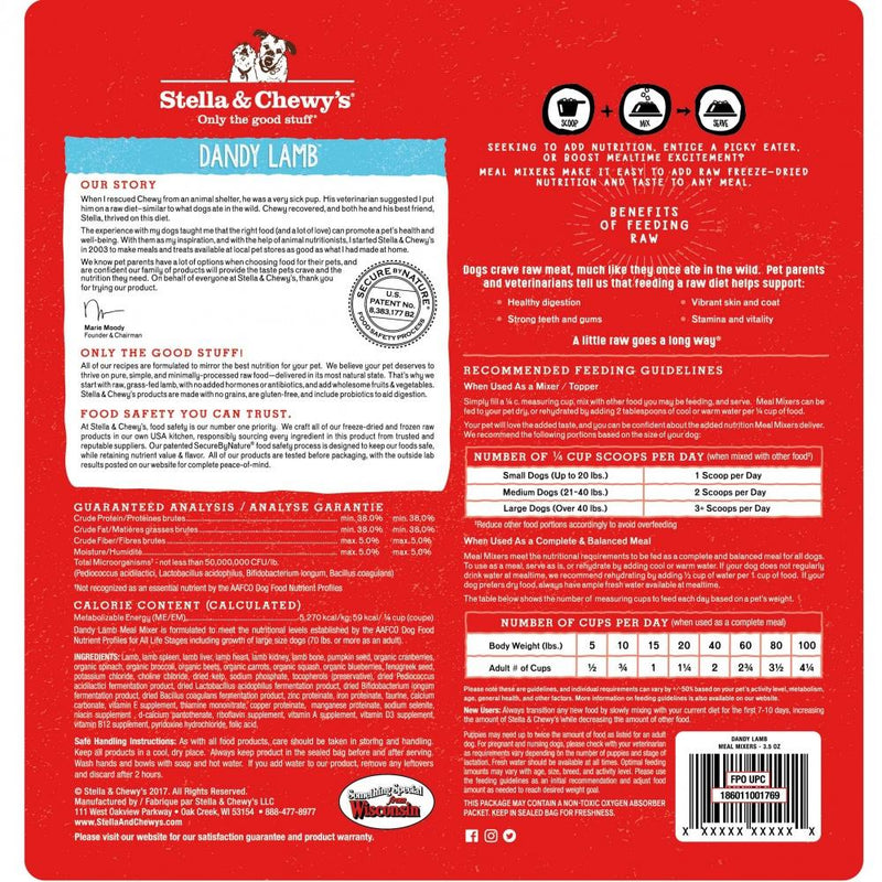 Shop / Grain-Free / Stella & Chewy's Freeze Dried Raw Dandy Lamb Meal Mixers Grain Free Dog Food Topper Stella & Chewy's Freeze Dried Raw Dandy Lamb Meal Mixers Grain Free Dog Food Topper Stella & Chewy's $10.99 3.5 oz 18 oz 3.5-oz 18-oz Purchase Options Free In-Store Pick Up Not Available Save 10% on orders $49+ Set your store for inventory and store pickup details Zip Code Search Same-day Delivery* No minimum charge for delivery orders. *Order before 2pm and have it delivered today. Orders placed after 2pm will be delivered the next day. Must be inside delivery radius. Zip Code Unfortunately delivery is not available to this address. In order to ensure the best availability accuracy, changing your selected store will remove all items from your cart. You will need to re-add these items with your newly selected store if you choose to continue. Continue Cancel Ship it to Me Quantity Add To Cart Feeding guide disclaimer ✕ Feeding guides provide a starting point for the amount of food to give your pet each day. We recommend that you keep your pet in ideal body condition and not allow them to become overweight. The amount of food your pet needs can vary based on age, activity level or other food and treats given, so be sure to work with your veterinarian to determine an appropriate weight for your pet, and to make any necessary adjustments to their feeding. Information Raw, grass-fed lamb 95% lamb, nutrient-rich organs & bone Organic fruits & vegetables Fortified with added vitamins & minerals Enhanced with probiotics & antioxidants No added hormones or antibiotics No grains or fillers No gluten No artificial preservatives or colorings Ingredients Lamb, lamb spleen, lamb liver, lamb heart, lamb kidney, lamb bone, pumpkin seed, organic cranberries, organic spinach, organic broccoli, organic beets, organic carrots, organic squash, organic apples, organic blueberries, potassium chloride, choline chloride, dried kelp, sodium phosphate monobasic, tocopherols (preservative), dried pediococcus acidilactici fermentation product, dried lactobacillus acidophilus fermentation product, dried bifidobacterium longum fermentation product, zinc proteinate, iron proteinate, taurine, calcium carbonate, vitamin E supplement, thiamin mononitrate, copper proteinate, manganese proteinate, sodium selenite, niacin supplement , d-calcium pantothenate, riboflavin supplement, vitamin A supplement, vitamin D3 supplement, vitamin B12 supplement, pyridoxine hydrochloride, folic acid Guaranteed Analysis Nutrient Guaranteed Units Crude Protein 36% min Crude Fat 36% min Crude Fiber 5% max Moisture 5% max Customers also liked Customer Reviews