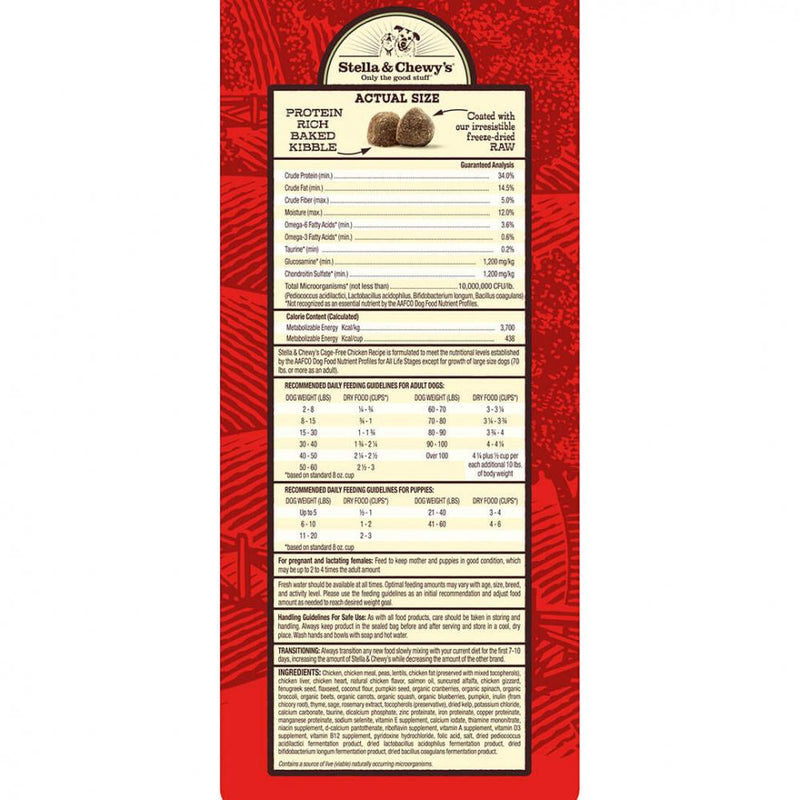 Shop / Dog Food / Stella & Chewy's Raw Coated Kibble Cage Free Chicken Recipe Dry Dog Food Stella & Chewy's Raw Coated Kibble Cage Free Chicken Recipe Dry Dog Food Stella & Chewy's $43.99 10 lb 22 lb 3.5 lb 10-lb 22-lb 3.5-lb Purchase Options Free In-Store Pick Up Not Available Save 10% on orders $49+ Set your store for inventory and store pickup details Zip Code Search Same-day Delivery* No minimum charge for delivery orders. *Order before 2pm and have it delivered today. Orders placed after 2pm will be delivered the next day. Must be inside delivery radius. Zip Code Unfortunately delivery is not available to this address. In order to ensure the best availability accuracy, changing your selected store will remove all items from your cart. You will need to re-add these items with your newly selected store if you choose to continue. Continue Cancel Ship it to Me Quantity Add To Cart Feeding guide disclaimer ✕ Feeding guides provide a starting point for the amount of food to give your pet each day. We recommend that you keep your pet in ideal body condition and not allow them to become overweight. The amount of food your pet needs can vary based on age, activity level or other food and treats given, so be sure to work with your veterinarian to determine an appropriate weight for your pet, and to make any necessary adjustments to their feeding. Information Best-in-class solutions for those pet parents looking for high protein and nutrient dense dog kibble options.Why We Love It Includes only responsibly sourced ingredients like grass-fed beef and organic fruits & veggies Made in Stella & Chewy's own Wisconsin kitchen, with no ingredients from China Added taurine, vitamins and probiotics Each recipe is gently baked and coated in raw goodness About Stella & ChewySince our own Stella and Chewy were introduced to a raw diet and thrived, we have been focused on making the power of raw nutrition more palatable and more convenient for pets and pet parents everywhere. As a company, we do believe raw is the pinnacle of animal nutrition and that any amount of raw in a dog’s diet will have a meaningful and positive impact. We have begun to responsibly expand our brand beyond our raw to make our products more available, yet always delivering best-in-class nutrition that will allow pets to thrive! We are proud to provide a wide line-up of offerings that are unique and special – always using pristine ingredients that are thoughtfully and responsibly sourced which deliver best-in-class nutrition and palatability. Ingredients Chicken, chicken meal, chickpeas, peas, chicken liver, chicken fat (preserved with mixed tocopherols), chicken heart, natural chicken flavor, salmon oil, suncured alfalfa, chicken gizzard, fenugreek seed, flaxseed, coconut oil, pumpkin seed, organic cranberries, organic spinach, organic beets, organic carrots, organic squash, organic blueberries, pumpkin, inulin (from chicory root), thyme, sage, rosemary extract, tocopherols (preservative), dried kelp, taurine, potassium chloride, choline chloride, calcium carbonate, dicalcium phosphate, tricalcium phosphate, sodium phosphate, zinc proteinate, iron proteinate, copper proteinate, manganese proteinate, sodium selenite, vitamin E supplement, thiamine mononitrate, niacin supplement, d-calcium pantothenate, riboflavin supplement, vitamin A supplement, vitamin D3 supplement, vitamin B12 supplement, pyridoxine hydrochloride, folic acid, salt, dried Pediococcus acidilactici fermentation product, dried Lactobacillus acidophilus fermentation product, dried Bifidobacterium longum fermentation product Guaranteed Analysis Nutrient Guaranteed Units Crude Protein 34% min Crude Fat 14.5% min Crude Fiber 5% max Moisture 12% max Omega-6 Fatty Acids 3.6% min Omega-3 Fatty Acids 0.6% min Glucosamine 1,2000 mg/kg min Chondroitin Sulfate 1,200 mg/kg Customers also liked Customer Reviews