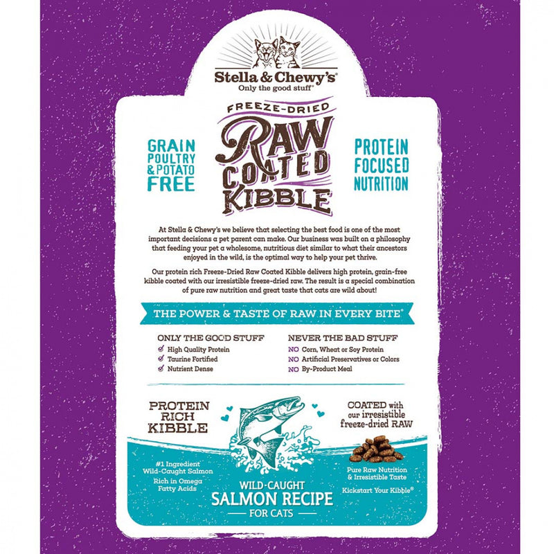 Shop / Cat Food / Stella & Chewy's Raw Coated Kibble Wild Caught Salmon Recipe Dry Cat Food Stella & Chewy's Raw Coated Kibble Wild Caught Salmon Recipe Dry Cat Food Stella & Chewy's $14.99 2.5 lb 5 lb 10 lb 2.5-lb 5-lb 10-lb Purchase Options Free In-Store Pick Up Not Available Save 10% on orders $49+ Set your store for inventory and store pickup details Zip Code Search Same-day Delivery* No minimum charge for delivery orders. *Order before 2pm and have it delivered today. Orders placed after 2pm will be delivered the next day. Must be inside delivery radius. Zip Code Unfortunately delivery is not available to this address. In order to ensure the best availability accuracy, changing your selected store will remove all items from your cart. You will need to re-add these items with your newly selected store if you choose to continue. Continue Cancel Ship it to Me Quantity Add To Cart Feeding guide disclaimer ✕ Feeding guides provide a starting point for the amount of food to give your pet each day. We recommend that you keep your pet in ideal body condition and not allow them to become overweight. The amount of food your pet needs can vary based on age, activity level or other food and treats given, so be sure to work with your veterinarian to determine an appropriate weight for your pet, and to make any necessary adjustments to their feeding. Information Raw Coated Kibble for cats delivers super-premium, high-protein, grain-free meals. Each recipe is carefully coated with our irresistible freeze-dried raw, for unmatched nutrition and taste!Why We Love It Responsibly sourced animal proteins (cage-free & wild-caught) Meat #1 ingredient, 65%-70% animal protein Made in the USA with no ingredients from China Grain-free, potato-free, low carb diet + taurine fortified Guaranteed probiotics for optimal digestion + rich in omega fatty acids for healthy skin and coat About Stella & ChewySince our own Stella and Chewy were introduced to a raw diet and thrived, we have been focused on making the power of raw nutrition more palatable and more convenient for pets and pet parents everywhere. As a company, we do believe raw is the pinnacle of animal nutrition and that any amount of raw in a dog’s diet will have a meaningful and positive impact. We have begun to responsibly expand our brand beyond our raw to make our products more available, yet always delivering best-in-class nutrition that will allow pets to thrive! We are proud to provide a wide line-up of offerings that are unique and special – always using pristine ingredients that are thoughtfully and responsibly sourced which deliver best-in-class nutrition and palatability. Ingredients Salmon, ocean fish meal, lentils, chickpeas, peas, sunflower oil (preserved with mixed tocopherols), natural vegetable flavor, salmon meal, cod, fenugreek seed, sun-cured alfalfa meal, dandelion greens, cod liver oil, taurine, choline chloride, tocopherols (preservative), yucca schidigera extract, thyme, rosemary, sage, cranberries, zinc proteinate, iron proteinate, copper proteinate, manganese proteinate, sodium selenite, vitamin E supplement, calcium iodate, magnesium proteinate, thiamine mononitrate, niacin supplement, d-calcium pantothenate, riboflavin supplement, vitamin A supplement, vitamin D3 supplement, vitamin B12 supplement, pyridoxine hydrochloride, biotin, folic acid, salt, dried Pediococcus acidilactici fermentation product, dried Lactobacillus acidophilus fermentation product, dried Bifidobacterium longum fermentation product, dried Bacillus coagulans fermentation product Guaranteed Analysis Nutrient Guaranteed Units Crude Protein 36% min Crude Fat 14% min Crude Fiber 4% min Moisture 12% max Customers also liked Customer Reviews