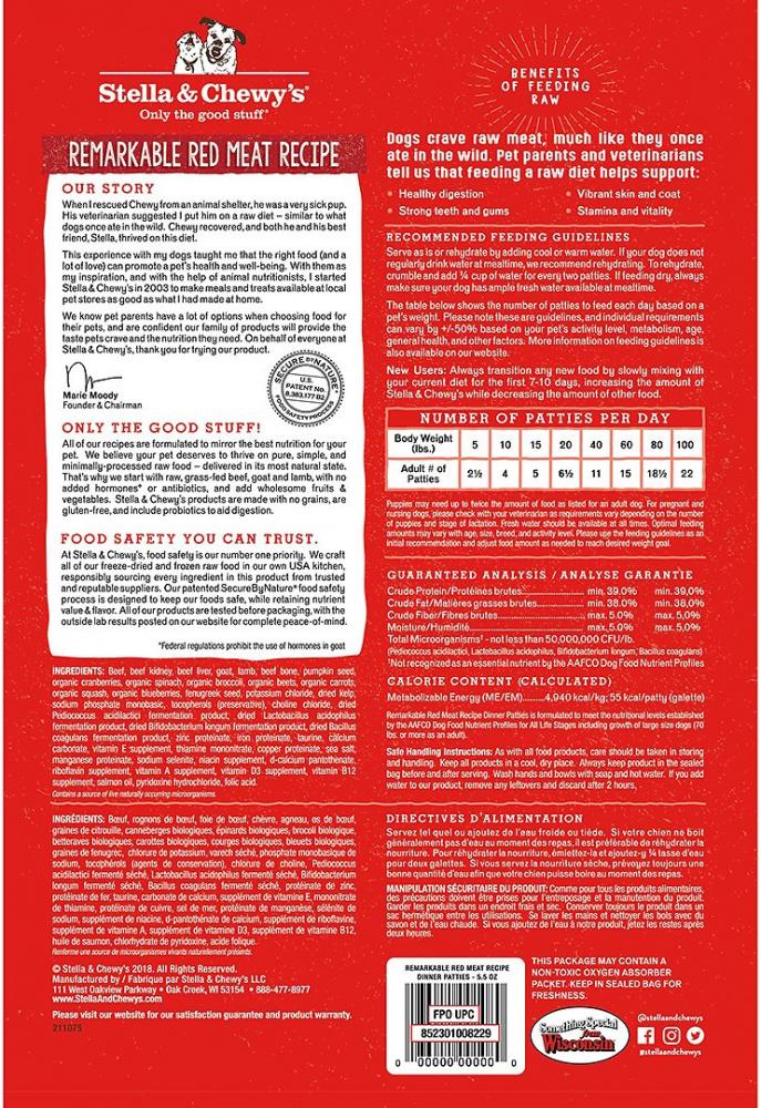 Shop / Dog Food / Stella & Chewy's Remarkable Raw Red Meat Recipe Freeze Dried Dinner Patties Dog Food Stella & Chewy's Remarkable Raw Red Meat Recipe Freeze Dried Dinner Patties Dog Food Stella & Chewy's $35.99 5.5 oz 14 oz 5.5-oz 14-oz Purchase Options Free In-Store Pick Up Not Available Save 10% on orders $49+ Set your store for inventory and store pickup details Zip Code Search Same-day Delivery* No minimum charge for delivery orders. *Order before 2pm and have it delivered today. Orders placed after 2pm will be delivered the next day. Must be inside delivery radius. Zip Code Unfortunately delivery is not available to this address. In order to ensure the best availability accuracy, changing your selected store will remove all items from your cart. You will need to re-add these items with your newly selected store if you choose to continue. Continue Cancel Ship it to Me Quantity Add To Cart Feeding guide disclaimer ✕ Feeding guides provide a starting point for the amount of food to give your pet each day. We recommend that you keep your pet in ideal body condition and not allow them to become overweight. The amount of food your pet needs can vary based on age, activity level or other food and treats given, so be sure to work with your veterinarian to determine an appropriate weight for your pet, and to make any necessary adjustments to their feeding. Information Every pet parent wants wholesome, natural nutrition for their pet. Stella & Chewy's raw diets focus on pure ingredients and raw protein so you can feed them as nature intended. Each protein is grass-fed, cage-free or wild caught to guarantee your pet is eating as nature intended. All of the produce in our recipes are 100% organic certified, grown by farmers we trust. Our all-natural recipes are crafted with care in our own USA kitchen to provide the highest levels of protein rich meat and quality grain-free nutrition for your pet, as if they were in the wild. In the Stella & Chewy's kitchen, we take time to craft each recipe in small batches from the world's finest ingredients. All of our ingredients are responsibly sourced, and never from China. Serve as is or rehydrate by adding cool or warm water. If your dog does not drink plenty of water at mealtime, we recommend rehydrating. To rehydrate, crumble and add 1/4 cup of water for every two patties. When feeding dry, always make sure your dog drinks ample fresh water at mealtime. The table below shows the number of patties to feed each day based on a pet's weight. Please note these are guidelines, and individual requirements can vary by +/-50% based on your pet's activity level, metabolism, age, general health and other factors. Up to 5 lbs: 2-1/2 patties per day 6 to 10 lbs: 4 patties per day 11 to 15 lbs: 5 patties per day 16 to 20 lbs: 6-1/2 patties per day 21 to 40 lbs: 11 patties per day 41 to 60 lbs: 15 patties per day 61 to 80 lbs: 18-1/2 patties per day 81 to 100 lbs: 22 patties per day Why We Love It Only the good stuff! Dogs naturally crave meat, much like they ate in the wild. That's why every batch of Remarkable Red Meat Recipe Dinner Patties starts with 95% beef, goat and lamb (all grass-fed!), organs and bone plus 100% organic certified fruits and vegetables to guarantee your pet is eating as nature intended. All ingredients are responsibly sourced, and never from China Made in the USA - Remarkable Red Meat Recipe Dinner Patties’ all-natural recipe is crafted with care in small batches in Stella & Chewy’s own USA kitchen to provide the highest levels of protein-rich meat and quality grain-free nutrition for your pet Minimally processed and all natural. Because the closer foods stay to their natural state, the better they are. That's why each of Stella & Chewy's recipes contains no added hormones, antibiotics, grains or fillers. Best of all, it's 100% complete and balanced for all life stages Supports better health for your pet with improved appetite and digestion, relief from allergies, vibrant skin and coat, healthy teeth and gums, greater stamina and vitality and a healthy immune system About Stella & Chewys16 years ago our founder, Marie Moody, inspired by her own dog’s speedy recovery on a raw diet, launched Stella & Chewy’s. Our diets and offerings have expanded but we have always been focused on delivering best-in-class nutrition! Ingredients Beef, beef kidney, beef liver, goat, lamb, beef bone, pumpkin seed, organic cranberries, organic spinach, organic broccoli, organic beets, organic carrots, organic squash, organic blueberries, fenugreek seed, potassium chloride, dried kelp, sodium phosphate monobasic, tocopherols (preservative), choline chloride, dried Pediococcus acidilactici fermentation product, dried Lactobacillus acidophilus fermentation product, dried Bifidobacterium longum fermentation product, dried Bacillus coagulans fermentation product, zinc proteinate, iron proteinate, taurine, calcium carbonate, vitamin E supplement, thiamine mononitrate, copper proteinate, sea salt, manganese proteinate, sodium selenite, niacin supplement, d-calcium pantothenate, riboflavin supplement, vitamin A supplement, vitamin D3 supplement, vitamin B12 supplement, salmon oil, pyridoxine hydrochloride, folic acid. Guaranteed Analysis Nutrient Guaranteed Units Crude Protein 39% min Crude Fat 38% min Crude Fiber 5% max Moisture 5% max Microorganisms 50,000,000 CFU/oz min Customers also liked Customer Reviews