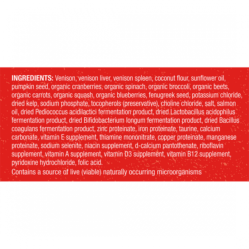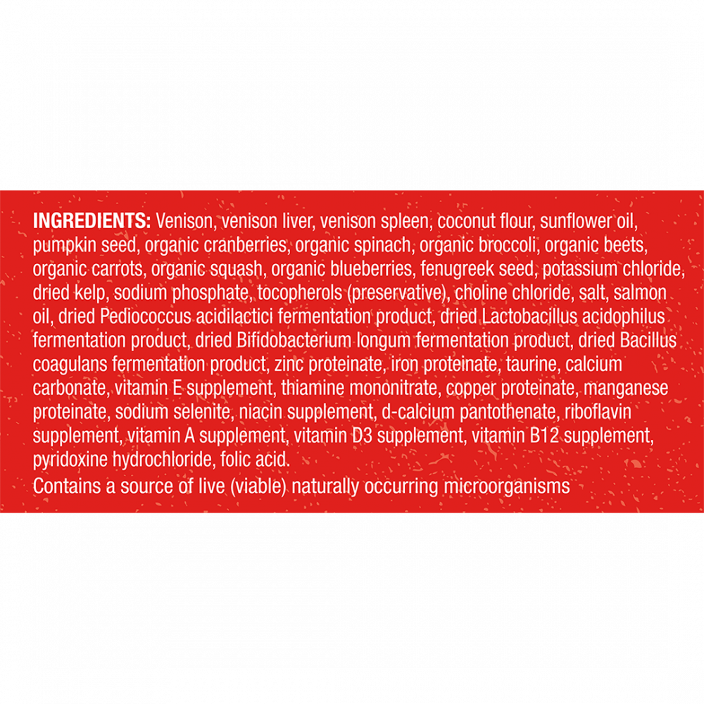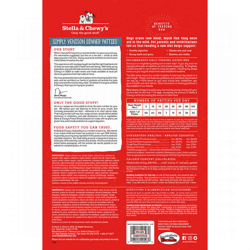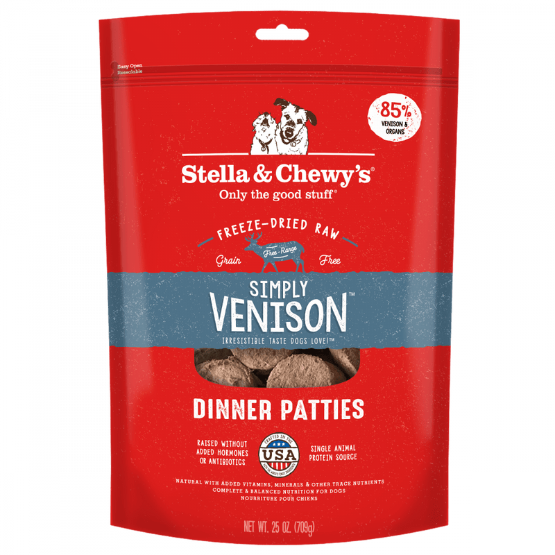Shop / Dog Food / Stella & Chewy's Simply Venison Freeze-Dried Raw Patties Dog Food Stella & Chewy's Simply Venison Freeze-Dried Raw Patties Dog Food Stella & Chewy's Weight: 14 oz $48.99 14-oz Purchase Options Free In-Store Pick Up Not Available Save 10% on orders $49+ Set your store for inventory and store pickup details Zip Code Search Same-day Delivery* No minimum charge for delivery orders. *Order before 2pm and have it delivered today. Orders placed after 2pm will be delivered the next day. Must be inside delivery radius. Zip Code Unfortunately delivery is not available to this address. In order to ensure the best availability accuracy, changing your selected store will remove all items from your cart. You will need to re-add these items with your newly selected store if you choose to continue. Continue Cancel Ship it to Me Quantity Add To Cart Feeding guide disclaimer ✕ Feeding guides provide a starting point for the amount of food to give your pet each day. We recommend that you keep your pet in ideal body condition and not allow them to become overweight. The amount of food your pet needs can vary based on age, activity level or other food and treats given, so be sure to work with your veterinarian to determine an appropriate weight for your pet, and to make any necessary adjustments to their feeding. Information Every pet parent wants wholesome, natural nutrition for their pet. Stella & Chewy's raw diets focus on pure ingredients and raw protein so you can feed them as nature intended. At Stella & Chewy's, we believe that pure raw nutrition fed in its natural state is the best way to help your pet thrive. Our limited ingredient recipes are simple and pure. Each batch starts with 85% or more meat, organs and bone and is often a single source of animal protein, the perfect solution for pets with food sensitivities. Each protein is grass-fed, cage-free or wild caught to guarantee your pet is eating as nature intended. All of the produce in our recipes are 100% organic certified, grown by farmers we trust. Our all-natural recipes are crafted with care in our own USA kitchen to provide the highest levels of protein-rich meat and quality grain-free nutrition for your pet, as if they were in the wild. In the Stella & Chewy's kitchen, we take time to craft each recipe in small batches from the world's finest ingredients. All of our ingredients are responsibly sourced, and never from China.Why We Love It Only the good stuff! Dogs naturally crave meat, much like they ate in the wild. That's why every batch of Simply Venison Dinner Patties starts with 85% venison and organs plus 100% organic certified fruits and vegetables to guarantee your pet is eating as nature intended. All ingredients are responsibly sourced, and never from China Made in the USA - Simply Venison Dinner Patties’ all-natural recipe is crafted with care in small batches in Stella & Chewy’s own USA kitchen to provide the highest levels of protein-rich meat and quality grain-free nutrition for your pet Minimally processed and all natural. Because the closer foods stay to their natural state, the better they are. That's why each of Stella & Chewy's recipes contains no added hormones, antibiotics, grains or fillers. Best of all, it's 100% complete and balanced for all life stages Raw nutrition and convenience - your pet deserves to thrive on real, raw meat. Now Stella & Chewy's makes it easier than ever to give your pet real raw nutrition with the convenience of freeze-dried Supports better health for your pet with improved appetite and digestion, relief from allergies, vibrant skin and coat, healthy teeth and gums, greater stamina and vitality and a healthy immune system About Stella & Chewy'sAt Stella & Chewy’s, we believe that selecting the best food is one of the most important decisions a pet parent makes. From our first delivery to the last batch crafted in our own USA kitchen, we are focused on making the highest quality pet food available. Ingredients Venison, venison liver, venison spleen, coconut flour, sunflower oil, pumpkin seed, organic cranberries, organic spinach, organic broccoli, organic beets, organic carrots, organic squash, organic blueberries, fenugreek seed, potassium chloride, dried kelp, sodium phosphate, tocopherols (preservative), choline chloride, salt, salmon oil, dried Pediococcus acidilactici fermentation product, dried Lactobacillus acidophilus fermentation product, dried Bifidobacterium longum fermentation product, dried Bacillus coagulans fermentation product, zinc proteinate, iron proteinate, taurine, calcium carbonate, vitamin E supplement, thiamine mononitrate, copper proteinate, manganese proteinate, sodium selenite, niacin supplement, d-calcium pantothenate, riboflavin supplement, vitamin A supplement, vitamin D3 supplement, vitamin B12 supplement, pyridoxine hydrochloride, folic acid. Customers also liked Customer Reviews