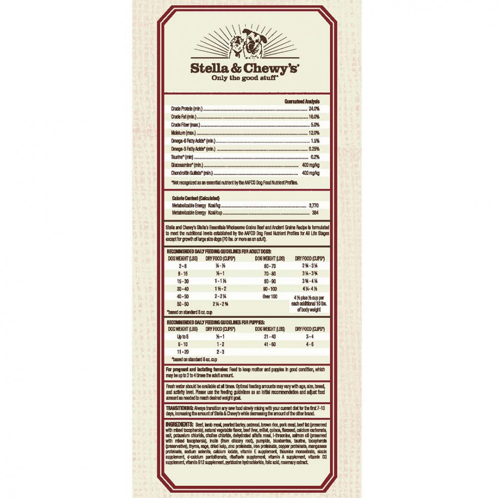Shop / Dog Food / Stella & Chewy's Stella's Essentials Kibble Grass Fed Beef & Wholesome Grains Recipe Dry Dog Food Stella & Chewy's Stella's Essentials Kibble Grass Fed Beef & Wholesome Grains Recipe Dry Dog Food Stella & Chewy's Weight: 25 lb $68.99 25-lb Purchase Options Free In-Store Pick Up Not Available Save 10% on orders $49+ Set your store for inventory and store pickup details Zip Code Search Same-day Delivery* No minimum charge for delivery orders. *Order before 2pm and have it delivered today. Orders placed after 2pm will be delivered the next day. Must be inside delivery radius. Zip Code Unfortunately delivery is not available to this address. In order to ensure the best availability accuracy, changing your selected store will remove all items from your cart. You will need to re-add these items with your newly selected store if you choose to continue. Continue Cancel Ship it to Me Quantity Add To Cart Feeding guide disclaimer ✕ Feeding guides provide a starting point for the amount of food to give your pet each day. We recommend that you keep your pet in ideal body condition and not allow them to become overweight. The amount of food your pet needs can vary based on age, activity level or other food and treats given, so be sure to work with your veterinarian to determine an appropriate weight for your pet, and to make any necessary adjustments to their feeding. Information Best-in-class solutions for those pet parents looking for high protein and nutrient dense dog kibble options.Why We Love It Pea-free, lentil-free & potato-free Wholesome grains including brown rice, pearled barley, oatmeal, quinoa and millet Made in Stella & Chewy's own Wisconsin kitchen, with no ingredients from China Guaranteed taurine levels About Stella & ChewySince our own Stella and Chewy were introduced to a raw diet and thrived, we have been focused on making the power of raw nutrition more palatable and more convenient for pets and pet parents everywhere. As a company, we do believe raw is the pinnacle of animal nutrition and that any amount of raw in a dog’s diet will have a meaningful and positive impact. We have begun to responsibly expand our brand beyond our raw to make our products more available, yet always delivering best-in-class nutrition that will allow pets to thrive! We are proud to provide a wide line-up of offerings that are unique and special – always using pristine ingredients that are thoughtfully and responsibly sourced which deliver best-in-class nutrition and palatability. Ingredients Beef, lamb meal, pearled barley, oatmeal, brown rice, pork meal, beef fat (preserved with mixed tocopherols), natural vegetable flavor, beef liver, millet, quinoa, flaxseed, calcium carbonate, salt, potassium chloride, choline chloride, dehydrated alfalfa meal, l-threonine, salmon oil (preserved with mixed tocopherols), inulin (from chicory root), pumpkin, blueberries, taurine, tocopherols (preservative), thyme, sage, dried kelp, zinc proteinate, iron proteinate, copper proteinate, manganese proteinate, sodium selenite, calcium iodate, vitamin E supplement, thiamine mononitrate, niacin supplement, d-calcium pantothenate, riboflavin supplement, vitamin A supplement, vitamin D3 supplement, vitamin B12 supplement, pyridoxine hydrochloride, folic acid, rosemary extract. Guaranteed Analysis Nutrient Guaranteed Units Crude Protein 24% min Crude Fat 16% min Crude Fiber 5% min Moisture 12% max Customers also liked Customer Reviews