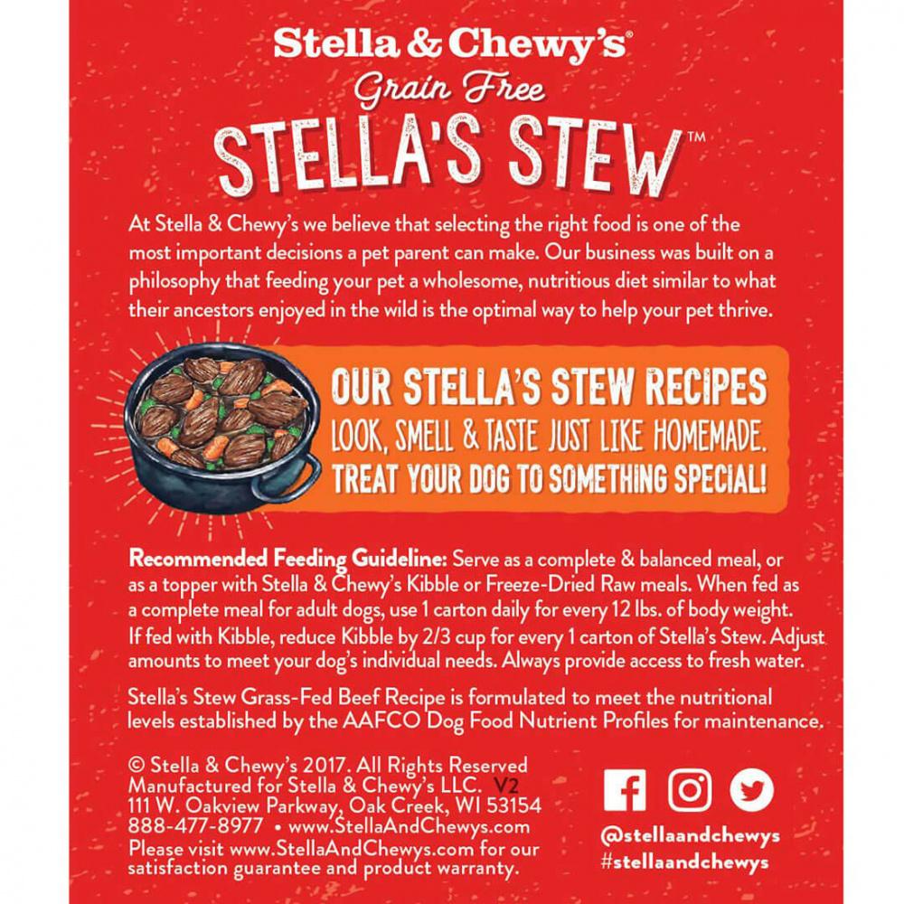 Shop / Unknown Type / Stella & Chewy's Stella's Stew Grass Fed Beef Recipe Food Topper for Dogs Stella & Chewy's Stella's Stew Grass Fed Beef Recipe Food Topper for Dogs Stella & Chewy's Weight: 11 oz $3.99 11-oz Purchase Options Free In-Store Pick Up Not Available Save 10% on orders $49+ Set your store for inventory and store pickup details Zip Code Search Same-day Delivery* No minimum charge for delivery orders. *Order before 2pm and have it delivered today. Orders placed after 2pm will be delivered the next day. Must be inside delivery radius. Zip Code Unfortunately delivery is not available to this address. In order to ensure the best availability accuracy, changing your selected store will remove all items from your cart. You will need to re-add these items with your newly selected store if you choose to continue. Continue Cancel Ship it to Me Quantity Add To Cart Feeding guide disclaimer ✕ Feeding guides provide a starting point for the amount of food to give your pet each day. We recommend that you keep your pet in ideal body condition and not allow them to become overweight. The amount of food your pet needs can vary based on age, activity level or other food and treats given, so be sure to work with your veterinarian to determine an appropriate weight for your pet, and to make any necessary adjustments to their feeding. Information Human-grade complete and balanced wet food for dogs!Why We Love It Real whole muscle meat and organic fresh-cut vegetables All our diets are 100% human-grade Pet safe: Free from garlic and onions Meat #1 ingredient and bone broth #2 Pea-free, lentil-free, grain-free & gluten-free About Stella & ChewySince our own Stella and Chewy were introduced to a raw diet and thrived, we have been focused on making the power of raw nutrition more palatable and more convenient for pets and pet parents everywhere. As a company, we do believe raw is the pinnacle of animal nutrition and that any amount of raw in a dog’s diet will have a meaningful and positive impact. We have begun to responsibly expand our brand beyond our raw to make our products more available, yet always delivering best-in-class nutrition that will allow pets to thrive! We are proud to provide a wide line-up of offerings that are unique and special – always using pristine ingredients that are thoughtfully and responsibly sourced which deliver best-in-class nutrition and palatability. Ingredients Beef, beef bone broth, organic carrots, tapioca starch, organic kale, tricalcium phosphate, calcium carbonate, potato starch, salt, potassium chloride, choline chloride, dried kelp, minerals (zinc proteinate, iron proteinate, magnesium proteinate, copper proteinate, manganese proteinate, selenium yeast), vitamins (vitamin A supplement, vitamin D3 supplement, vitamin E supplement, niacin supplement, d-calcium pantothenate, riboflavin supplement, thiamine mononitrate, pyridoxine hydrochloride, biotin, vitamin B12 supplement, folic acid). Guaranteed Analysis Nutrient Guaranteed Units Crude Protein 9% min Crude Fat 2.50% min Crude Fiber 1.50% max Moisture 82% max Customers also liked Customer Reviews
