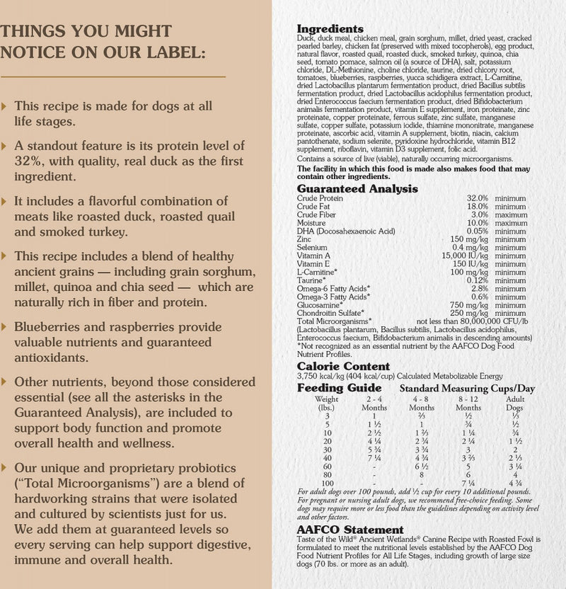 Shop / Dog Food / Taste of the Wild Ancient Wetlands with Ancient Grains Dry Dog Food Taste of the Wild Ancient Wetlands with Ancient Grains Dry Dog Food Taste Of The Wild $38.99 14 lb 28 lb 14-lb 28-lb Purchase Options Free In-Store Pick Up Not Available Save 10% on orders $49+ Set your store for inventory and store pickup details Zip Code Search Same-day Delivery* No minimum charge for delivery orders. *Order before 2pm and have it delivered today. Orders placed after 2pm will be delivered the next day. Must be inside delivery radius. Zip Code Unfortunately delivery is not available to this address. In order to ensure the best availability accuracy, changing your selected store will remove all items from your cart. You will need to re-add these items with your newly selected store if you choose to continue. Continue Cancel Ship it to Me Quantity Add To Cart Feeding guide disclaimer ✕ Feeding guides provide a starting point for the amount of food to give your pet each day. We recommend that you keep your pet in ideal body condition and not allow them to become overweight. The amount of food your pet needs can vary based on age, activity level or other food and treats given, so be sure to work with your veterinarian to determine an appropriate weight for your pet, and to make any necessary adjustments to their feeding. Information Roasted quail, roasted duck and smoke-flavored turkey combine for a diet rich in highly digestible protein and a taste your dog craves. Ancient grains provide an additional source of protein, fiber and other essential nutrients. Ingredients Duck, duck meal, chicken meal, grain sorghum, millet, dried yeast, cracked pearled barley, chicken fat (preserved with mixed tocopherols), egg product, natural flavor, roasted quail, roasted duck, smoke-flavored turkey, quinoa, chia seed, tomato pomace, salmon oil (a source of DHA), salt, potassium chloride, DL-Methionine, choline chloride, taurine, dried chicory root, tomatoes, blueberries, raspberries, yucca schidigera extract, L-Carnitine, dried Lactobacillus plantarum fermentation product, dried Bacillus subtilis fermentation product, dried Lactobacillus acidophilus fermentation product, dried Enterococcus faecium fermentation product, dried Bifidobacterium animalis fermentation product, vitamin E supplement, iron proteinate, zinc proteinate, copper proteinate, ferrous sulfate, zinc sulfate, manganese sulfate, copper sulfate, potassium iodide, thiamine mononitrate, manganese proteinate, ascorbic acid, vitamin A supplement, biotin, niacin, calcium pantothenate, sodium selenite, pyridoxine hydrochloride, vitamin B12 supplement, riboflavin, vitamin D3 supplement, folic acid. Contains a source of live (viable), naturally occurring microorganisms. The facility in which this food is made also makes food that may contain other ingredients. Guaranteed Analysis Nutrient Guaranteed Units Crude Protein 32% min Crude Fat 18% min Crude Fiber 3% max Moisture 10% max DHA .05% min Zinc 15,000 IU/kg min Selenium 0.4 mg/kg min Vitamin A 10,000 IU/kg mini Vitamin E 150 IU/kg min L-Carnitine 100 mg/kg mini Taurine 0.12% min Omega-6 Fatty Acids 2.8% min Omega-3 Fatty Acids .6% min Glucosamine 750 mg/kg min Total Microorganisms 80,000,000 CFU/lb Customers also liked Customer Reviews